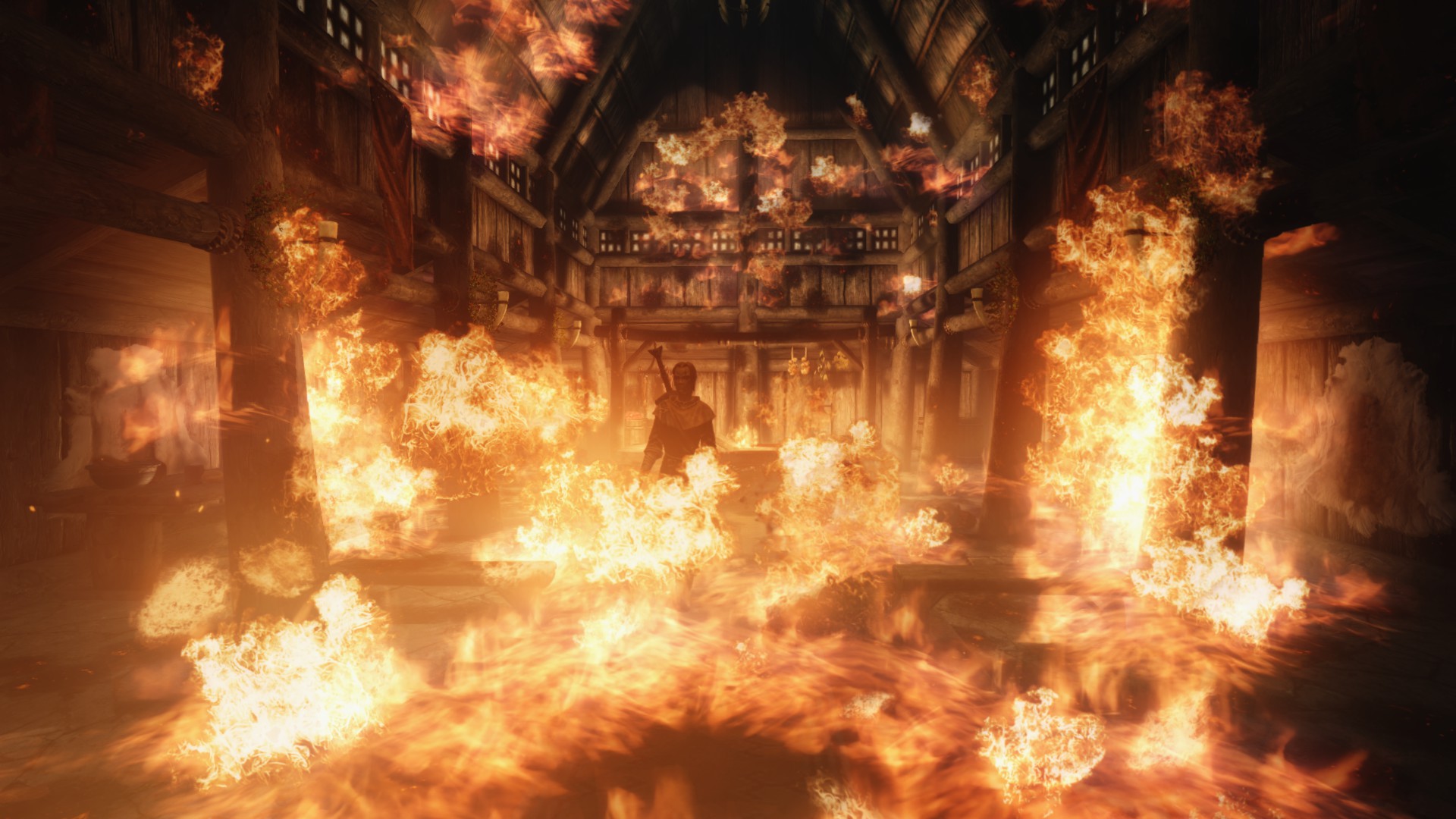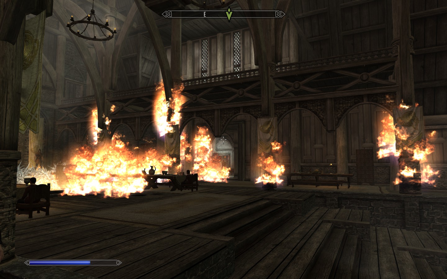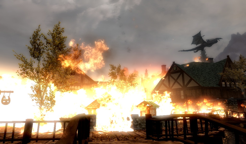 Огонь очень опасен для игрока и не столь опасен для неигровых персонажей. Большинство типов огня не причинят вреда неигровым персонажам, если они не находятся в бою или не враждебны к игроку, кроме того, неигровые персонажи вообще не обращают никакого внимания на огонь. Также огонь не способен навредить драконам.