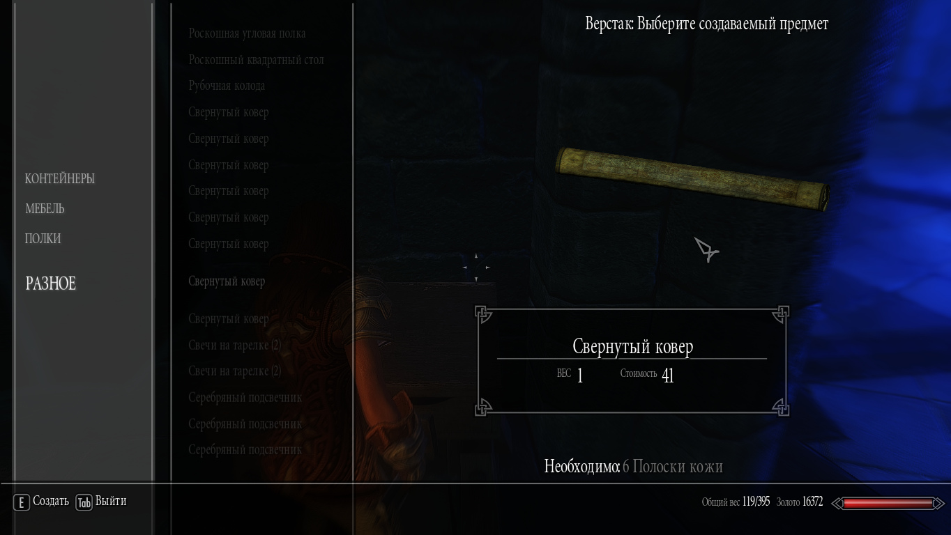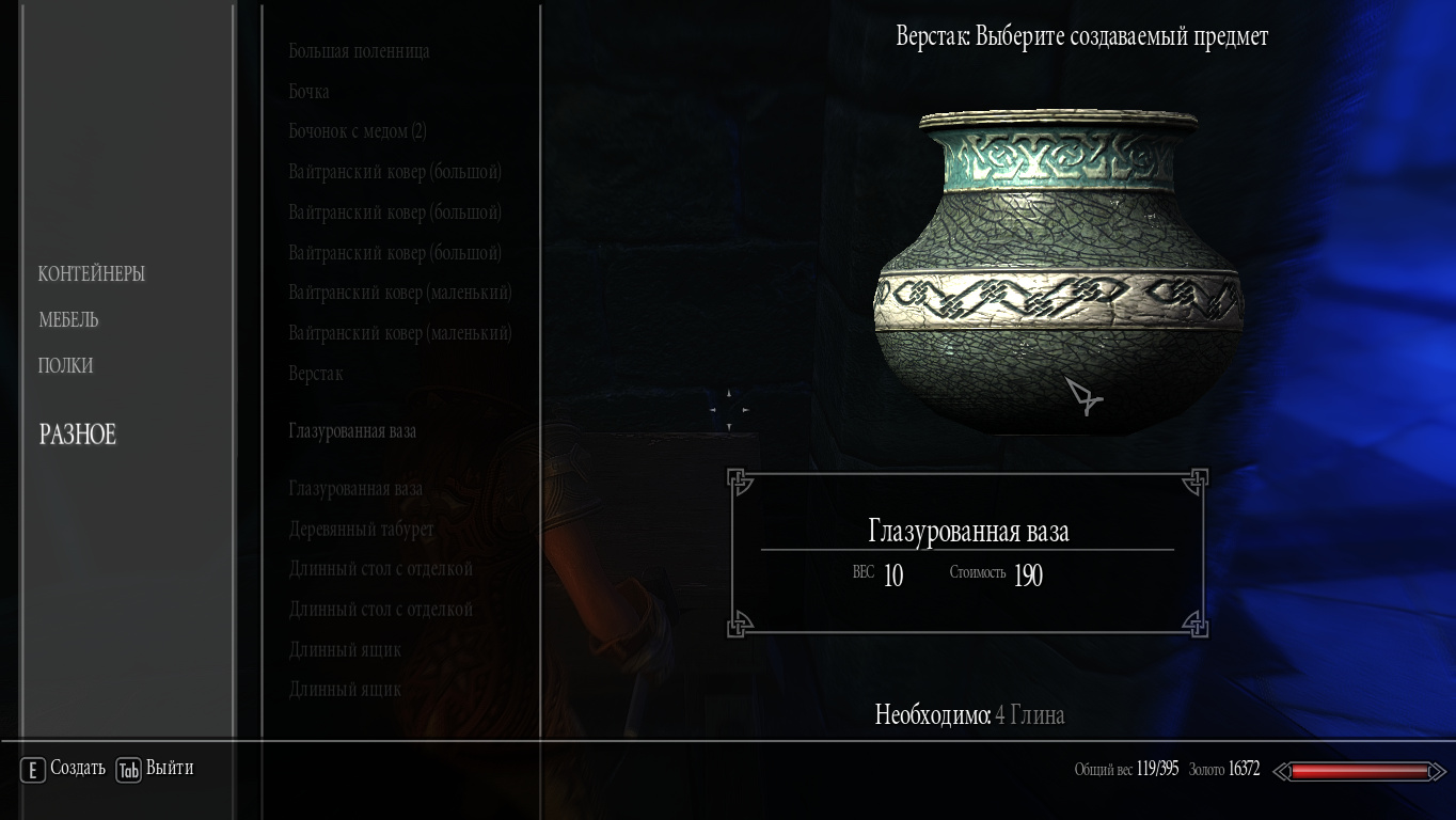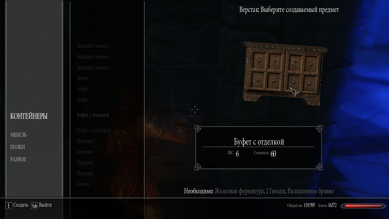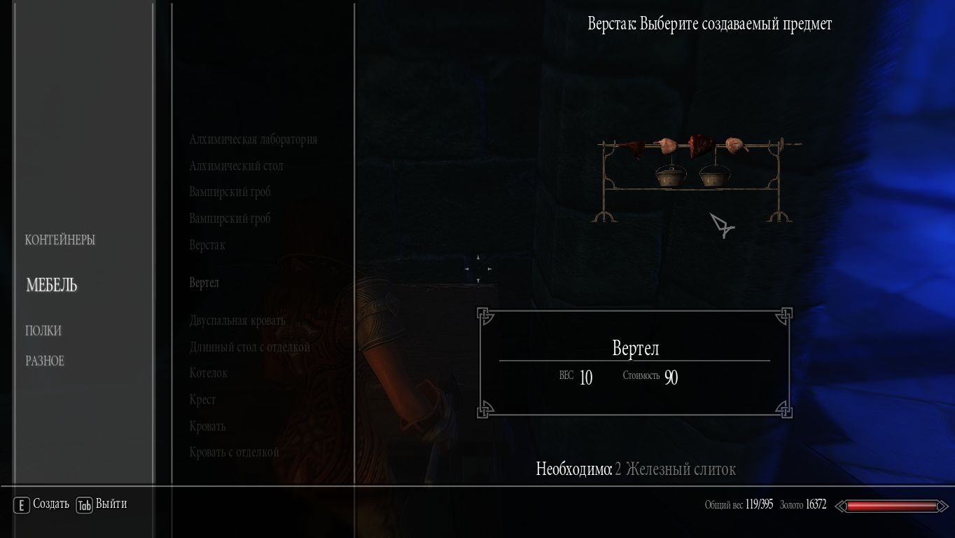 ОПЦИОНАЛЬНО доступен дополнительный мод, требующий установки основного мода и установленного DLC Hearthfire. Он позволяет создавать массу предметов (в том числе и сам плотничий верстак) при помощи любого плотничьего верстака в любом доме из Hearthfire. Сам верстак можно создать и поставить в любом месте, а потом на нём же создавать предметы.