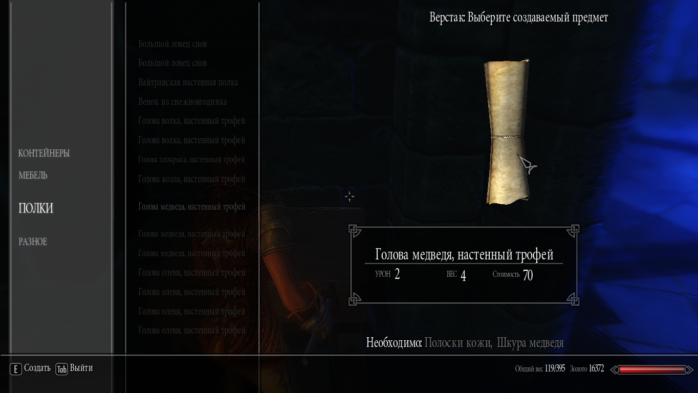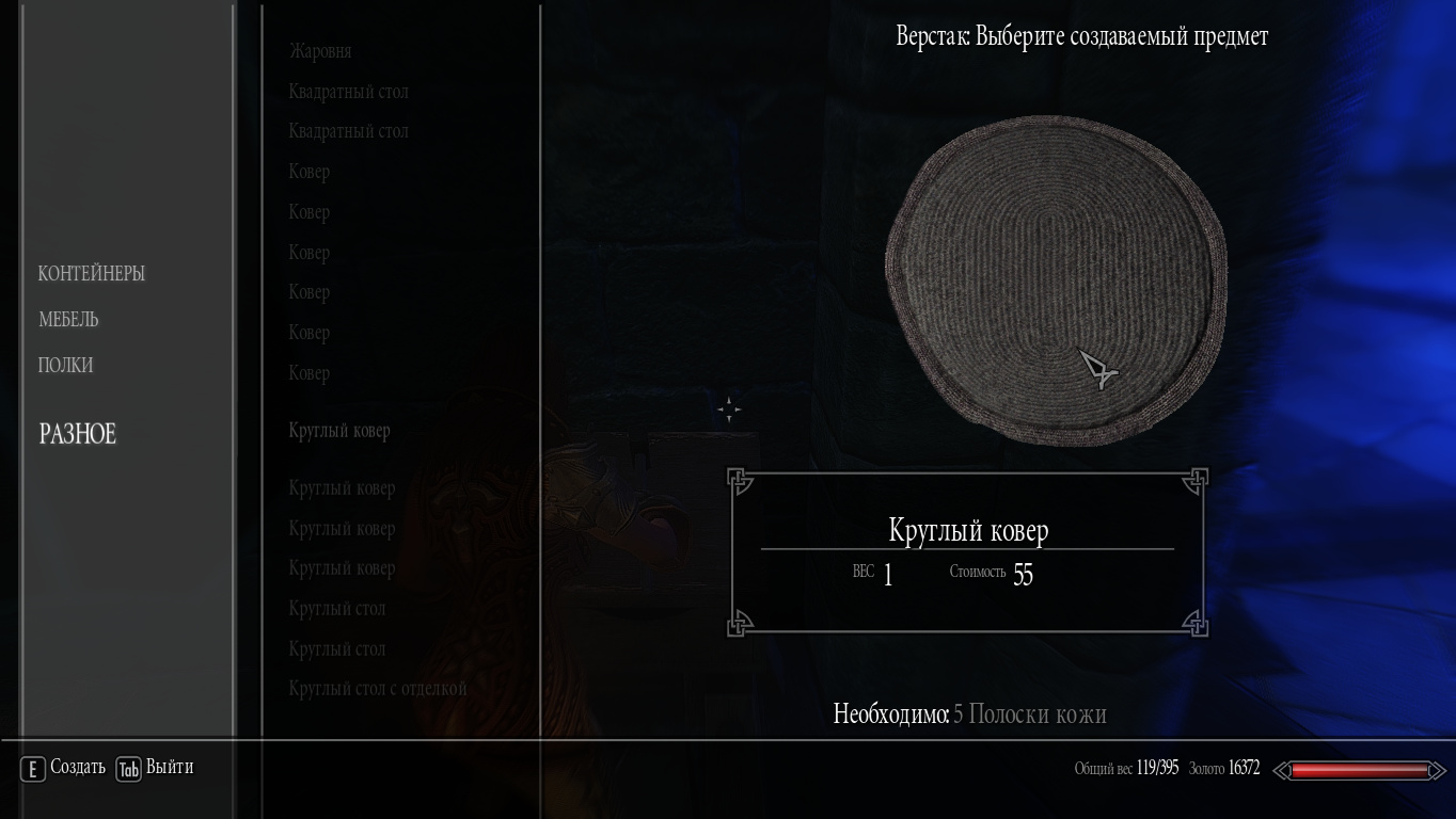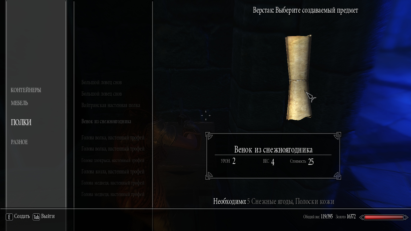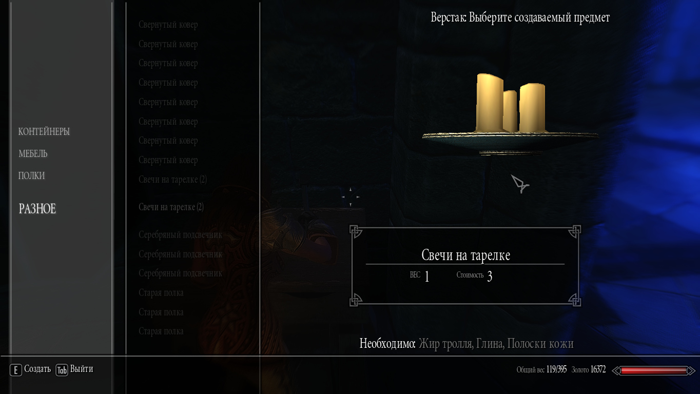 ОПЦИОНАЛЬНО доступен дополнительный мод, требующий установки основного мода и установленного DLC Hearthfire. Он позволяет создавать массу предметов (в том числе и сам плотничий верстак) при помощи любого плотничьего верстака в любом доме из Hearthfire. Сам верстак можно создать и поставить в любом месте, а потом на нём же создавать предметы.