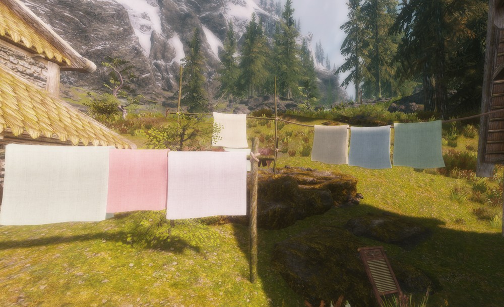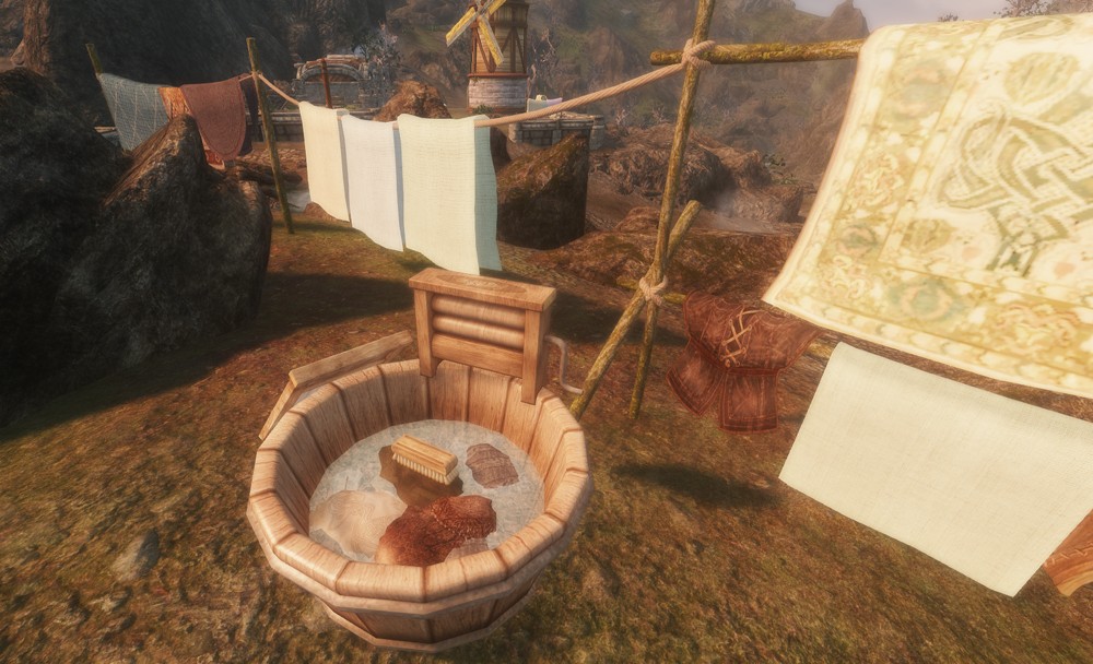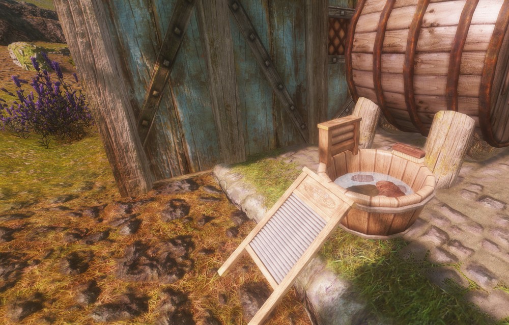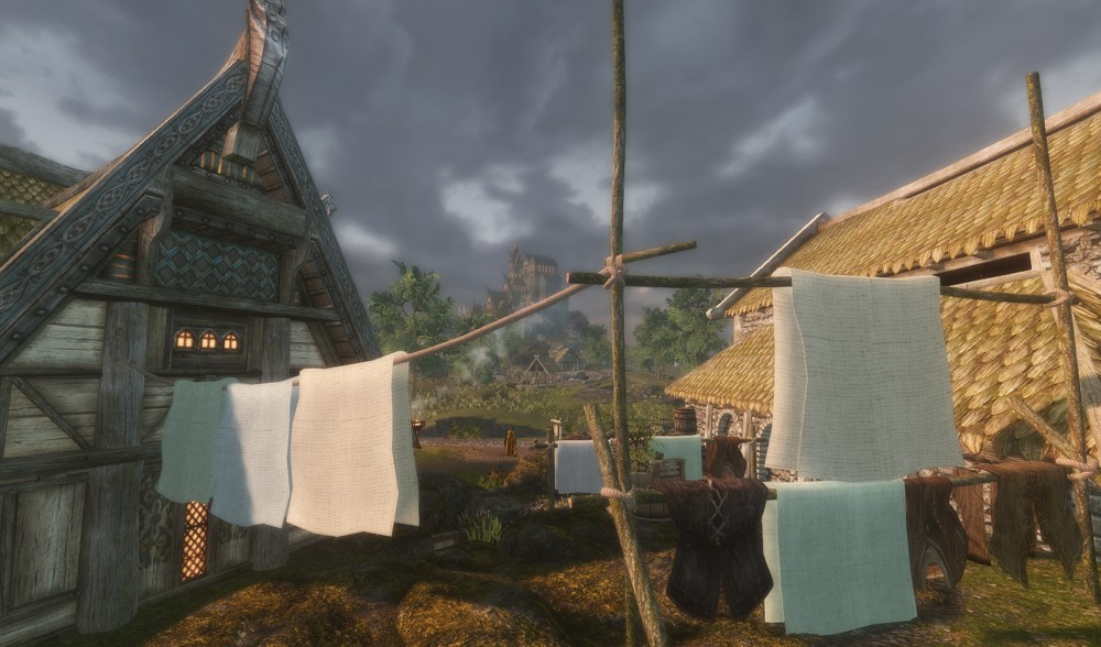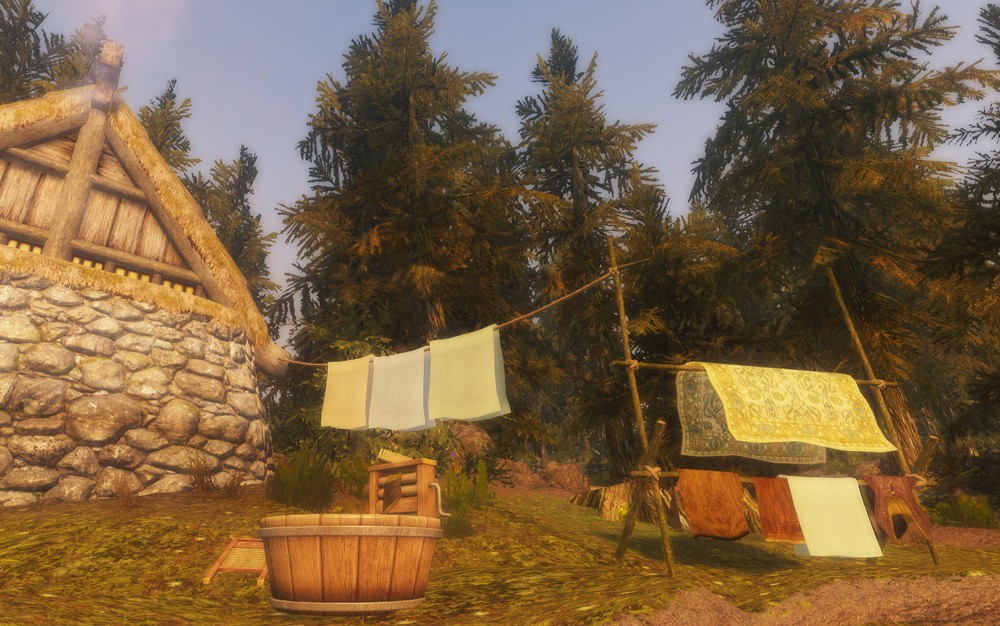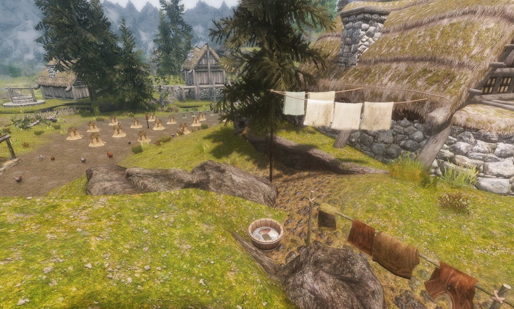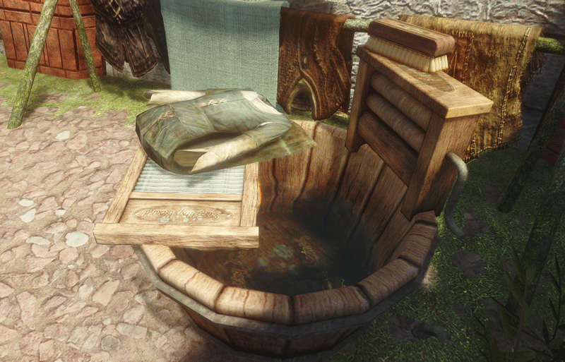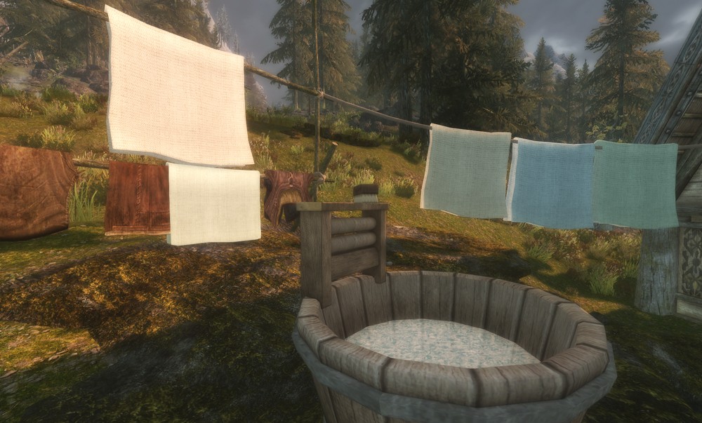 Данный мод добавляет во дворы скайримских обывателей щепотку их повседневной жизни в виде стираного белья, стиральных досок, щеток и тазиков с водой. Эти декоративные объекты размещены почти во всех цивилизованных областях провинции, у ферм и хижин, а иногда даже рядом с фортами.