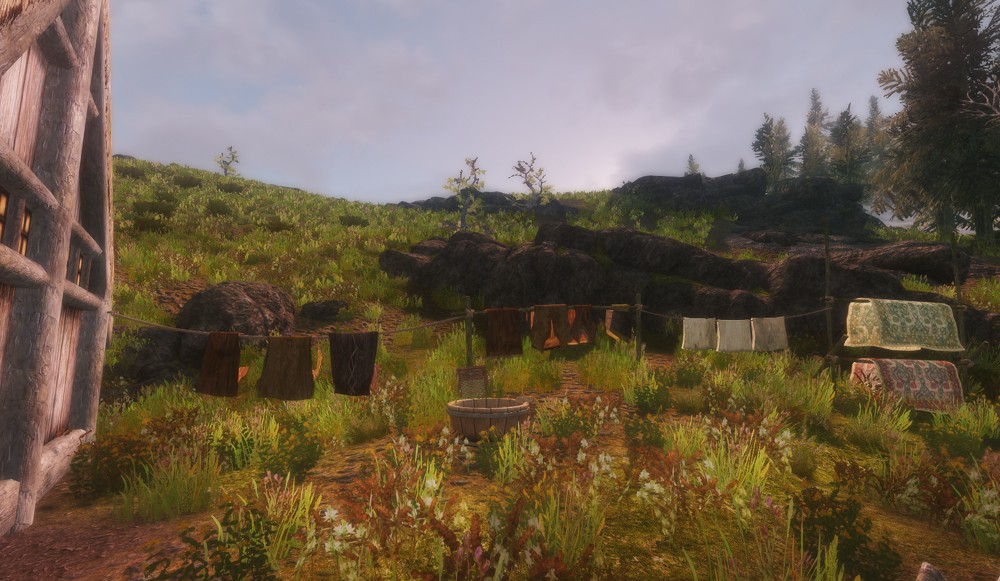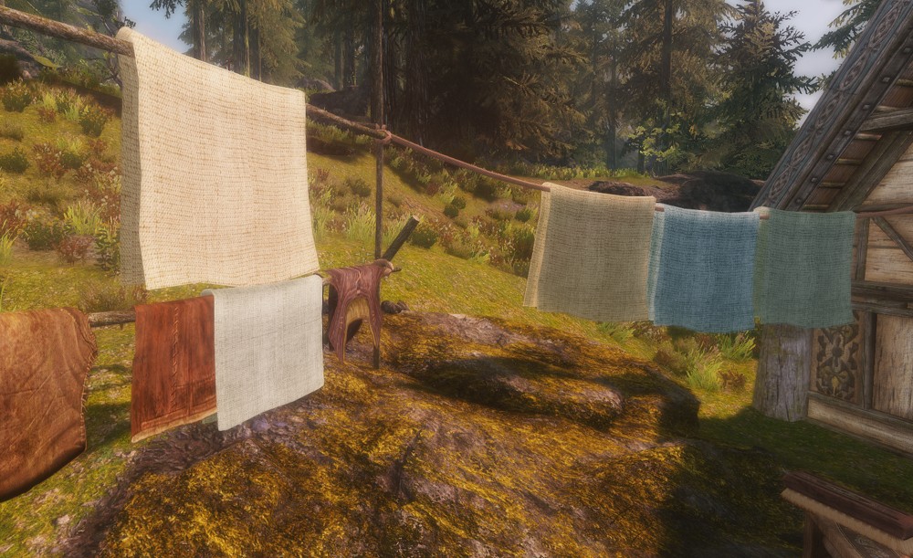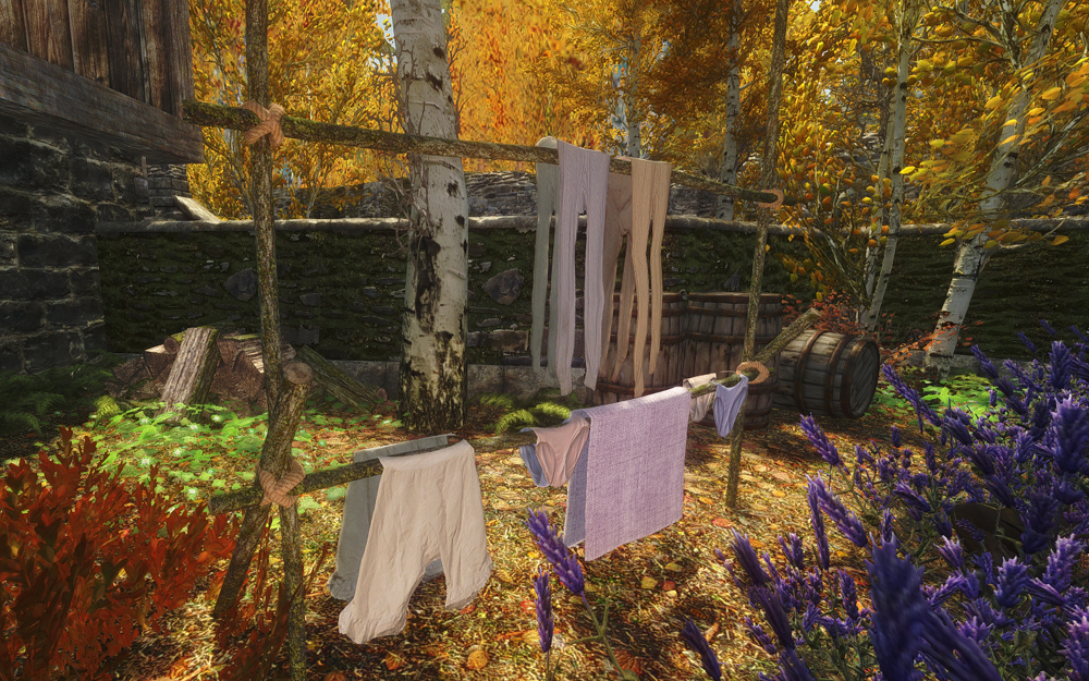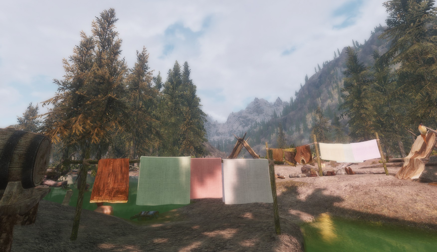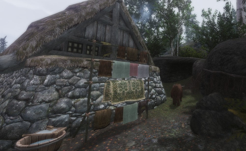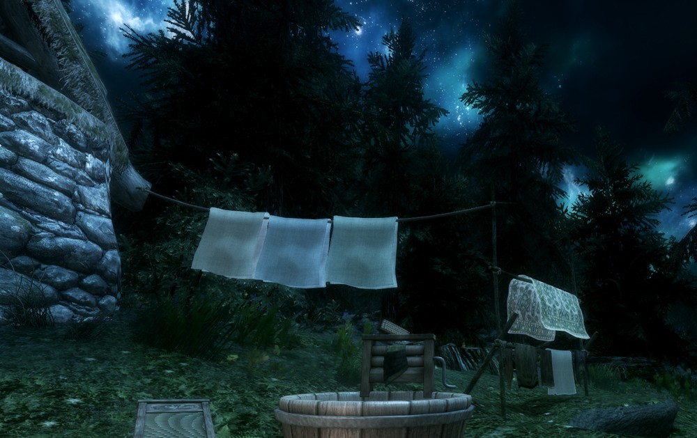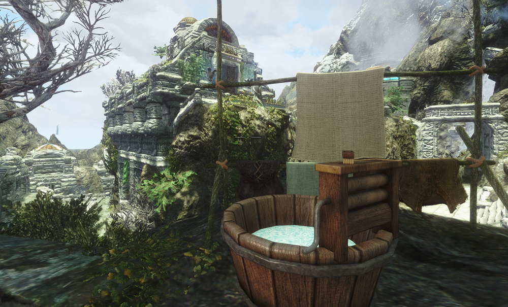Данный мод добавляет во дворы скайримских обывателей щепотку их повседневной жизни в виде стираного белья, стиральных досок, щеток и тазиков с водой. Эти декоративные объекты размещены почти во всех цивилизованных областях провинции, у ферм и хижин, а иногда даже рядом с фортами.