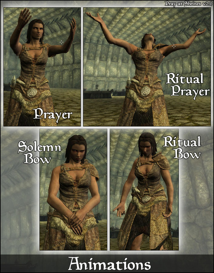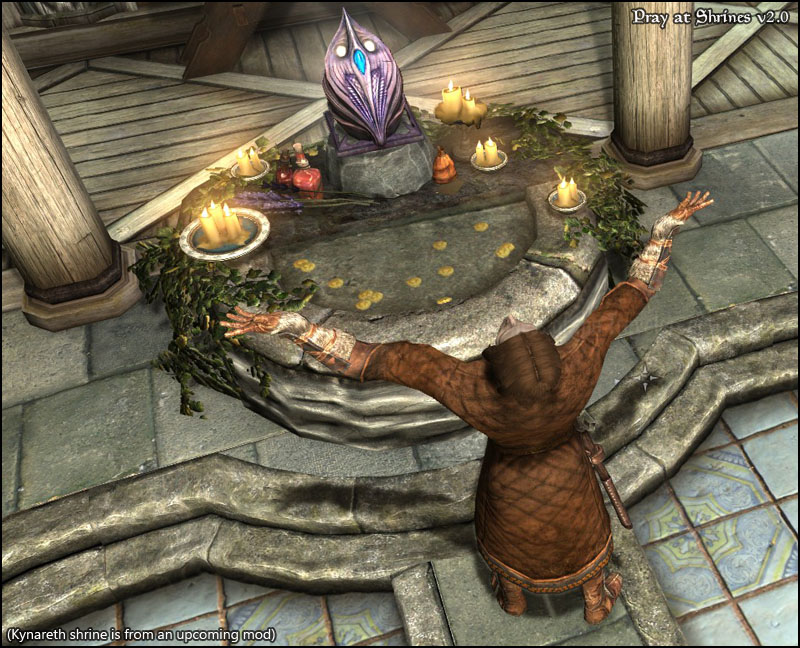 Мод добавляет атмосферную анимацию преклонения у святилищ. Преклонение у каждого святилища сопровождается небольшим лорным сообщением и визуальными/звуковыми эффектами.