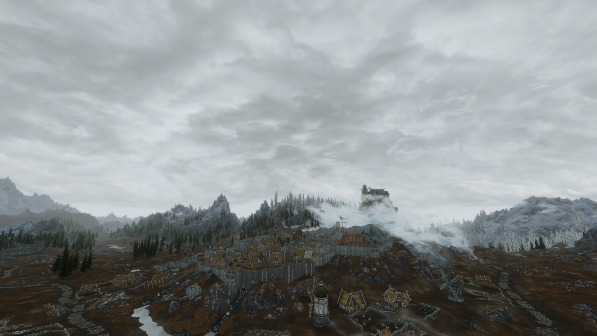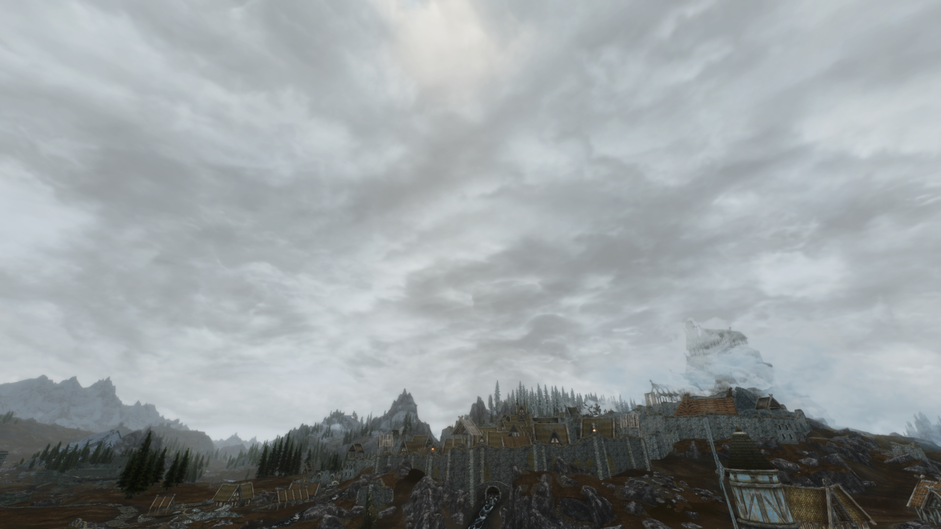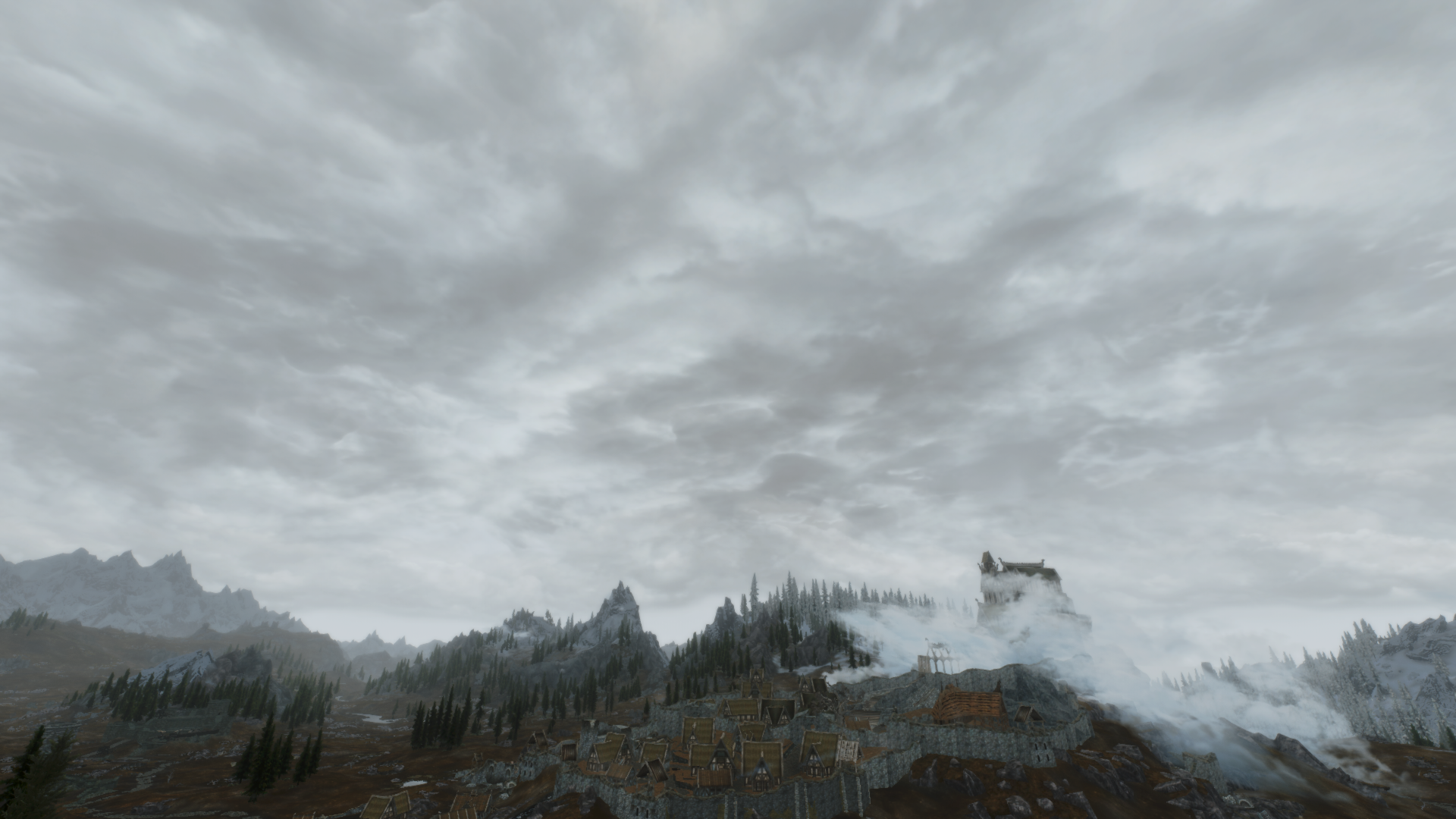 Итого мы имеем Драконий Предел который высотой теперь достает облака и купается в них. С далека (например с рынка Вайтрана) можно наблюдать его затерявшимся среди туч. С визитом к нему по мосту Довакину приходится проходить сквозь облака и наблюдать их очень близко.