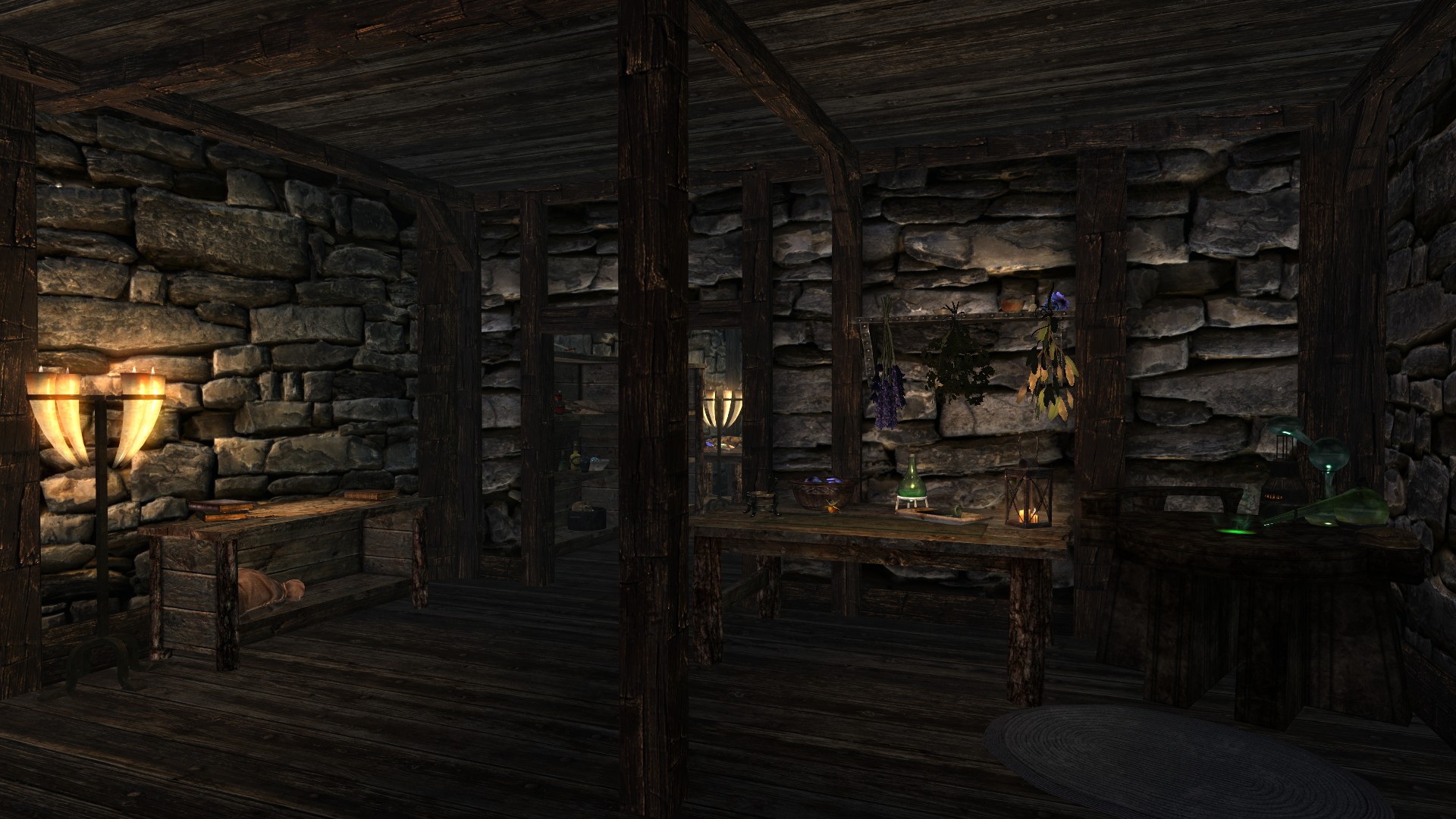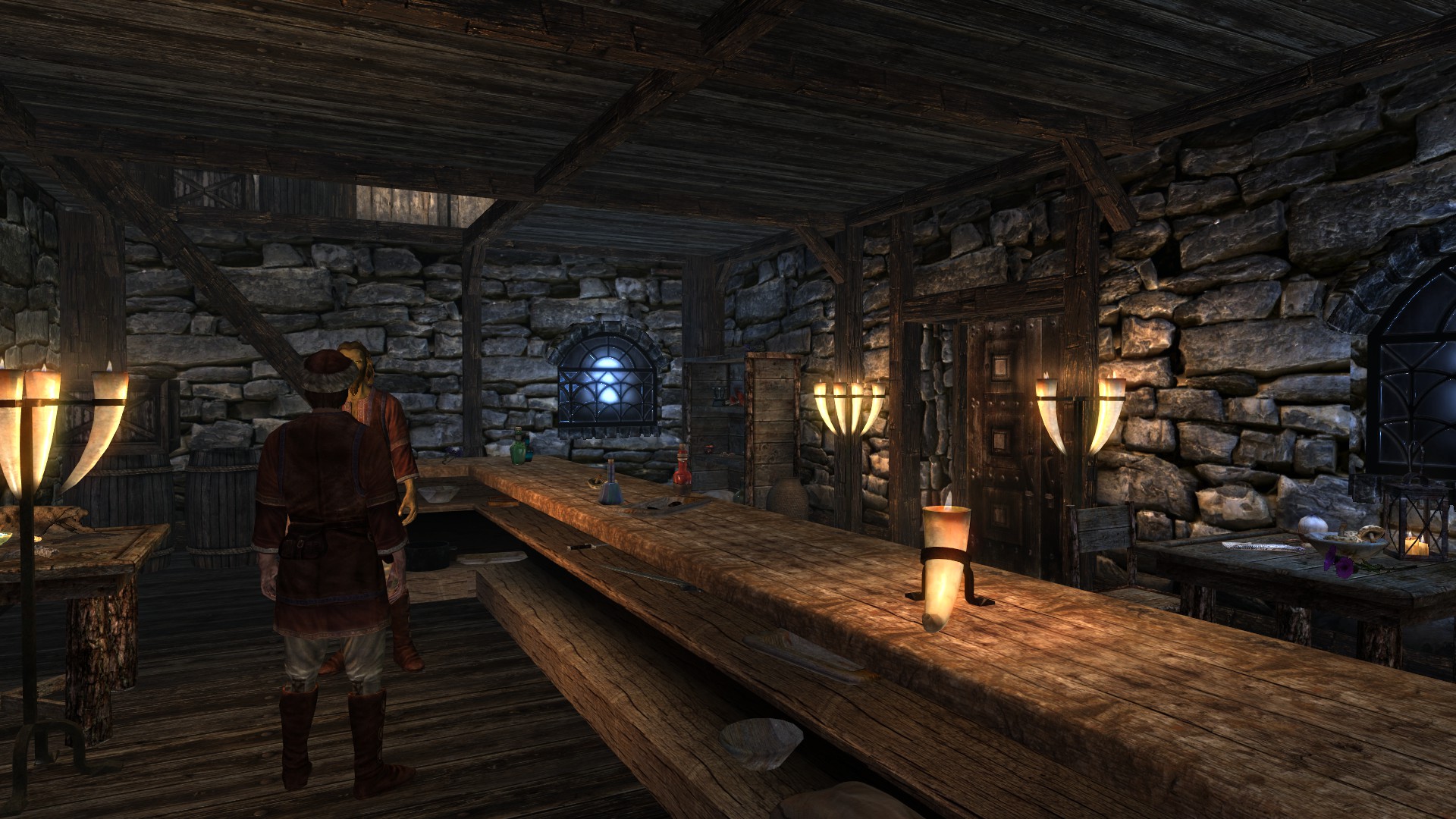 Вас никогда не интересовало, почему в домах Виндхельма так много дырок в стенах и полу? Понятно, что так разработчики хотели подчеркнуть то, насколько этот город старый и древний, но эти мелкие детали скорее способствуют появлению впечатления, что горожане не способны даже элементарно закрыть дырку в полу или заменить сломавшуюся доску в стене, не то что убрать грязь и мусор с собственных улиц. Именно поэтому я, возложив на себя нескромную задачу изменения текущего положения дел, решил обратиться к старому проверенному методу, а именно залез в Creation Kit и начал искать жертву для моих первых (но, как я надеюсь, не последних) экспериментов. Колесо Фартуны заскрипело и улыбнулась магазинчику, куда мне часто приходилось наведываться - "Белому флакону", коим владеет г-н преклонных лет, алхимик Нурелион.