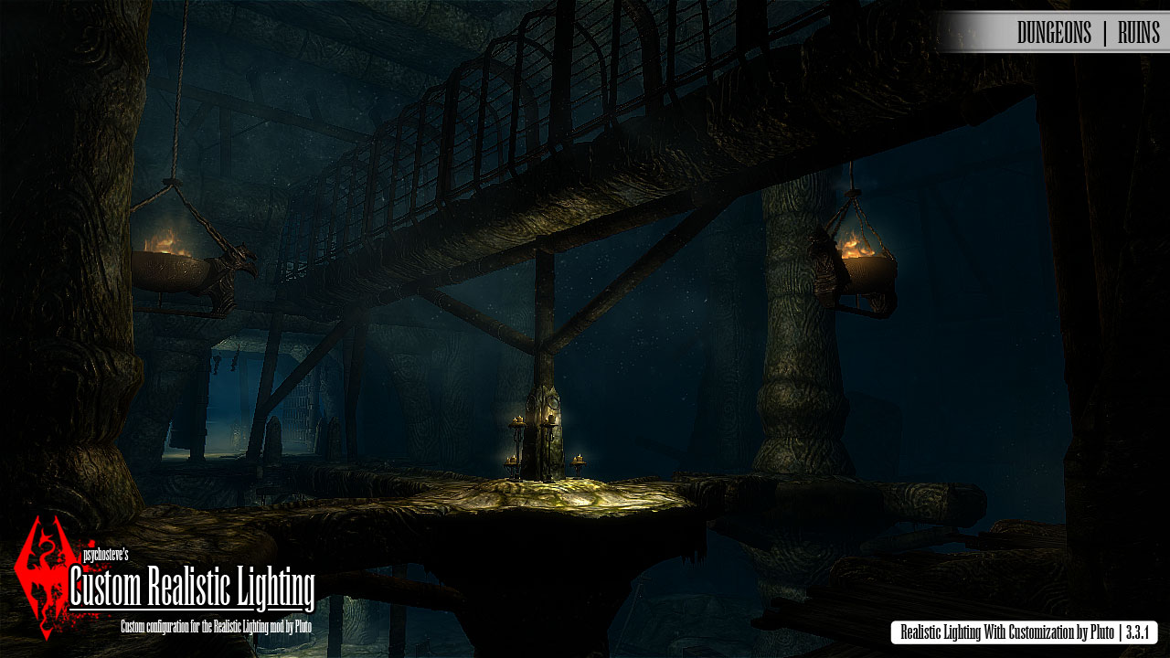 "На мой взгляд - это самый лучший, не требовательный мод, который создаёт просто невероятную атмосферу в не заселённых местах/локациях (гробницы, пещеры, форты, двемерские развалины). Более зловещего, пугающего и страшного освещения на не населённые локации я не нашёл, ни один существующий мод не может сравниться с атмосферой этого мода. А поскольку мы около 80% времени в игре проводим в данжах, то мод непременно должен стоить вашего внимания.