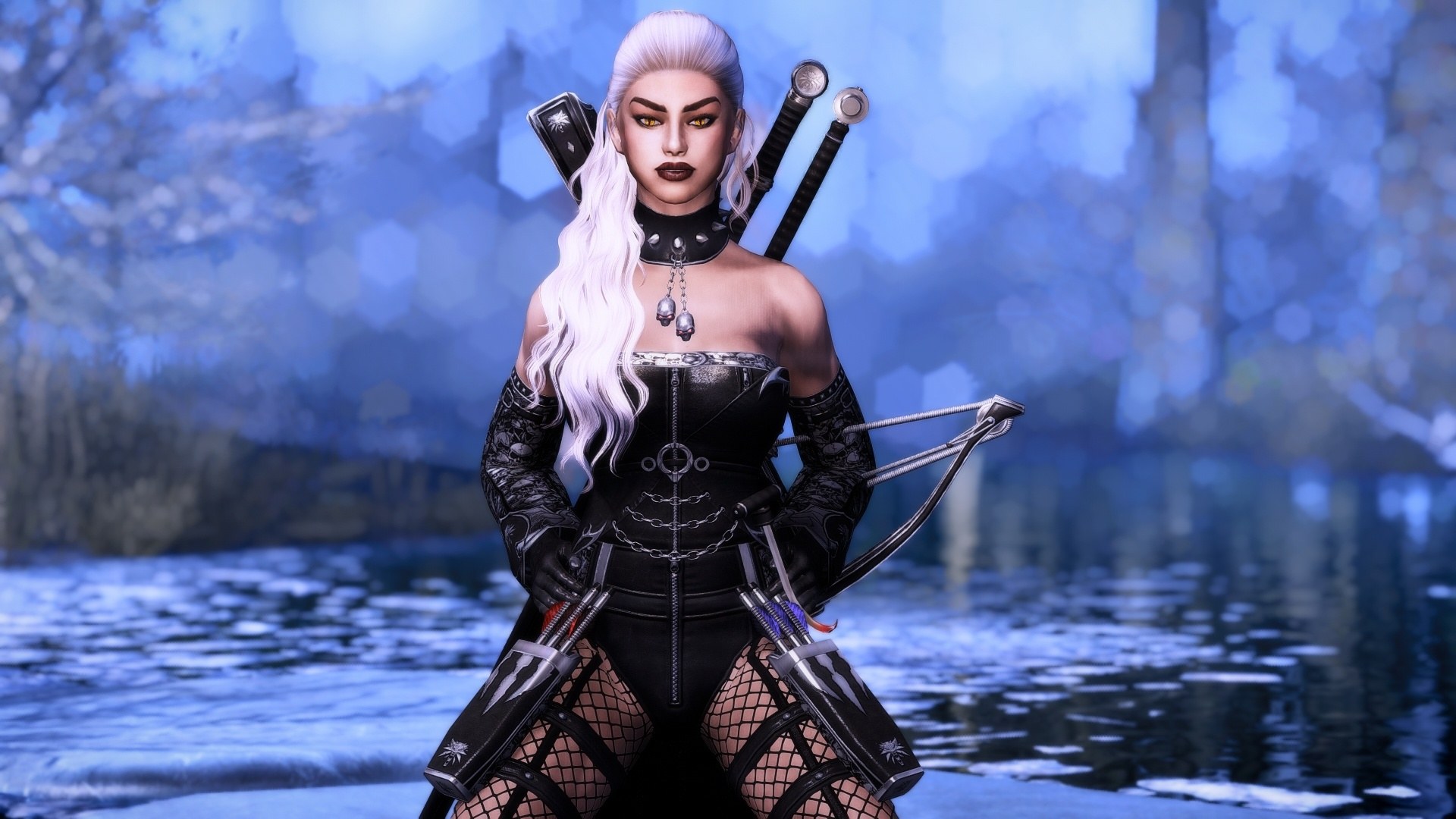 Мод добавляет в Skyrim лёгкую эбонитовую броню для женских персонажей с уникальным арбалетом, болтами и декоративными мечами в стилистике ведьмака.
