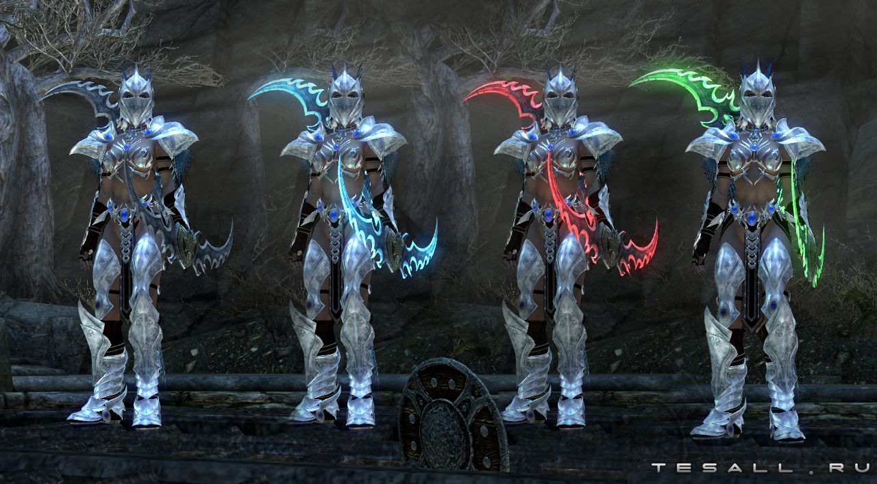 Дополнительные цвета свечения клинков находятся в папке Data\meshes\weapons\jojjosglaives\Дополнительно. Выберите нужный вам цвет и скопируйте файлы из папки со цветом в папку Data\meshes\weapons\jojjosglaives.