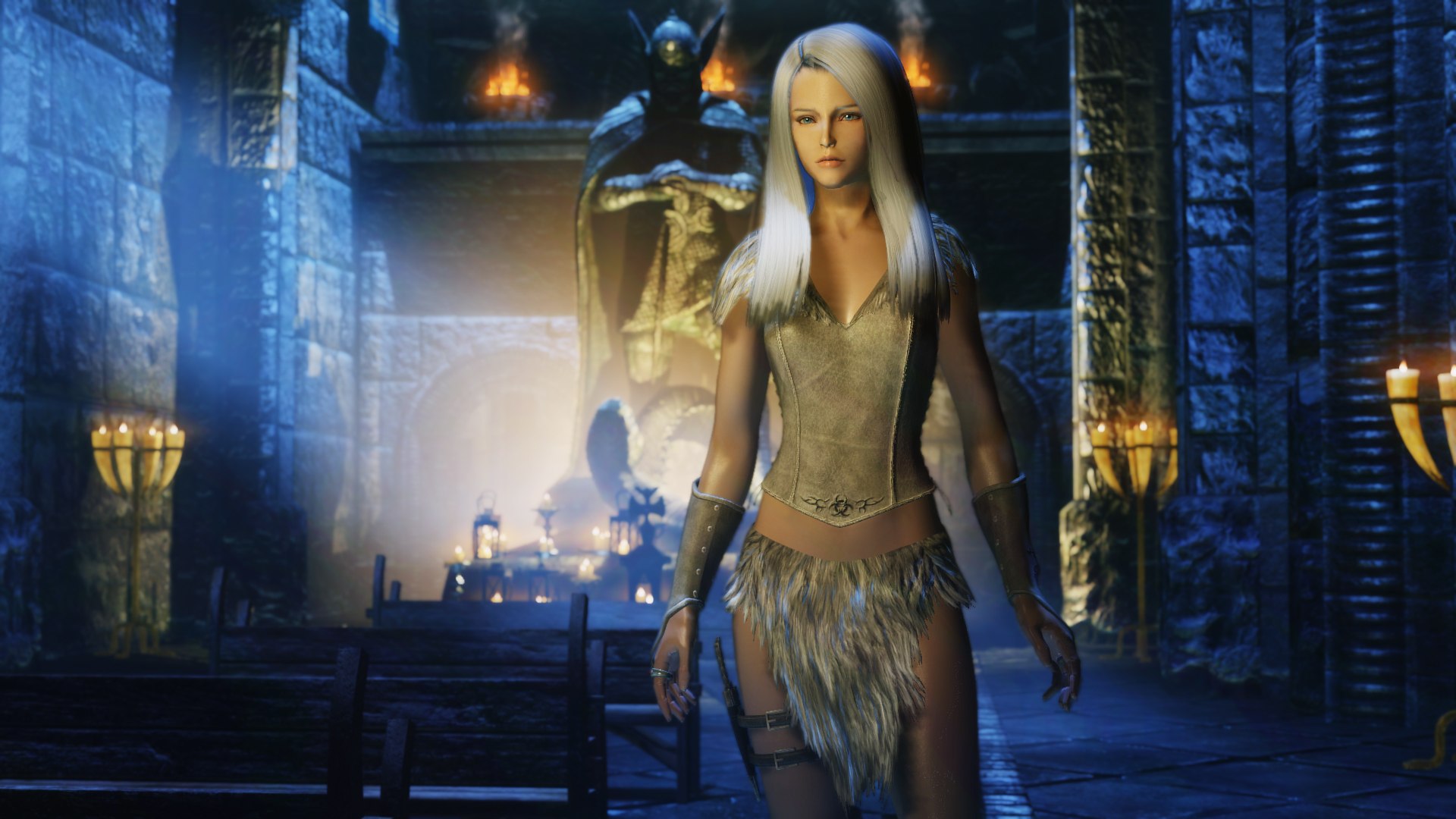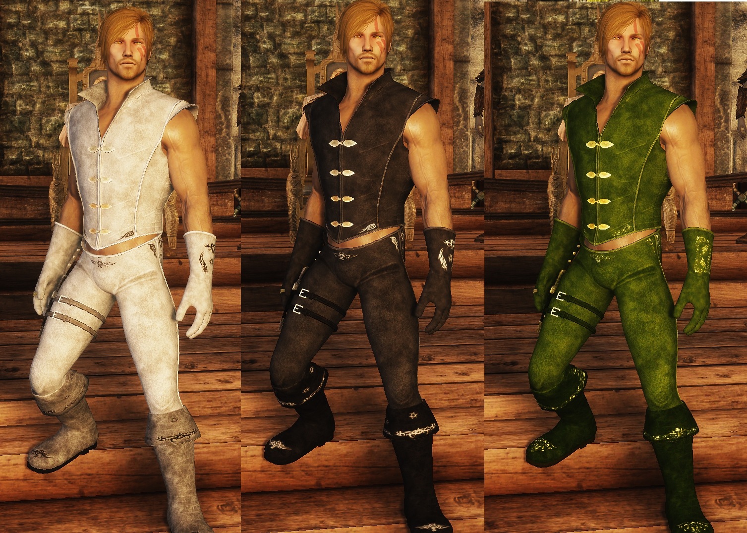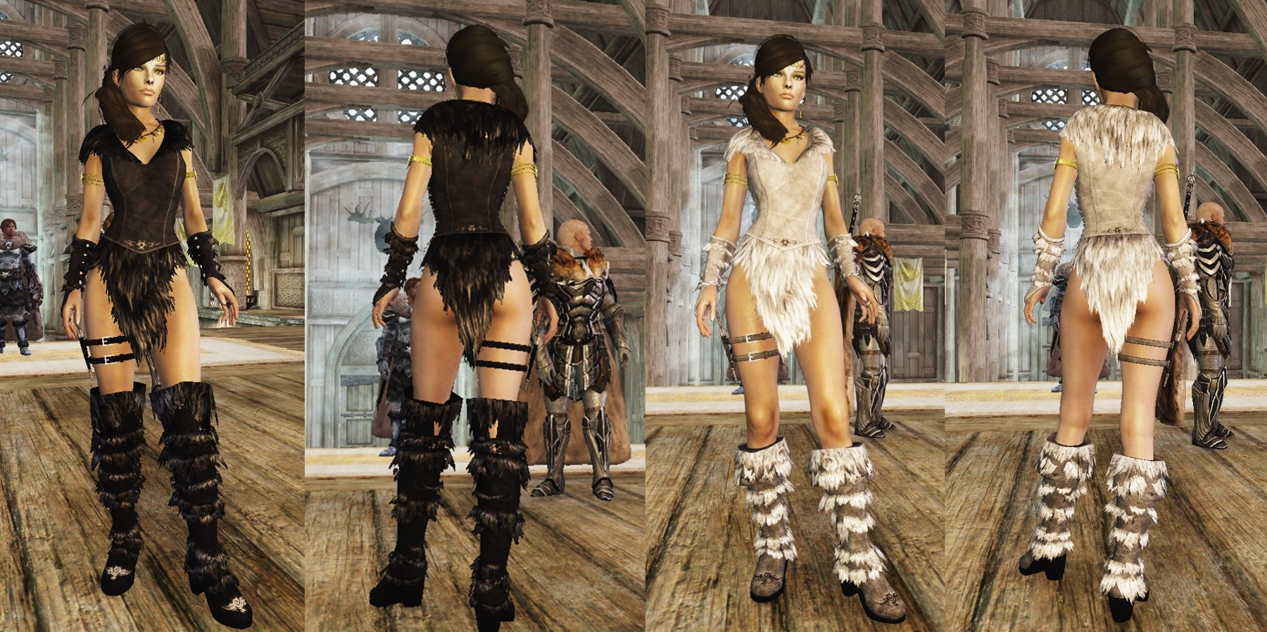 - Меховая опушка трех цветов для сапог, наручей, брони (воротник и юбка) - для "теплой" версии костюма.