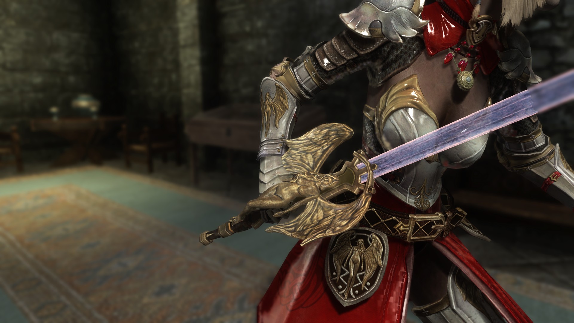 Мод добавляет в игру новый комплект брони и оружия святой королевы, которые вы найдете внутри сундука в покоях ярла Драконьего Предела.