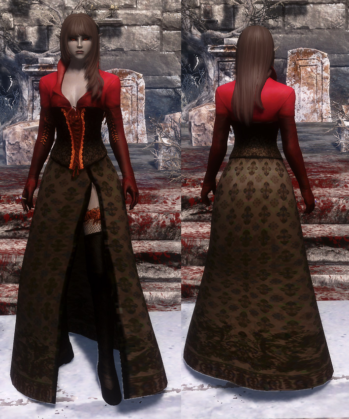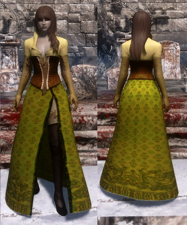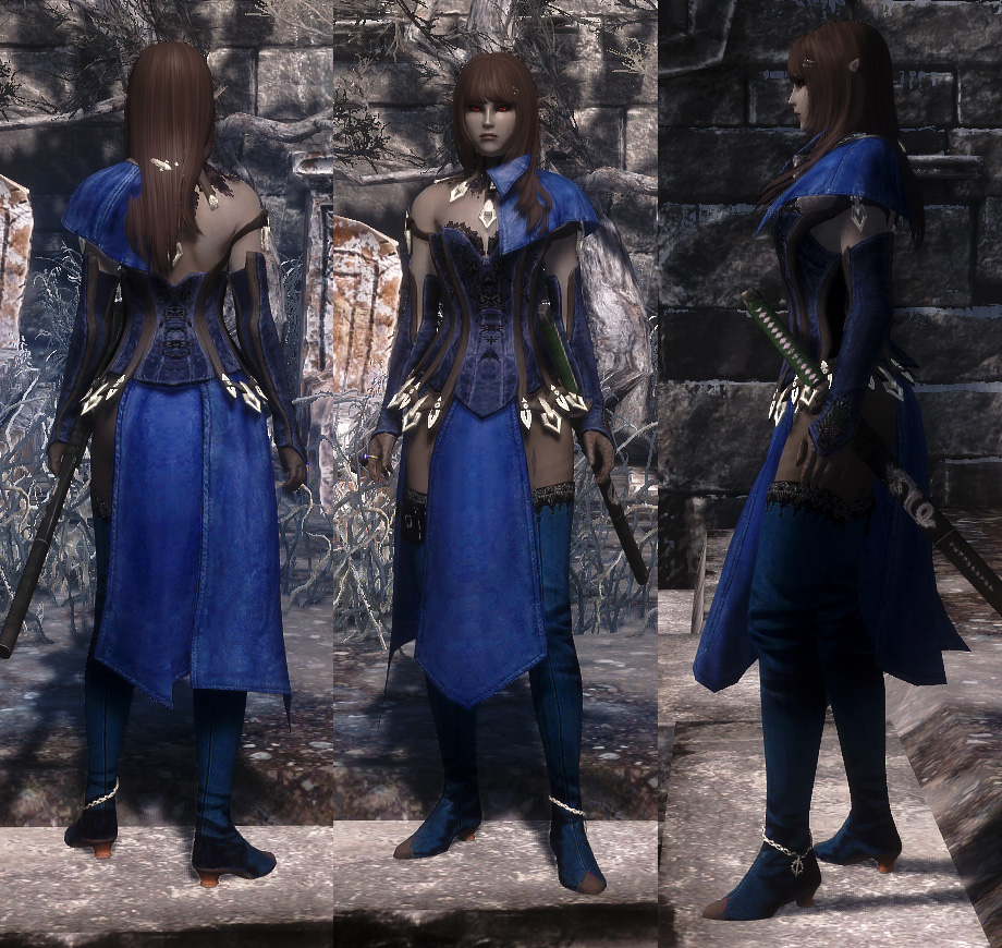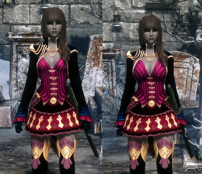 Мод добавляет в Скайрим три женских наряда из MMORPG Guild Wars 2. Наряды взаимодействуют с ползунком веса, но лучше всего выглядят с настройками (0-5 веса в меню расы).