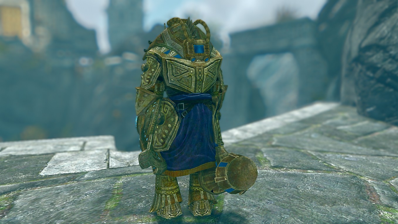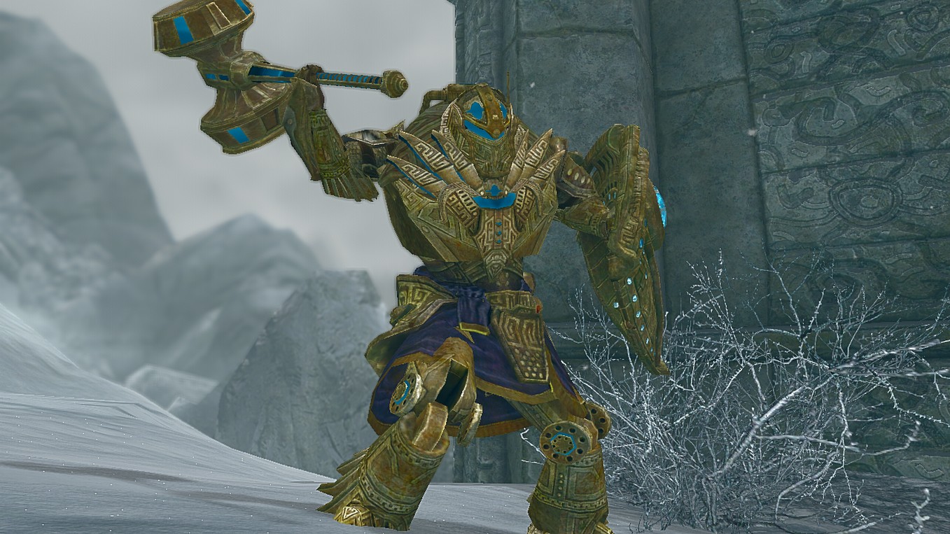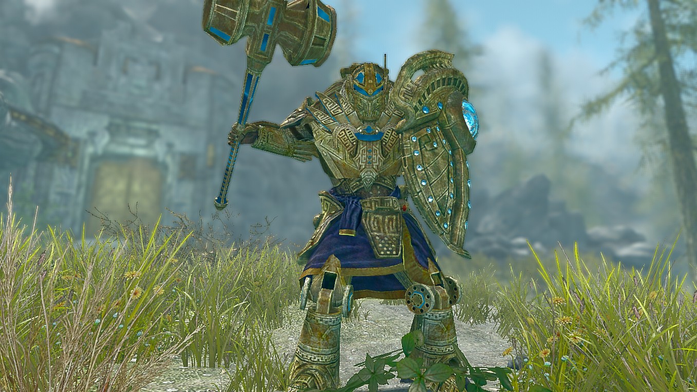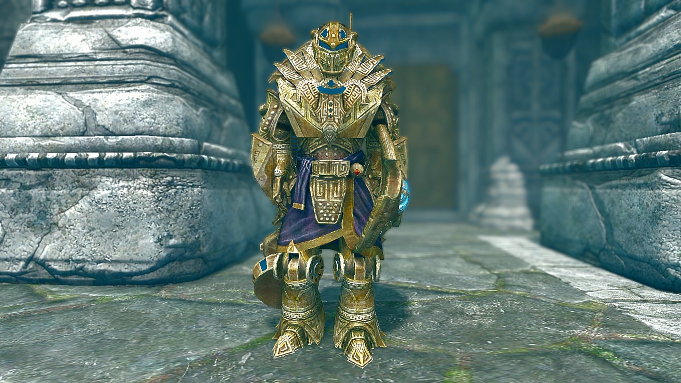 Эта силовая броня считалась потерянной до того как нашел Талмор. Теперь Талмор вместе с Аркано хотят с ее помощью уничтожить Колледж Винтерхолда. Но вы можете нарушить их планы, отправившись в Мзулфт и одолеть генерала Халидила. С трупа помимо самой брони можно снять этериевый щит и двемерский этериевый боевой молот.