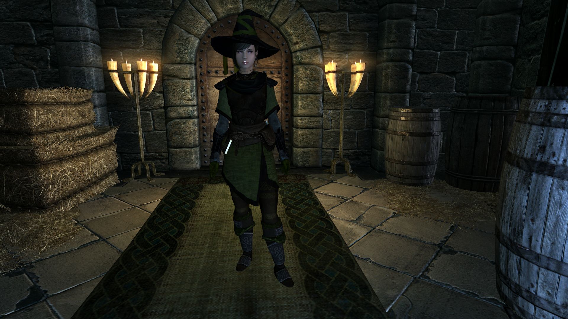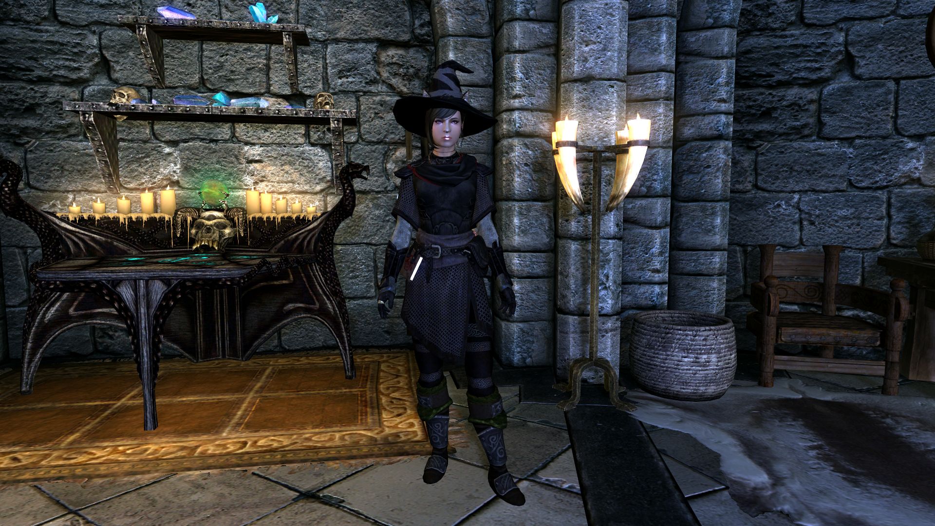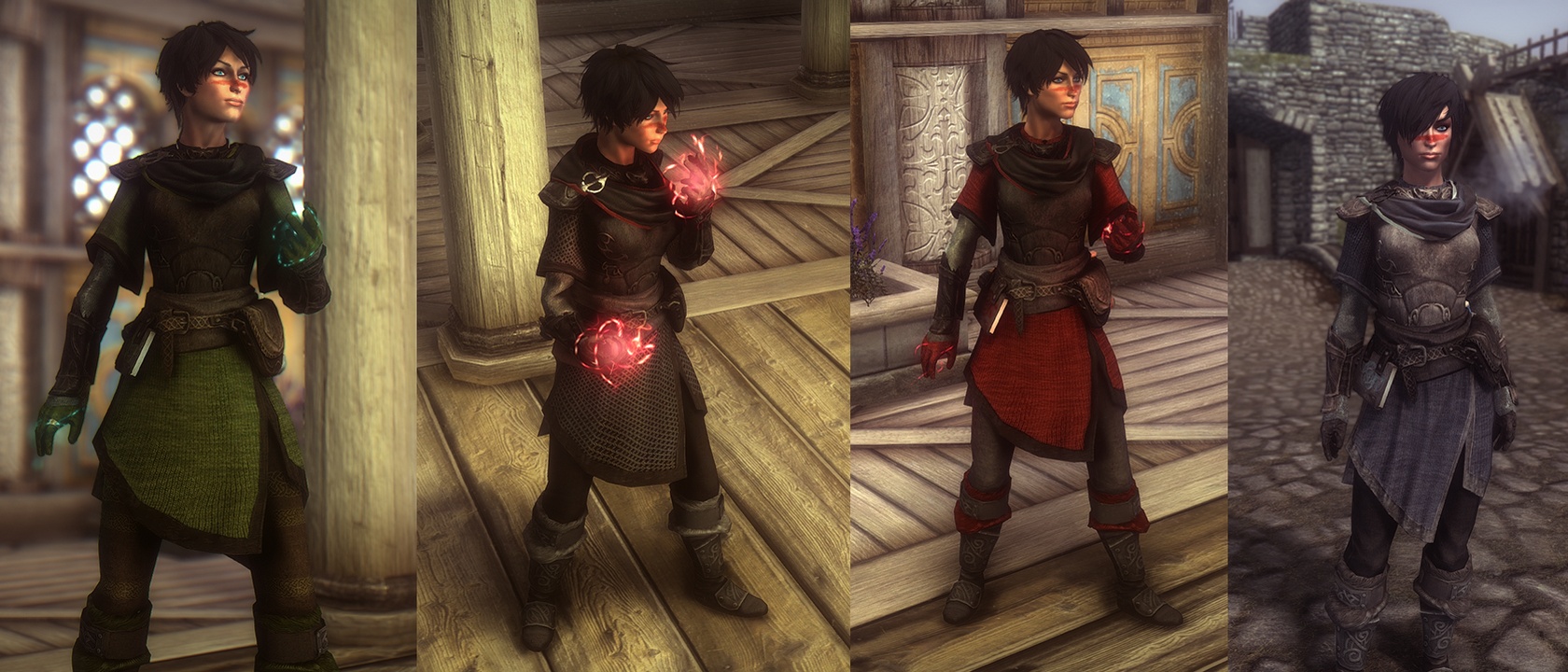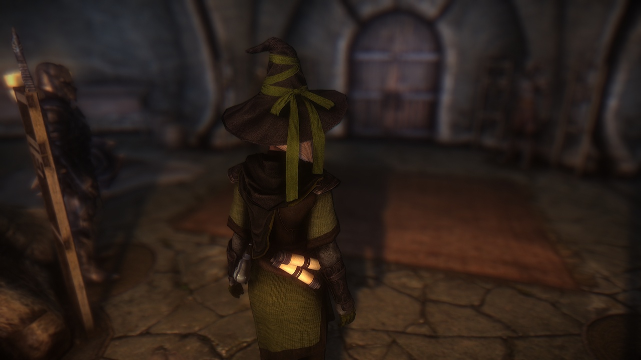 Комплект состоит из одеяния, сапог, перчаток и шляпы и представлен в четырёх вариантах, отличающихся цветом. Найти доспехи можно в сейфе на столе в одной из комнат Зала достижений Коллегиии Винтерхолда. Также броню можно изготовить в кузнице или на наковальне и улучшить на верстаке. Для этого у вас в инвентаре должна находиться книга "Изготовление брони боевого мага" и открыт перк Сложные типы брони. Книгу можно купить у торговцев, которые торгуют заклинаниями (она добавлена в их "уровневые" списки).