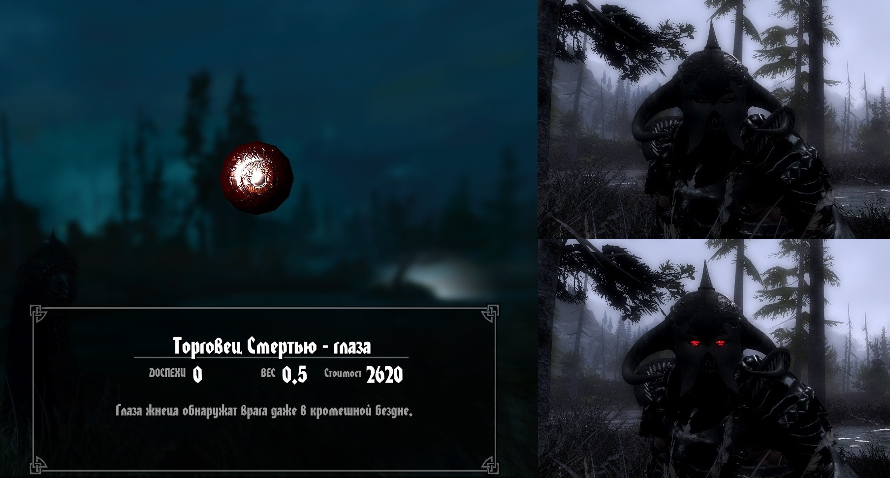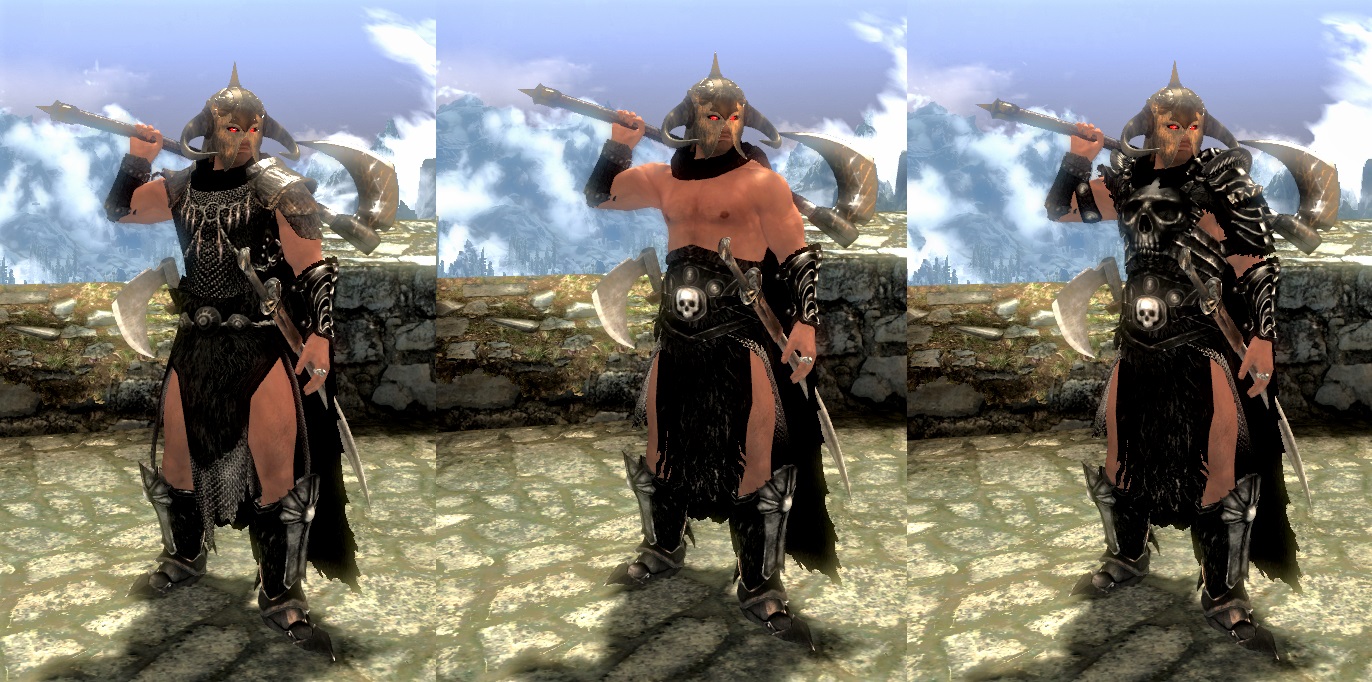 У босса находится один вариант нагрудника, для смены дизайна нагрудника воспользуйтесь кузницей и перекуйте уже имеющийся вариант нагрудника в какой вам нужно. Броня отображается ТОЛЬКО на мужских персонажей, для женских персонажей броня выглядит как даэдрическая, и я не стал это менять (простите меня милые женские персонажи), но я считаю, что даэдрическая броня красиво сочетается с красными глазами, накидкой и шлемом торговца смерти. Шлем подходит для обоих полов но НЕ подходит для зверорас. Броню возможно улучшить в кузнице, но зачарование снять невозможно.