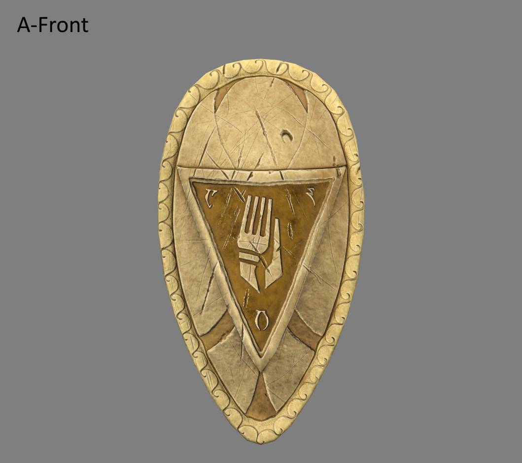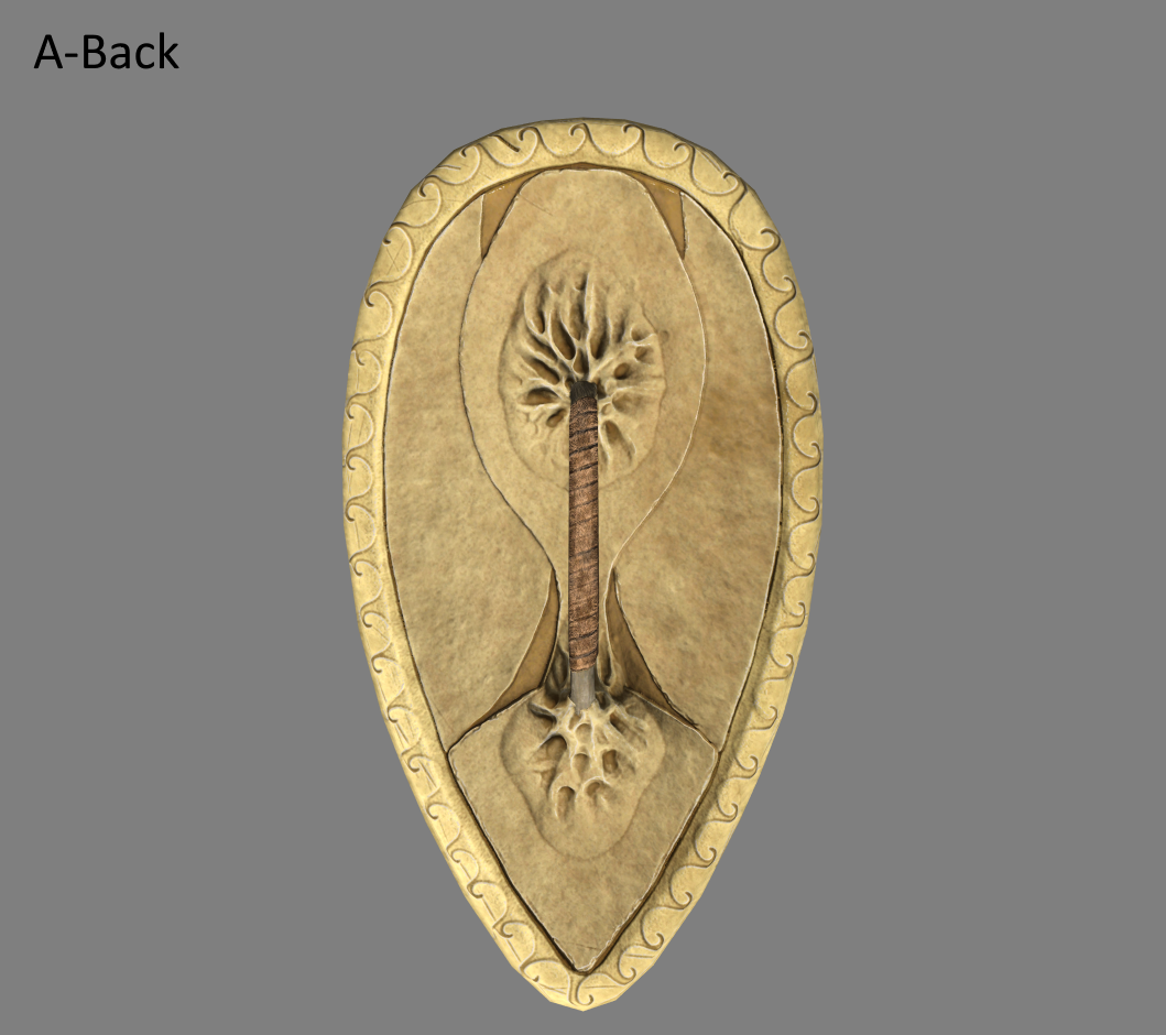 Примечание: Я знаю, что Дом Индорил раньше был сосредоточен на поклонении Ложному Трибуналу, поэтому на щитах вырезаны первые буквы имён Альмалексии, Соты Сила и Вивека. Однако, как сказано в книге
