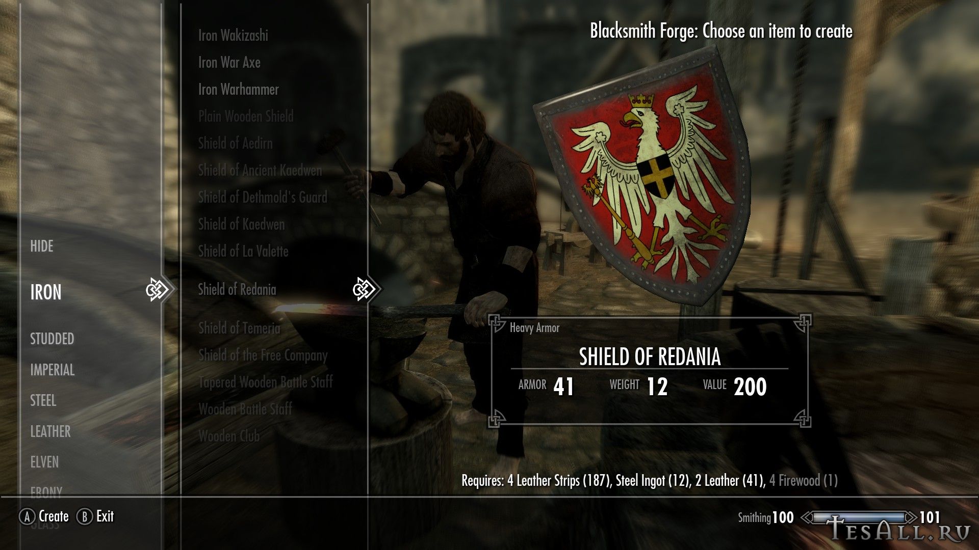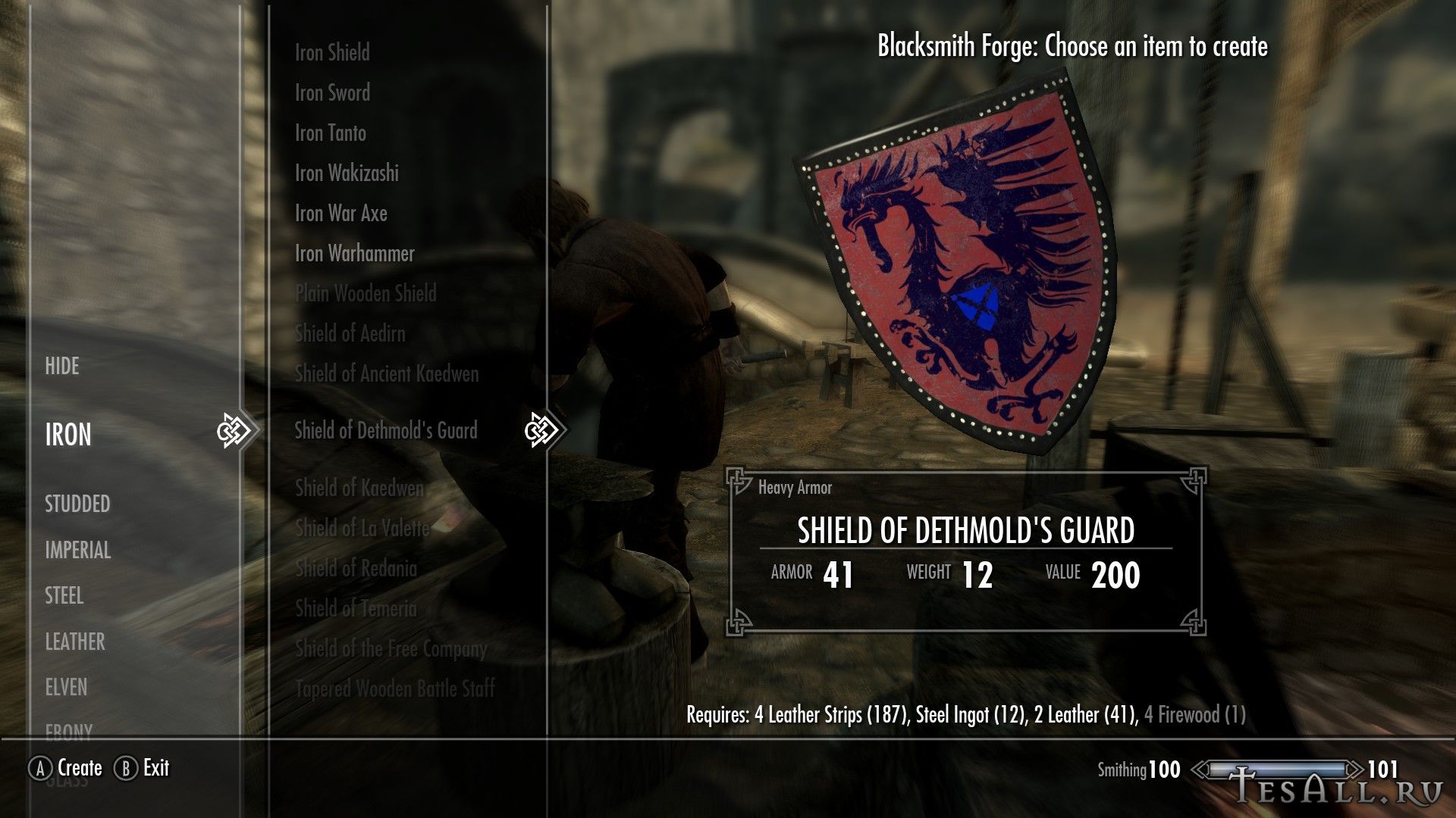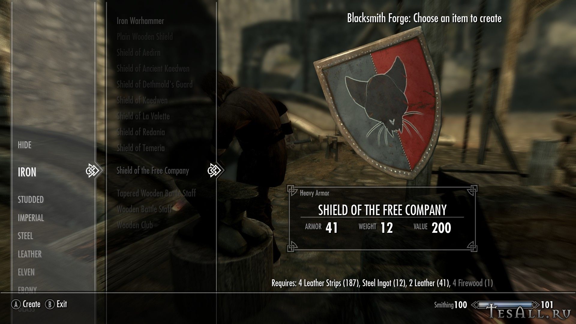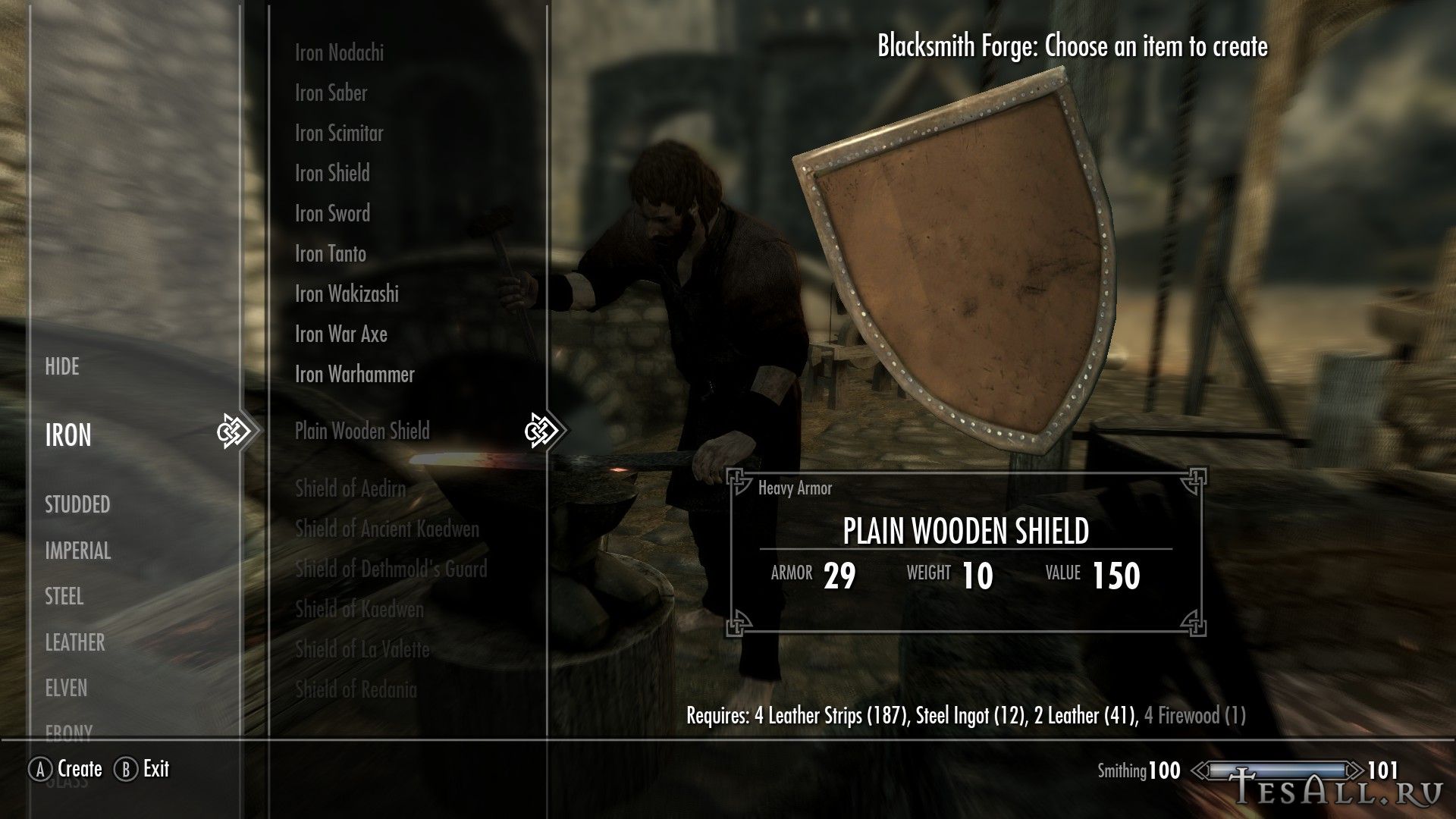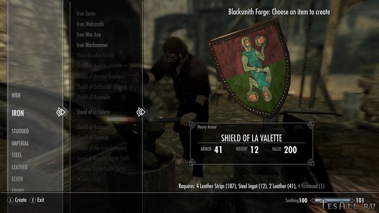 Все щиты можно создать в кузнице (некоторые с перком на ковку стальных доспехов), находятся они в разделе клепаного, щиты можно улучшать. Одним из ингредиентов являются дрова.