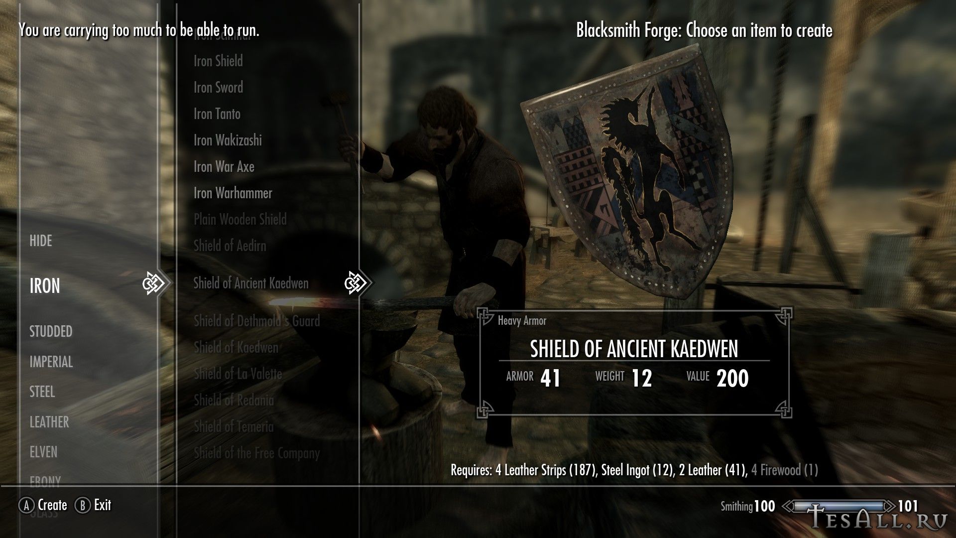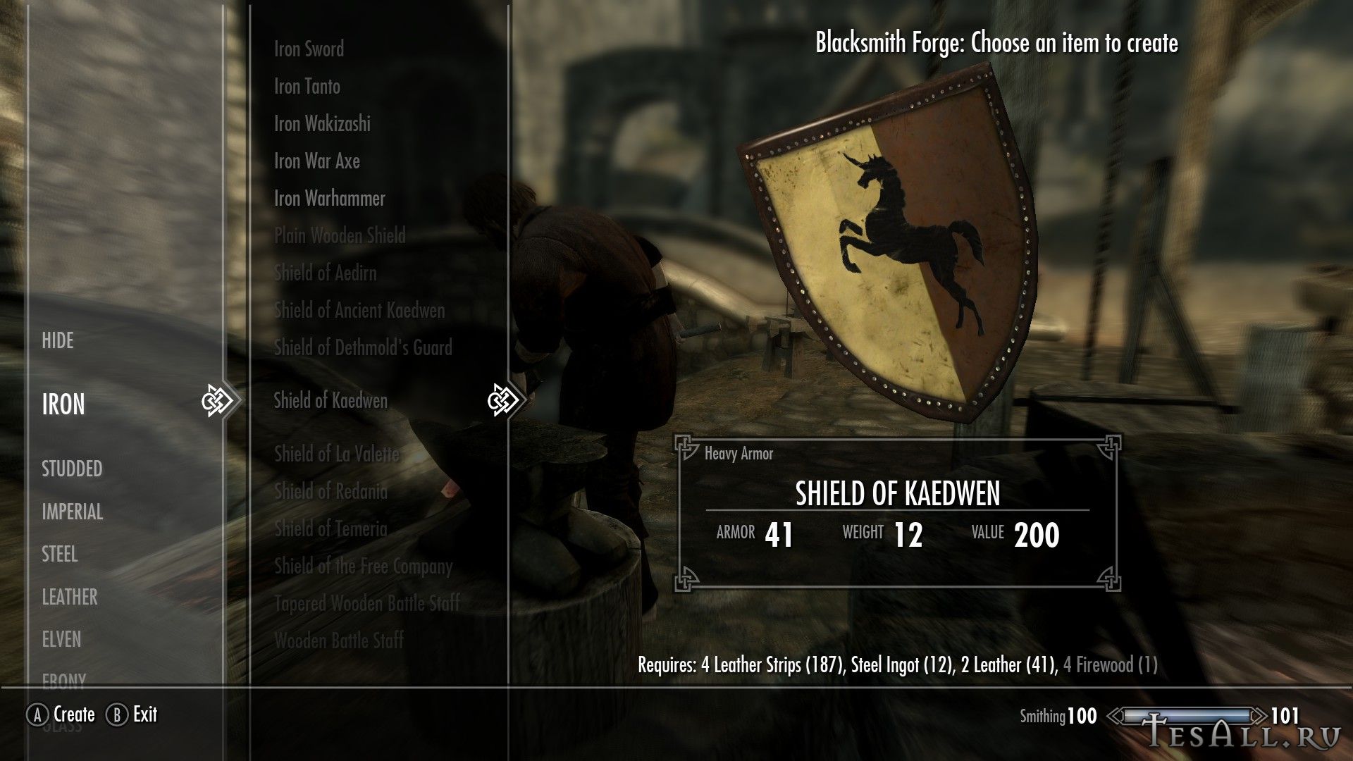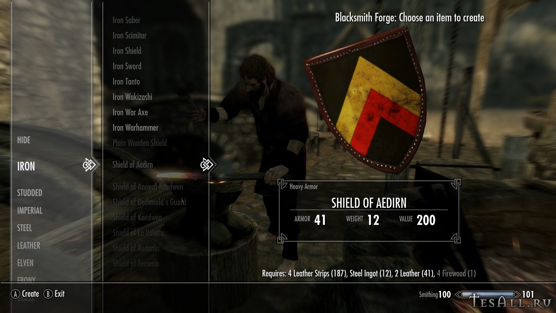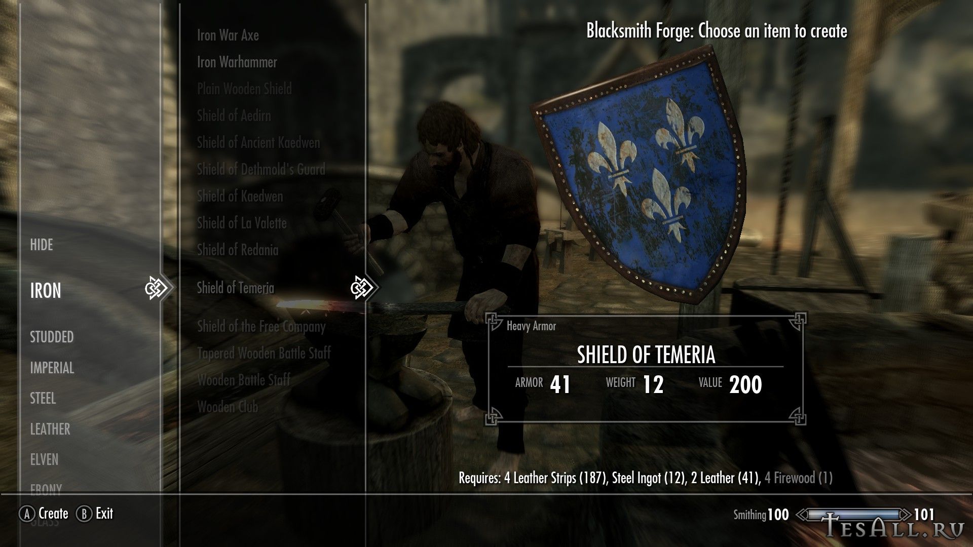 Все щиты можно создать в кузнице (некоторые с перком на ковку стальных доспехов), находятся они в разделе клепаного, щиты можно улучшать. Одним из ингредиентов являются дрова.