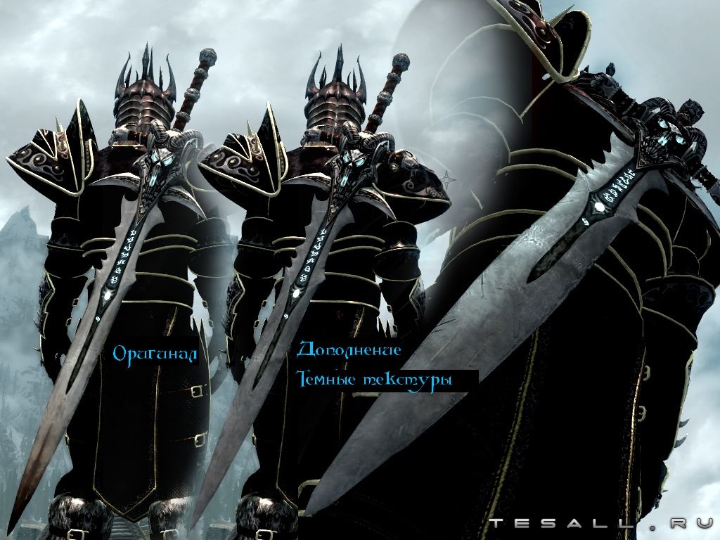 У доспехов Короля-лича вы можете поменять цвет плаща с черного на коричневый. для этого перейдите в папку textures\armor\Arthas\Дополнительно и скопируйте файл ArthasCape.dds в папку textures\armor\Arthas.