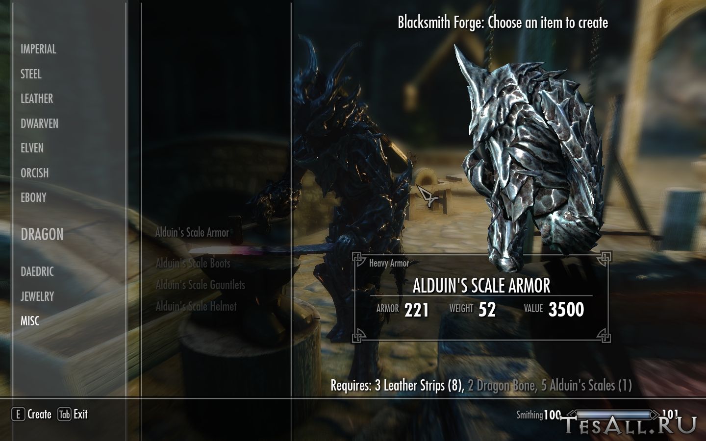 Данную броню можно создать в кузнице, но сначала вам потребуется чешуя Алдуина, которую можно было бы добыть с самого Алдуина, но он же МЕРТВ, а если у вас он еще не мертв, то это ничего не меняет, потому что при смерти он взрывается.