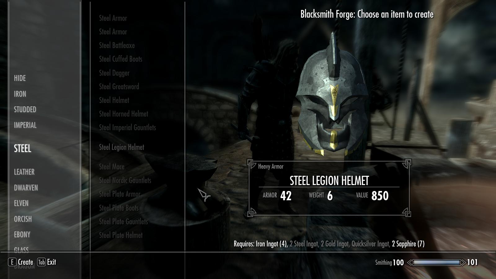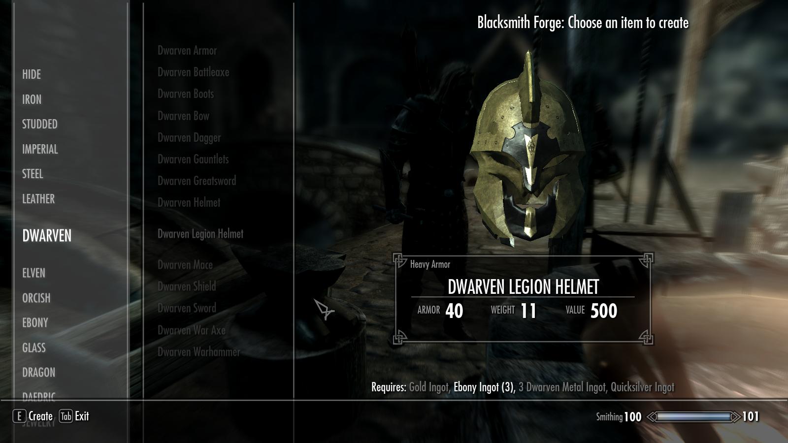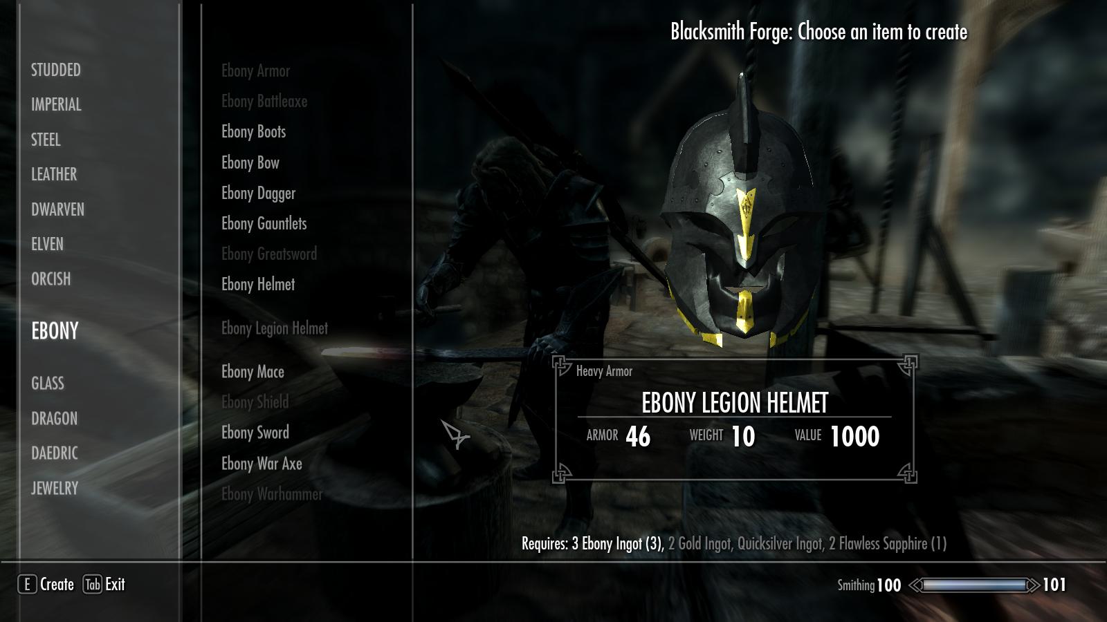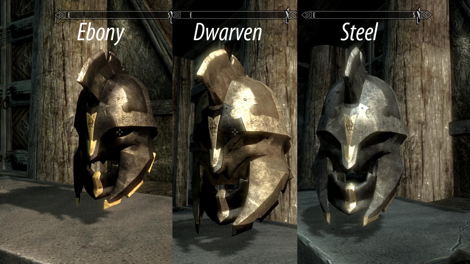 Плагин добавляет в игру шлем из игры Infinity Blade, представленный в трех версиях: двемерской, стальной, эбонитовой. Шлем можно создать в кузнице, посетив категорию соответствующего материала. шлем поддерживает мужскую и женскую голову, но не аргониан и каджитов.