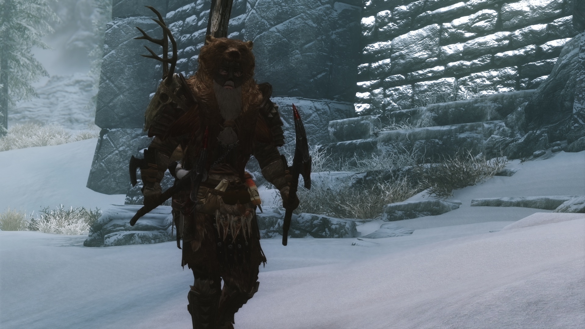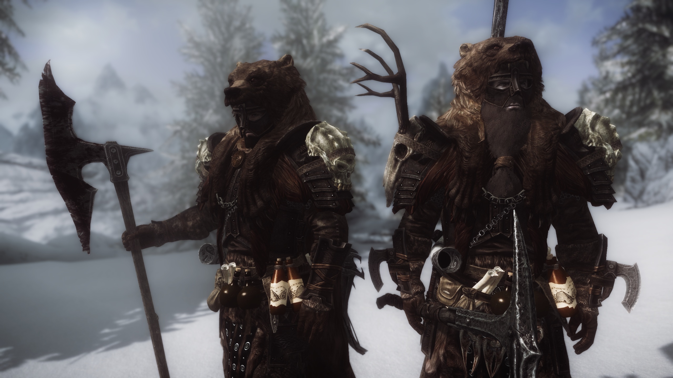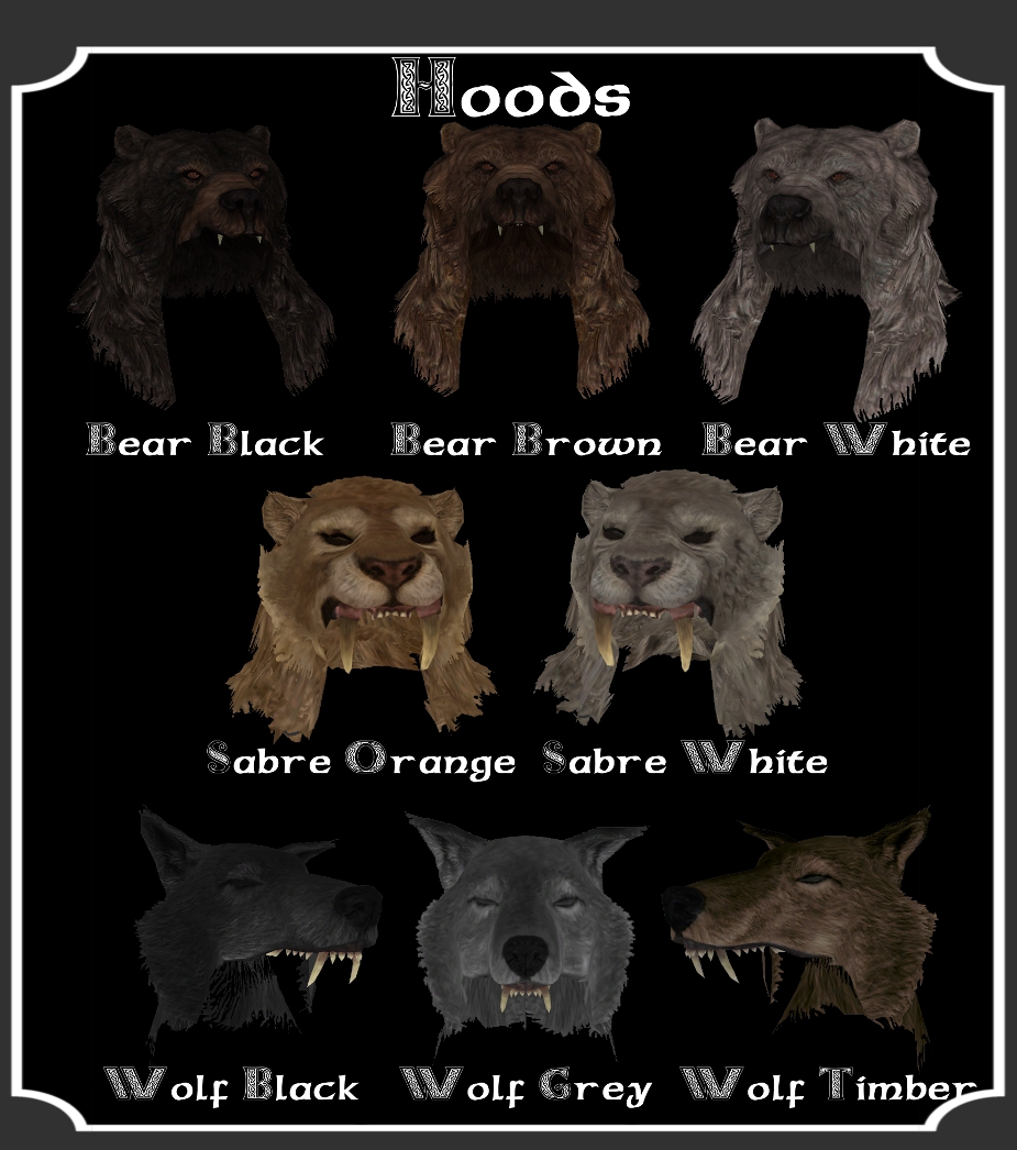 Меховые капюшоны из медведя, волка или саблезуба разных цветов. Комбинируются со ШЛЕМАМИ.