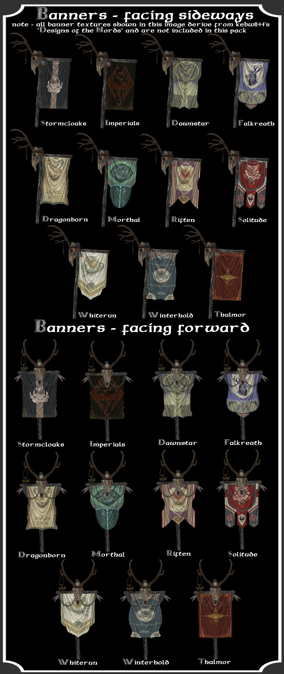 Флаги и знамена несут ваш герб и девиз. Некоторые из них могут заставить враждующую фракцию напасть на вас. Разница между флагами и знаменами невелика - всего лишь в том, как они повернуты. Комбинируются с БРОНЕЙ.