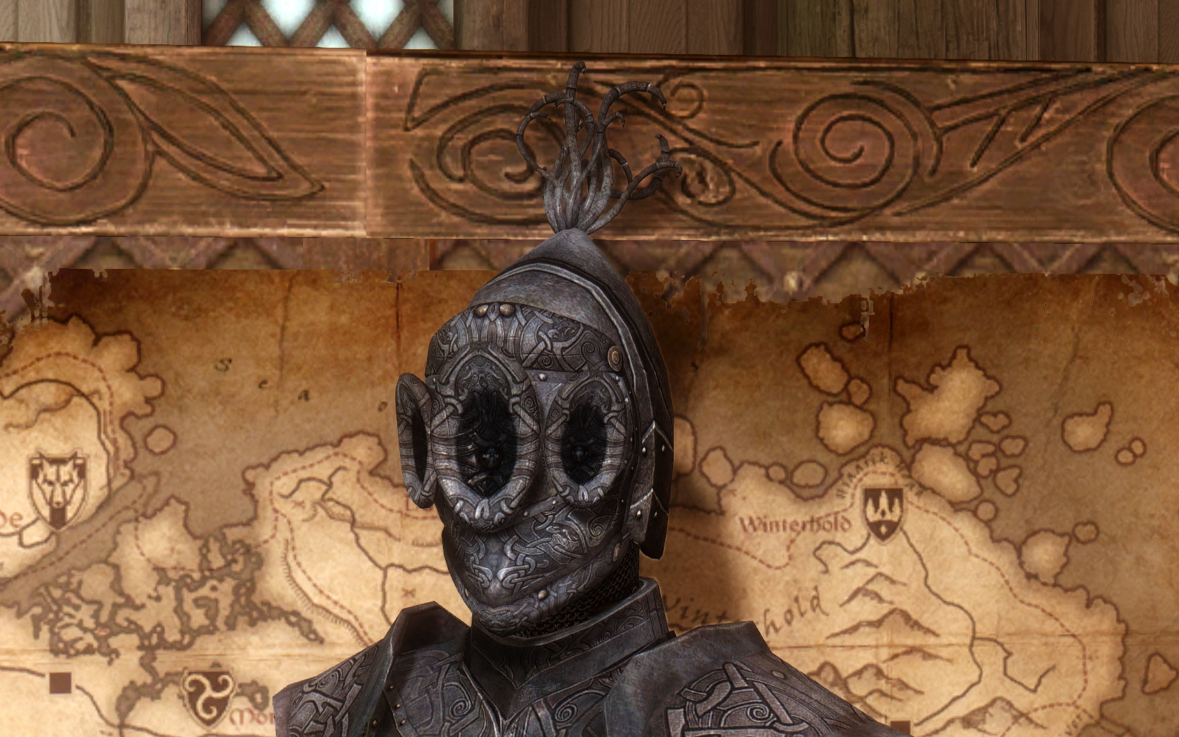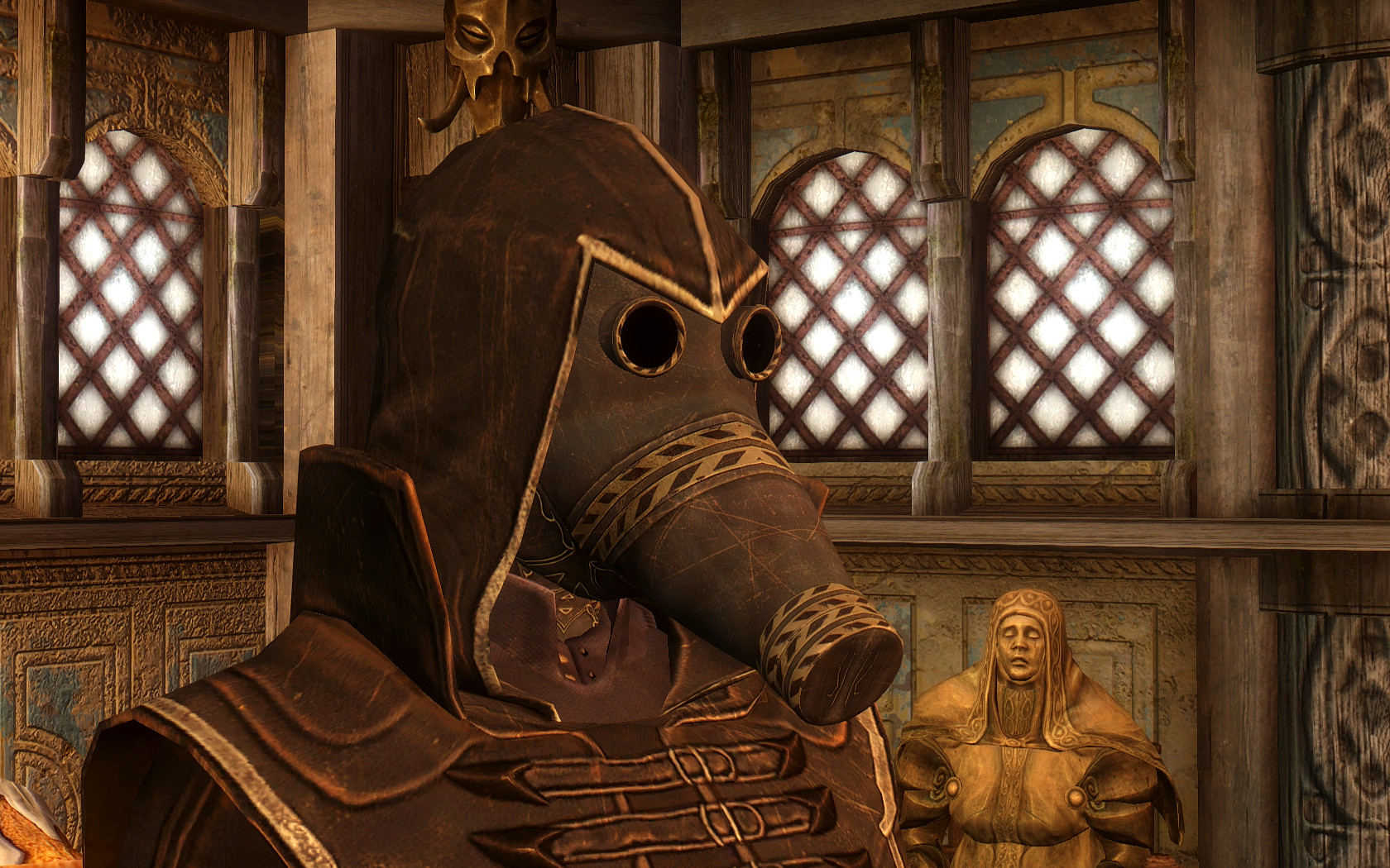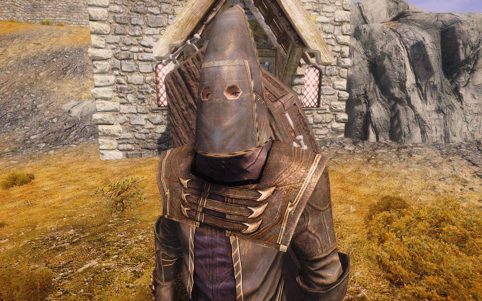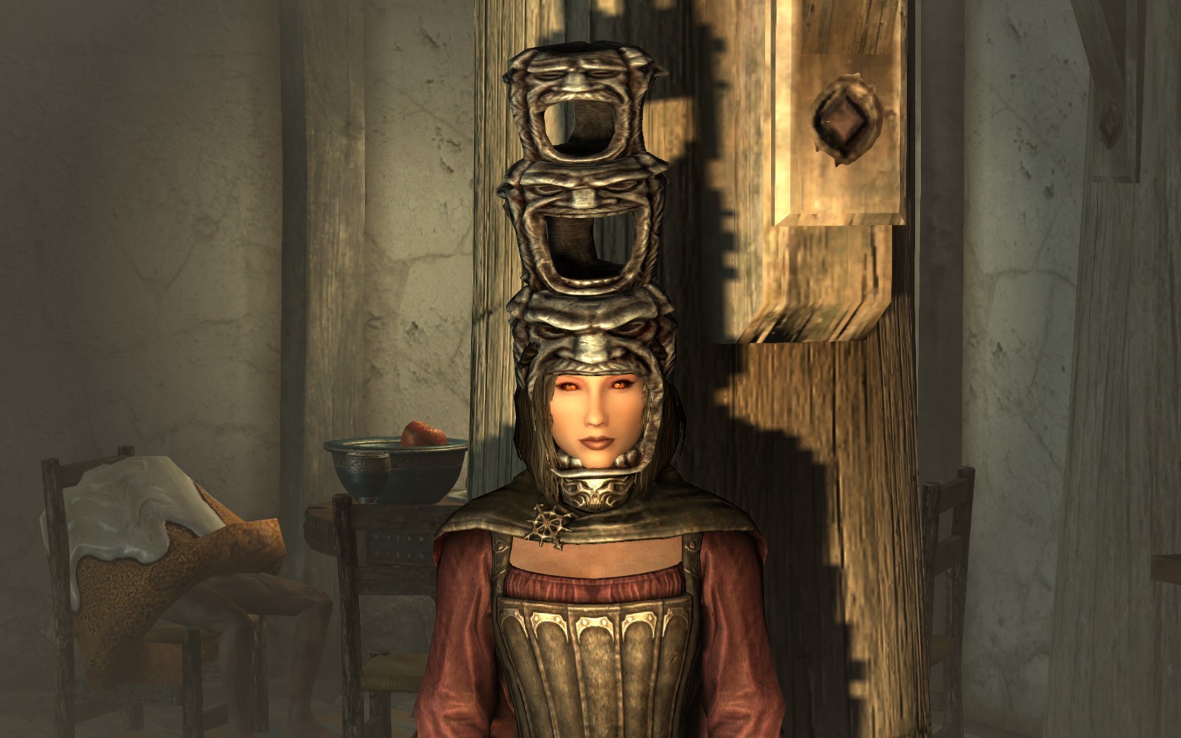 Очень много шлемаков из темных душ , молот Смоуга теперь молот мары , гробики на спинах , талморские шляпки , маска человека ворона (отсыкла на одного ютубера:) и чего стоит только костюм кротчи из Постола . Четко.Красиво.