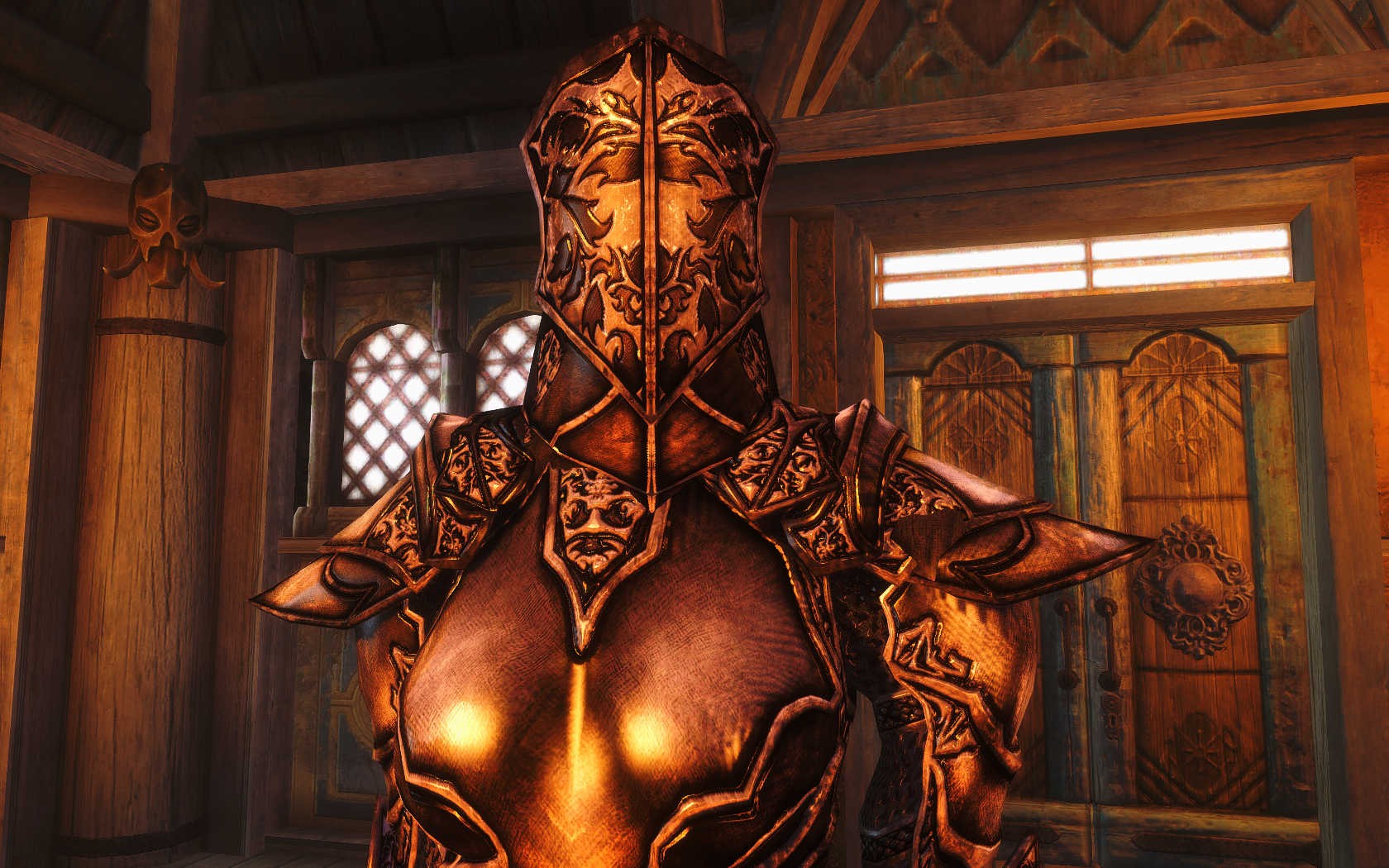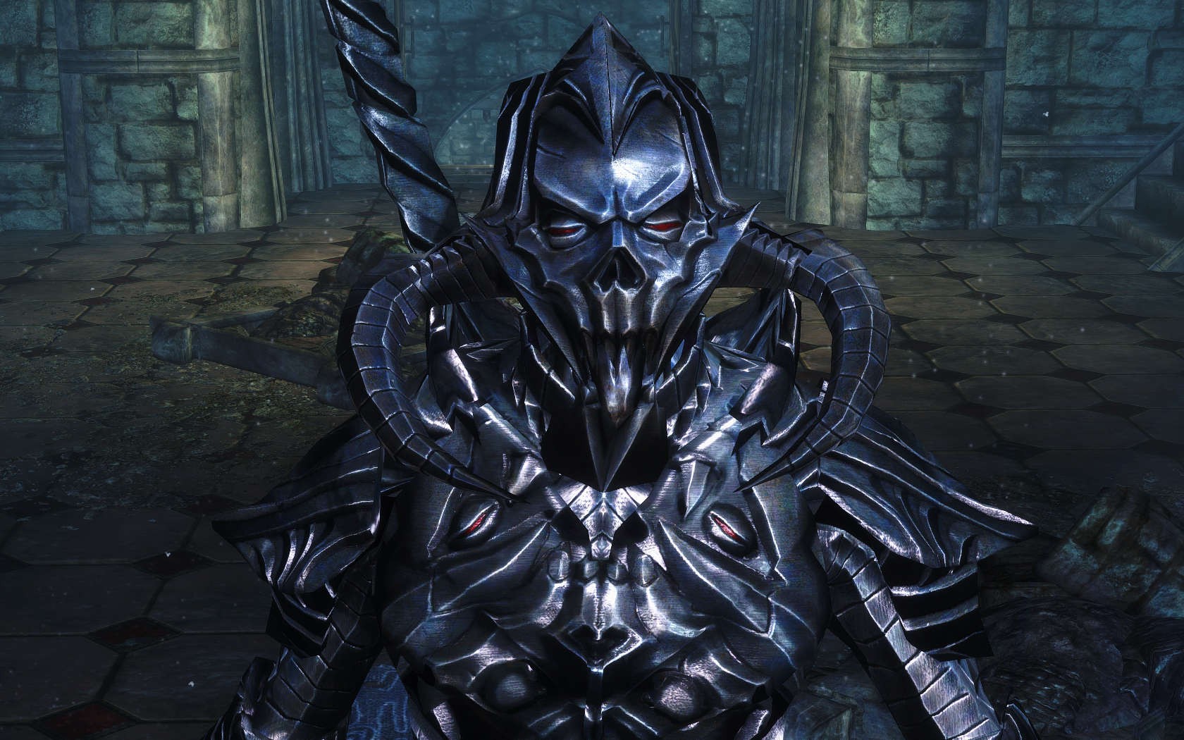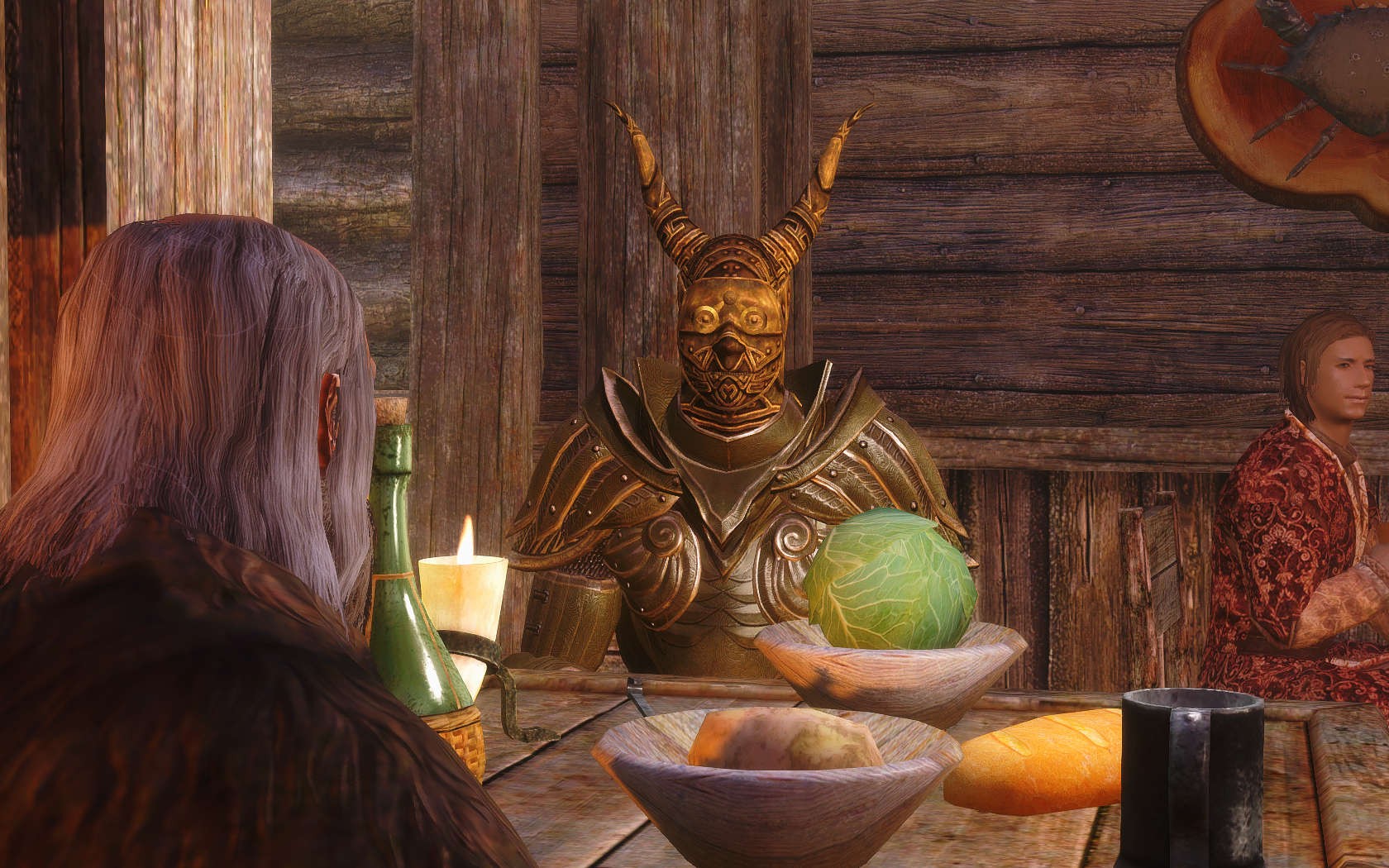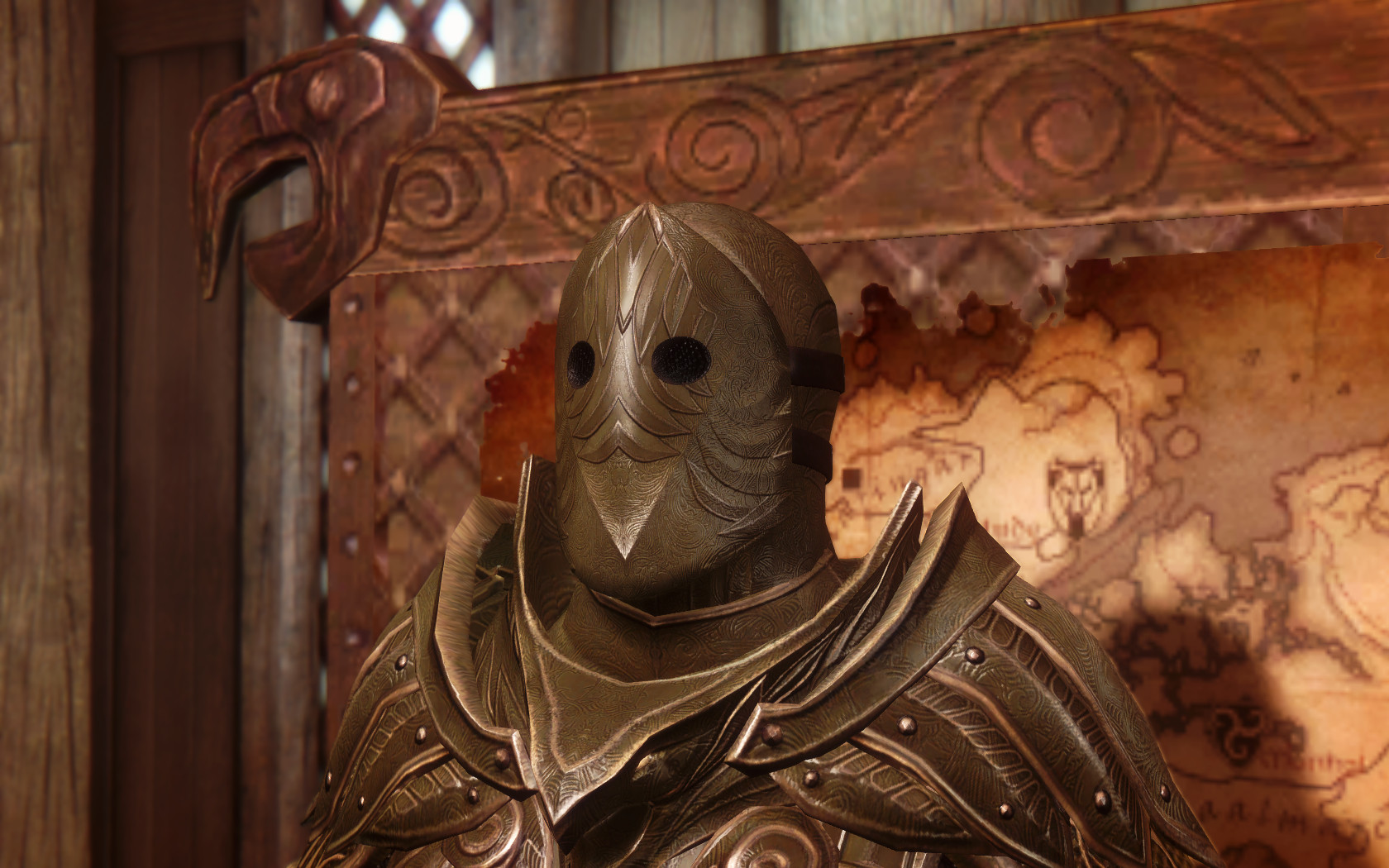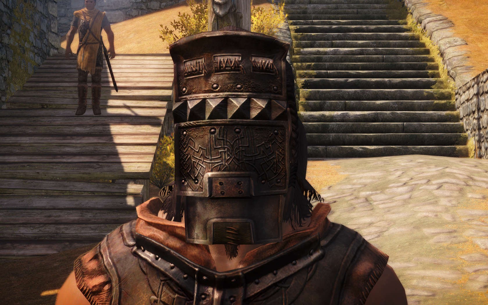 Очень много шлемаков из темных душ , молот Смоуга теперь молот мары , гробики на спинах , талморские шляпки , маска человека ворона (отсыкла на одного ютубера:) и чего стоит только костюм кротчи из Постола . Четко.Красиво.