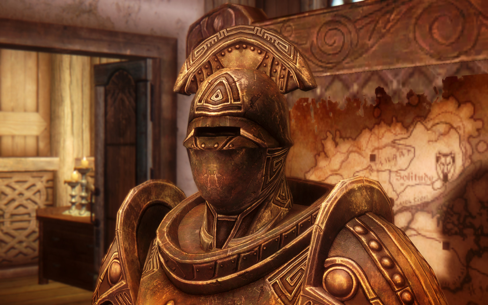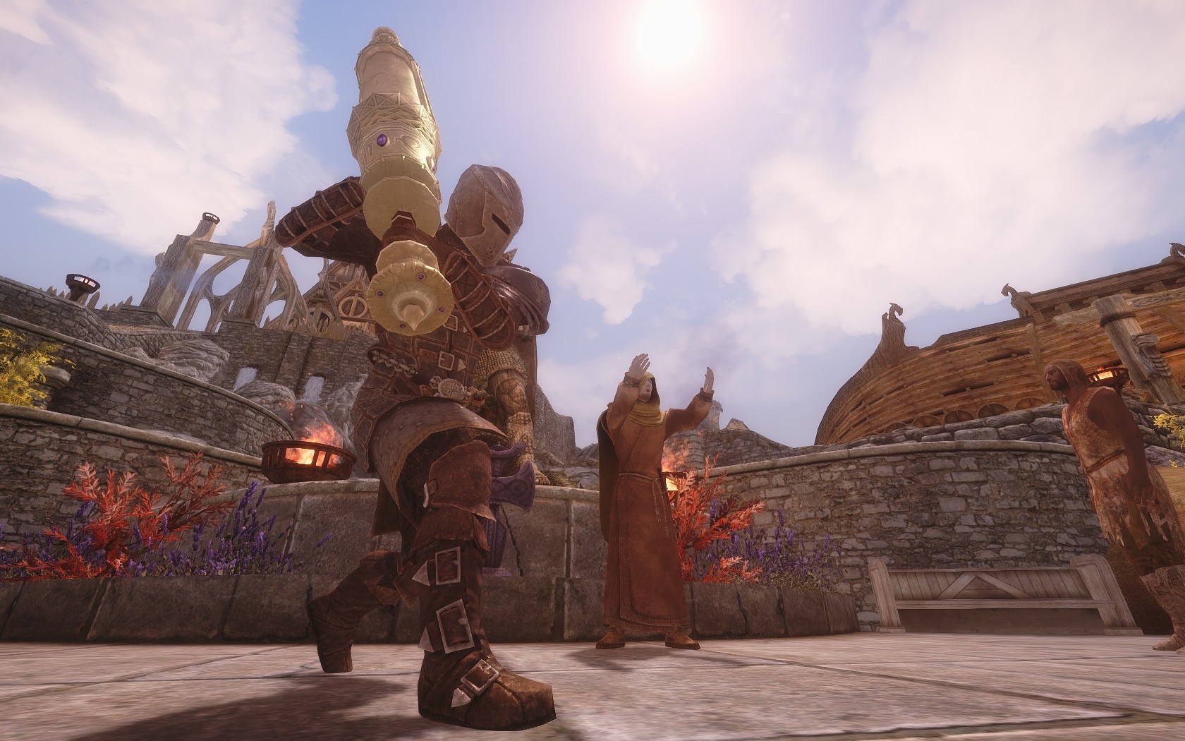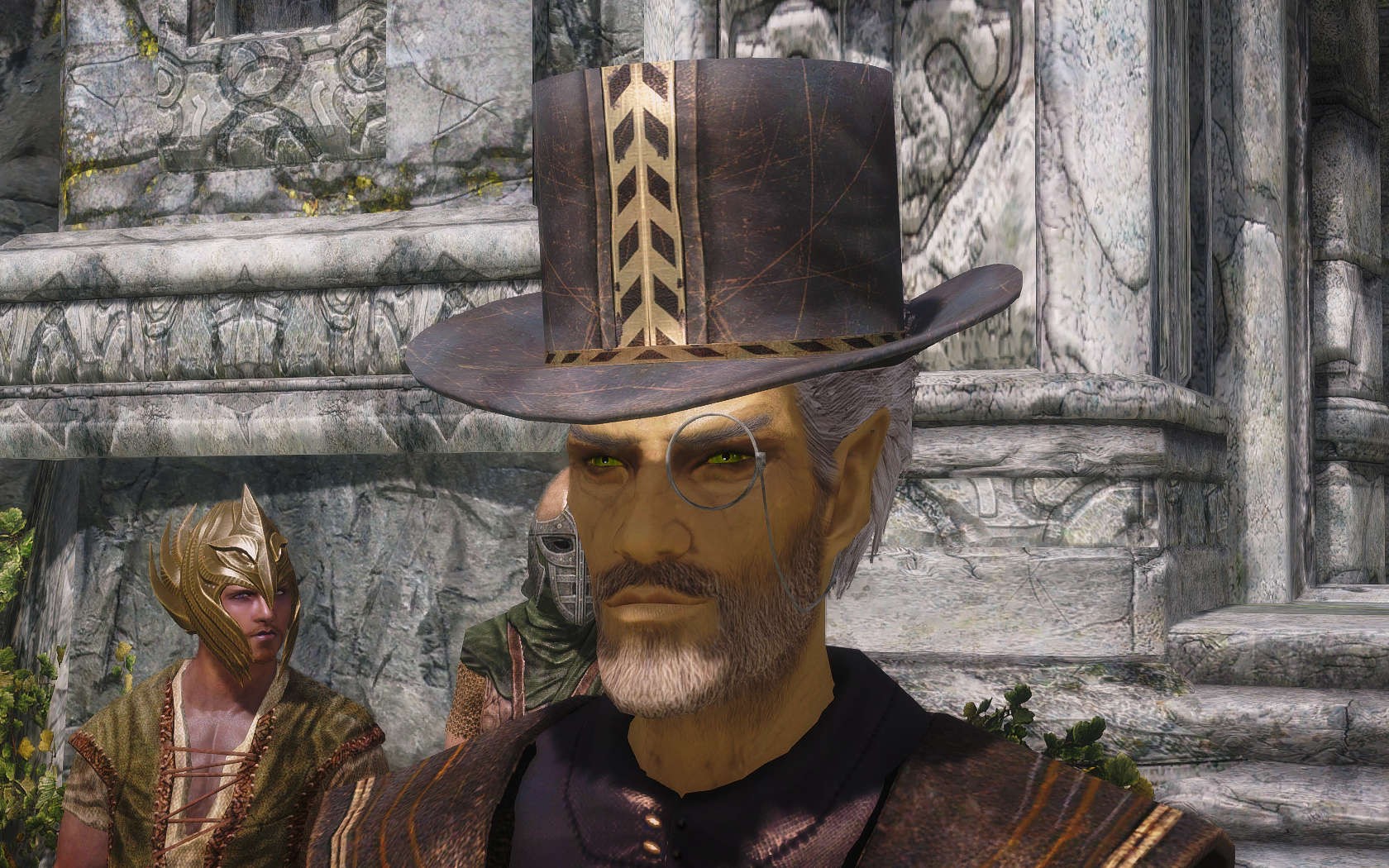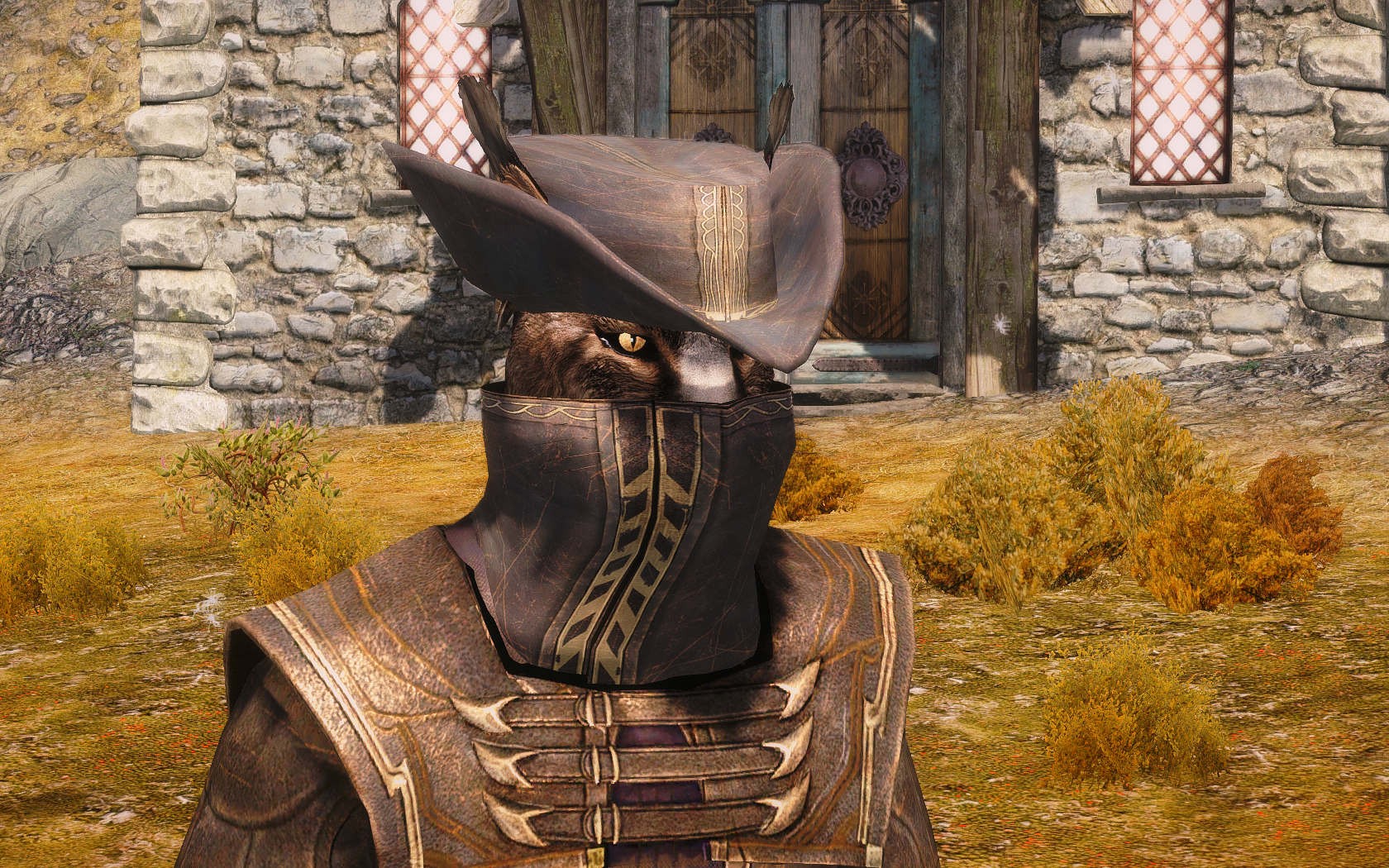 Очень много шлемаков из темных душ , молот Смоуга теперь молот мары , гробики на спинах , талморские шляпки , маска человека ворона (отсыкла на одного ютубера:) и чего стоит только костюм кротчи из Постола . Четко.Красиво.