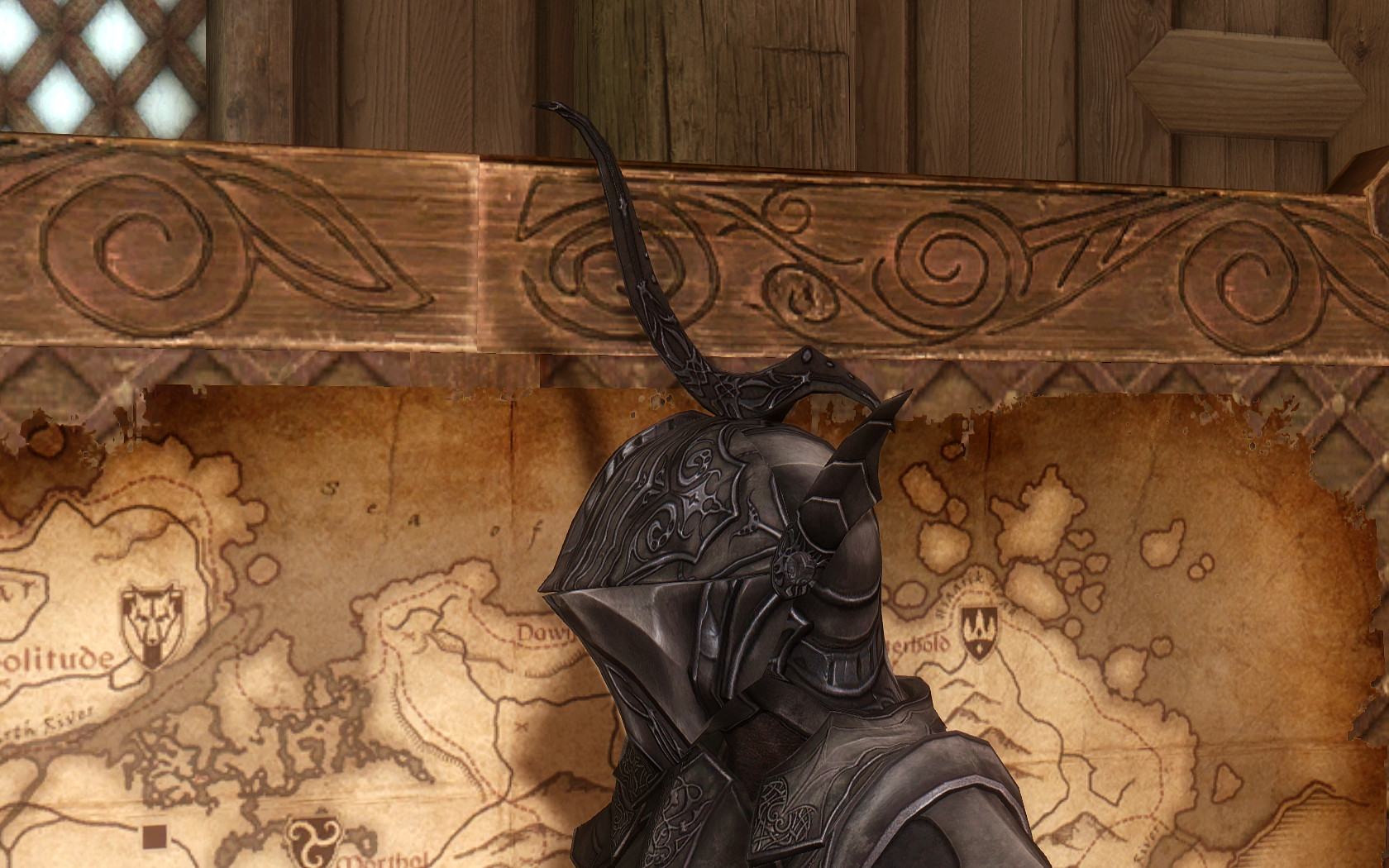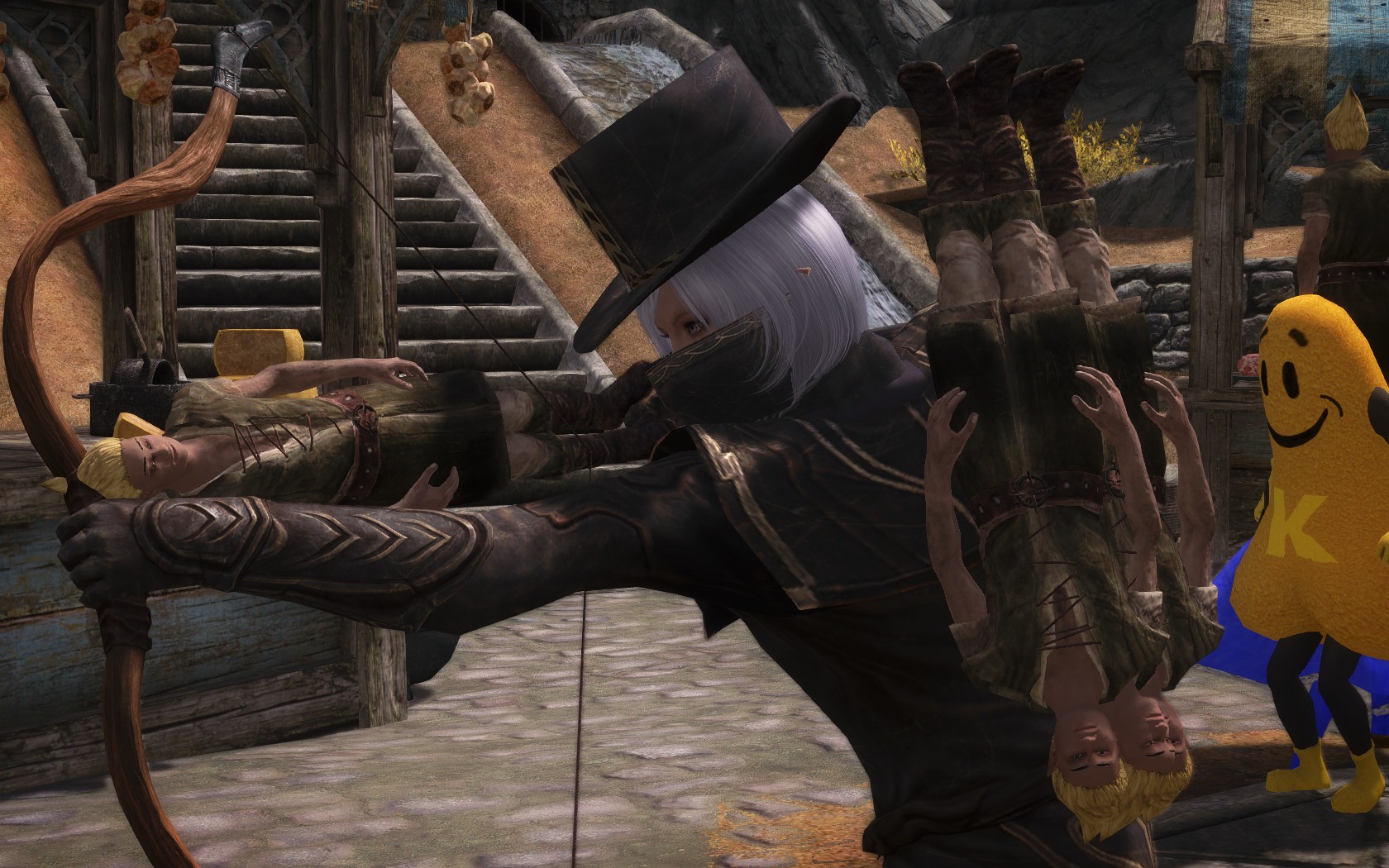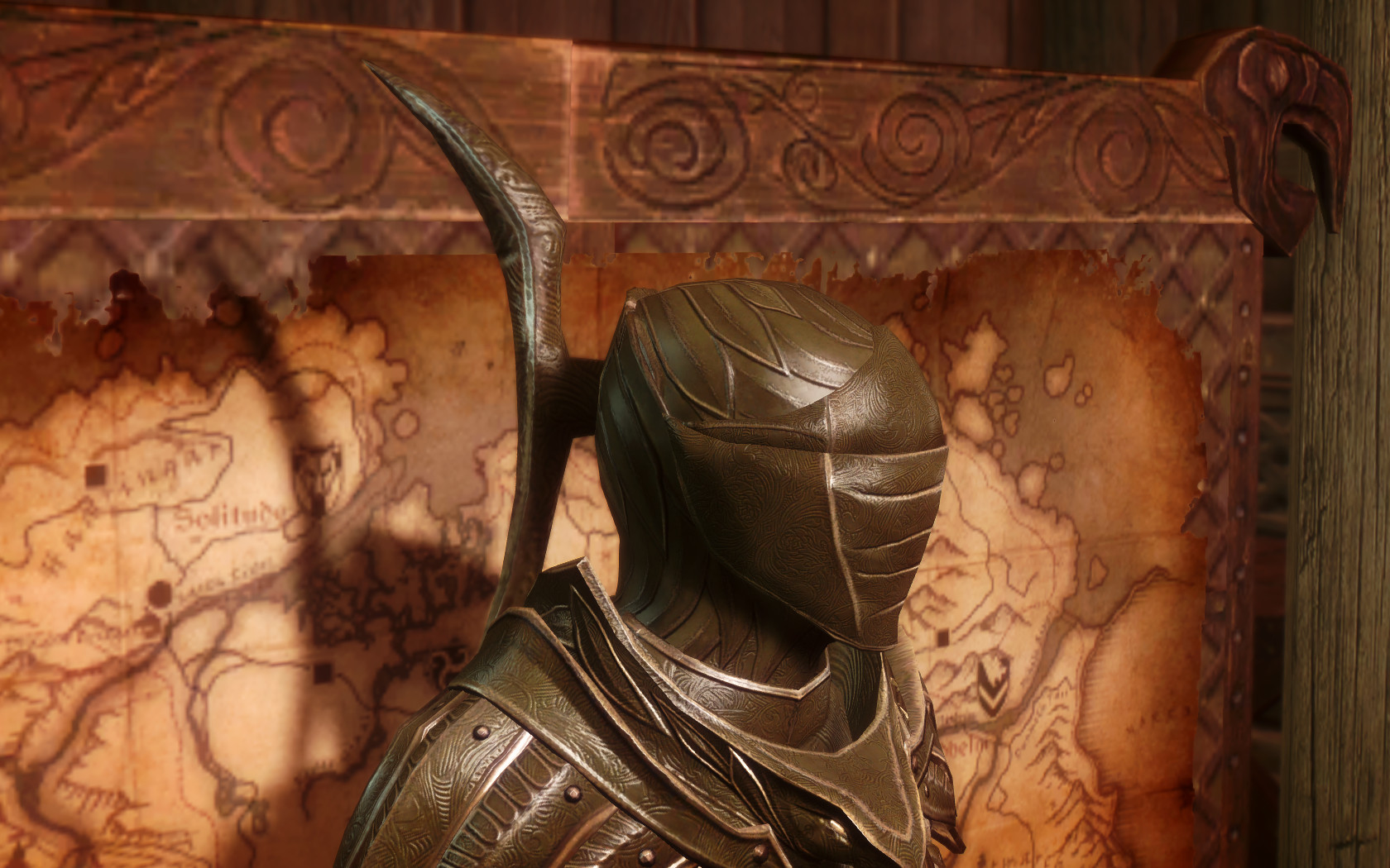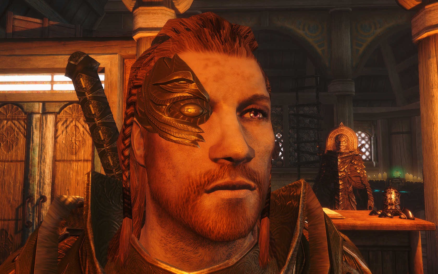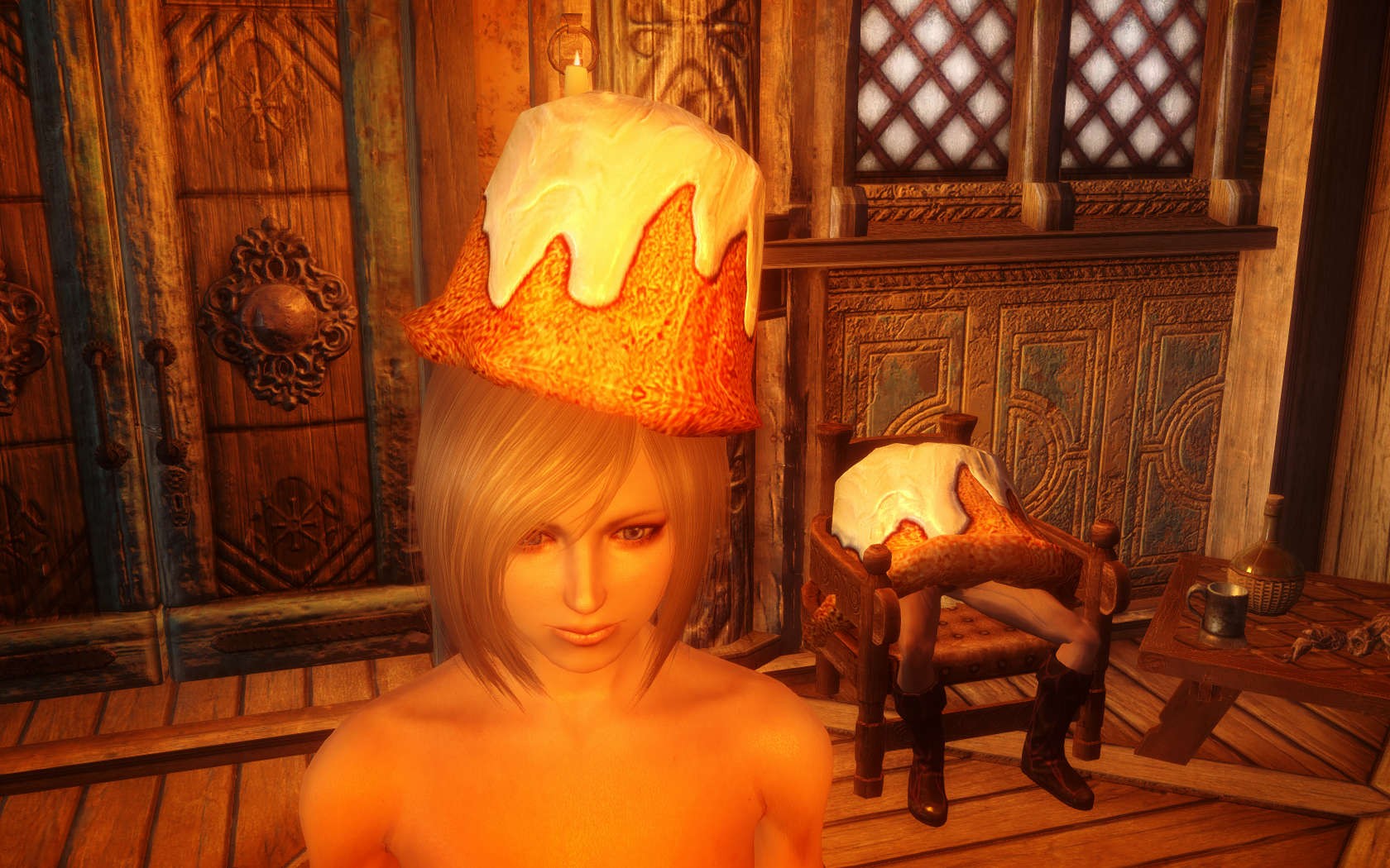 Очень много шлемаков из темных душ , молот Смоуга теперь молот мары , гробики на спинах , талморские шляпки , маска человека ворона (отсыкла на одного ютубера:) и чего стоит только костюм кротчи из Постола . Четко.Красиво.