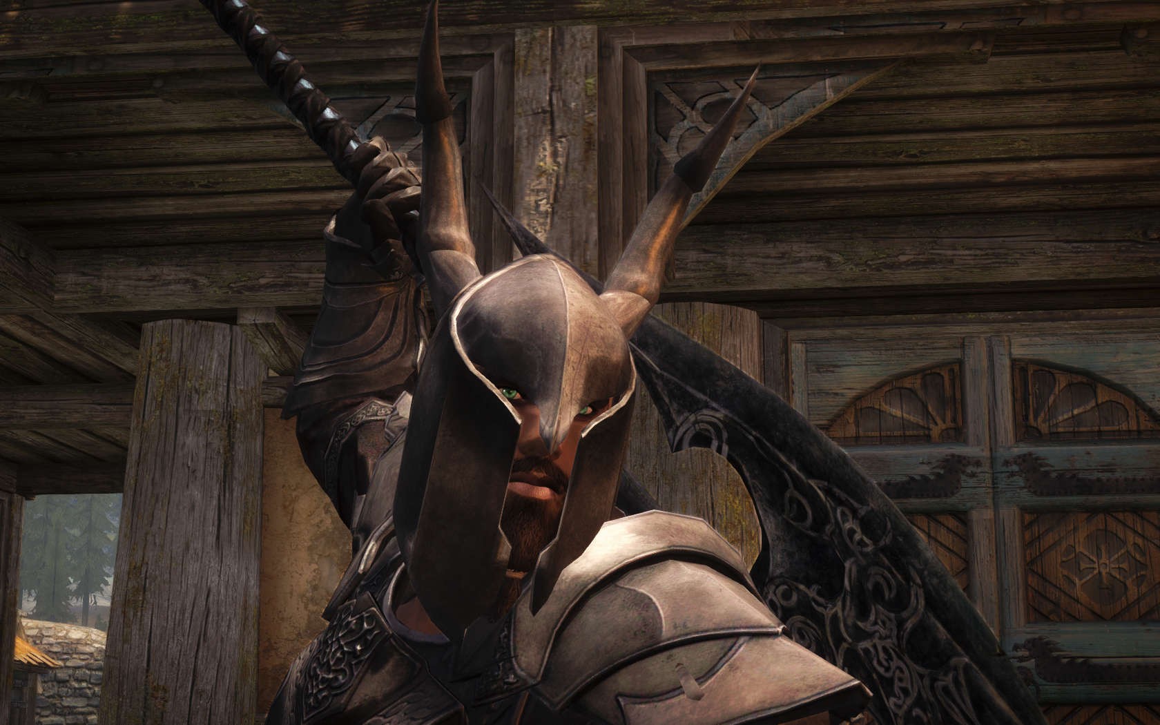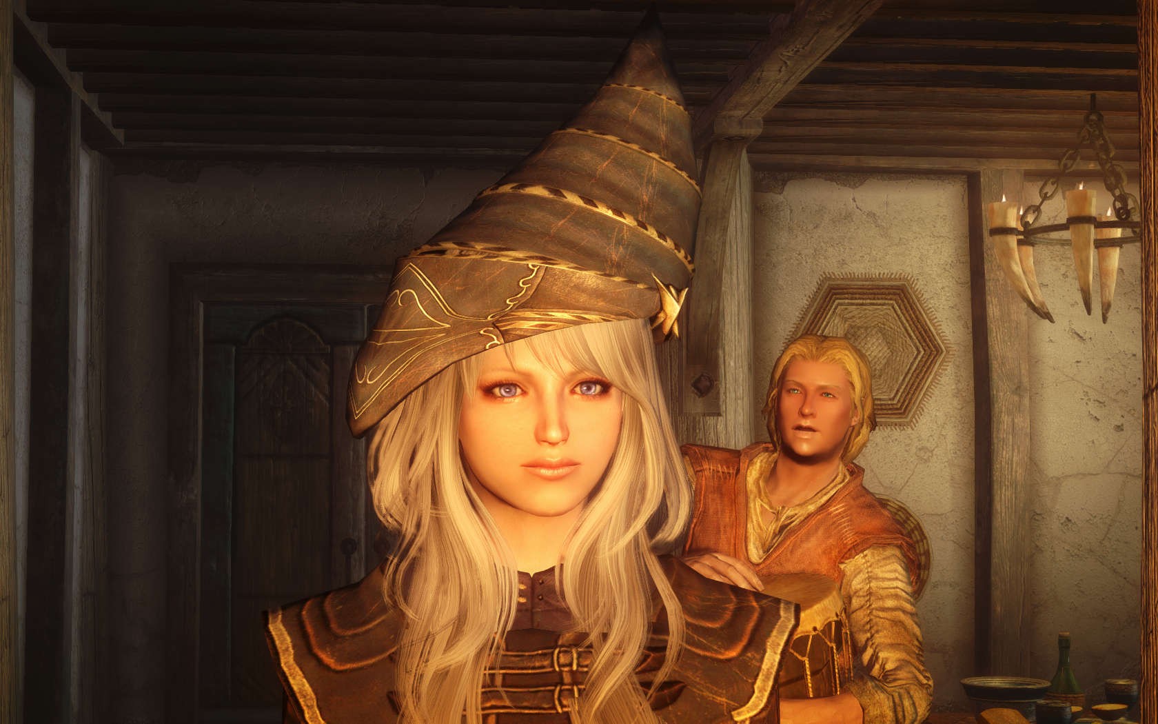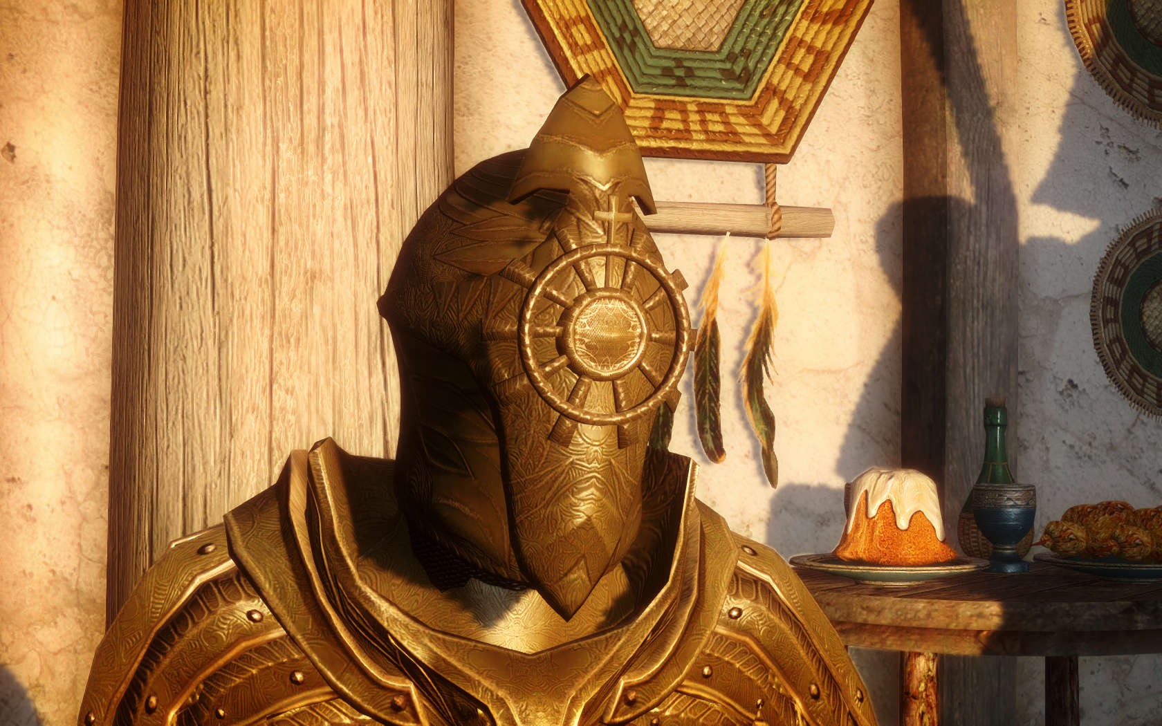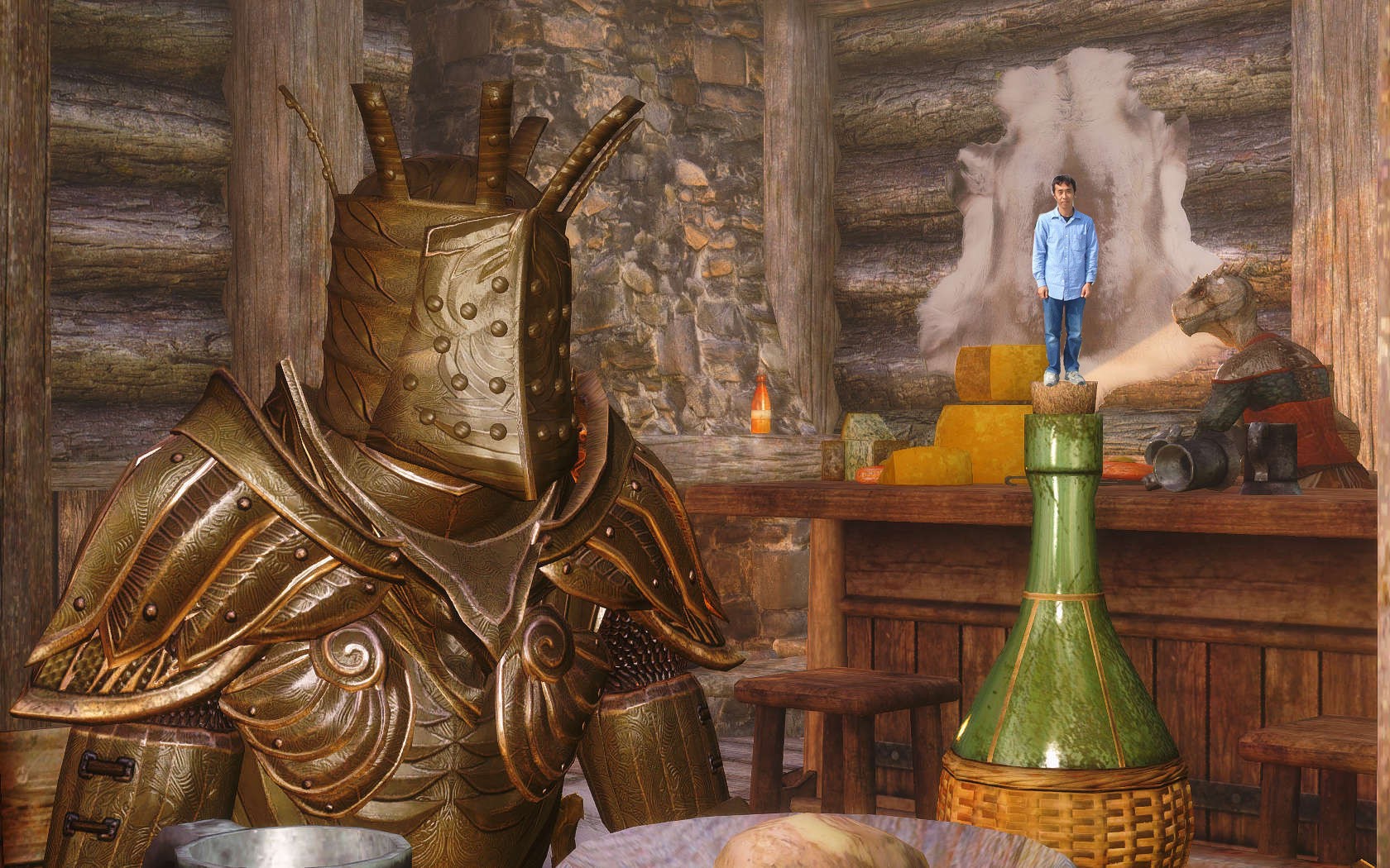 Очень много шлемаков из темных душ , молот Смоуга теперь молот мары , гробики на спинах , талморские шляпки , маска человека ворона (отсыкла на одного ютубера:) и чего стоит только костюм кротчи из Постола . Четко.Красиво.