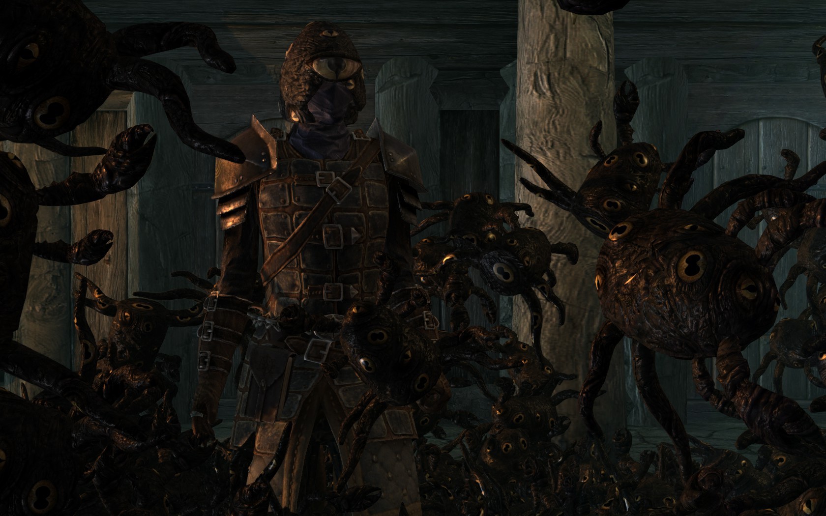 эти маски добавлены в левел листы? Воот это я жути хапнул. Монстер мод отдыхает. Бандюк с гробом для Довакина на спине несущийся на тебя это жуть полная. Когда на тебя нападают 3-4 лучника и начинается брёвнопад ааааааааааааааааа