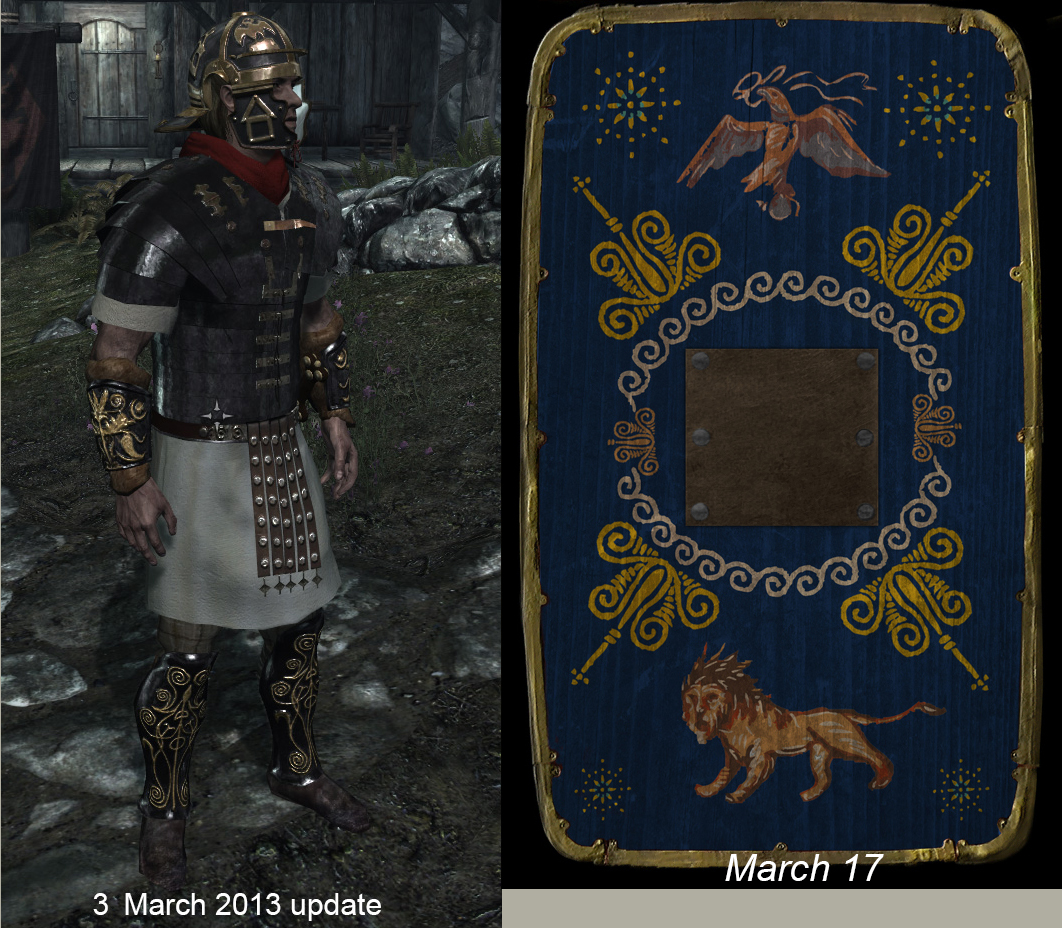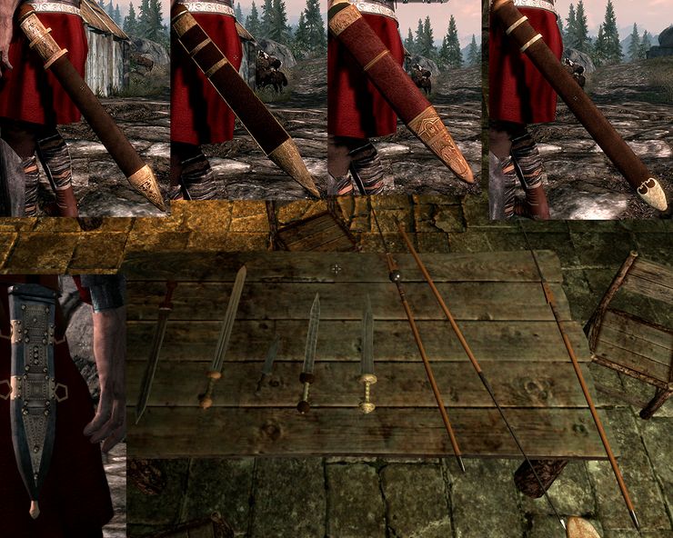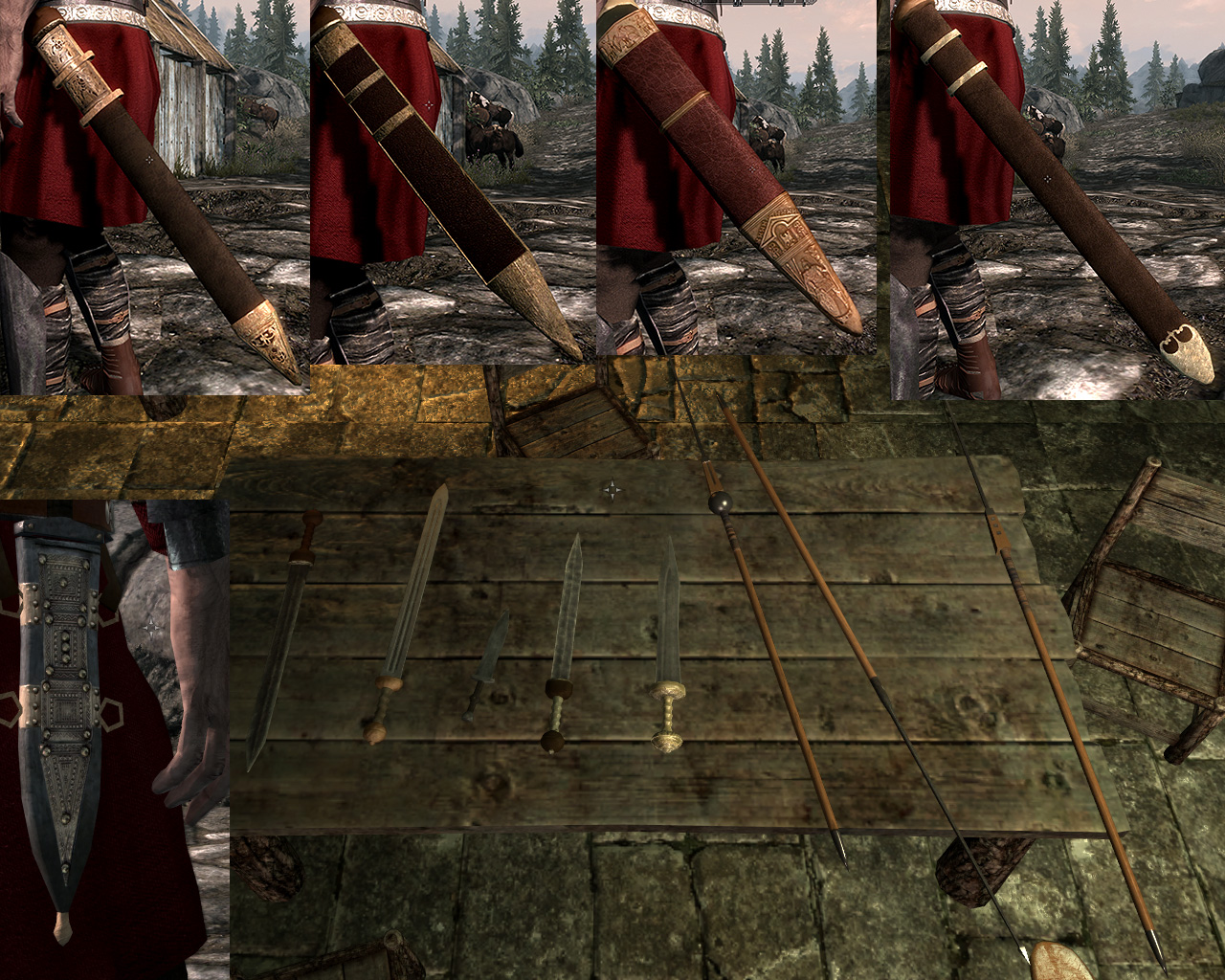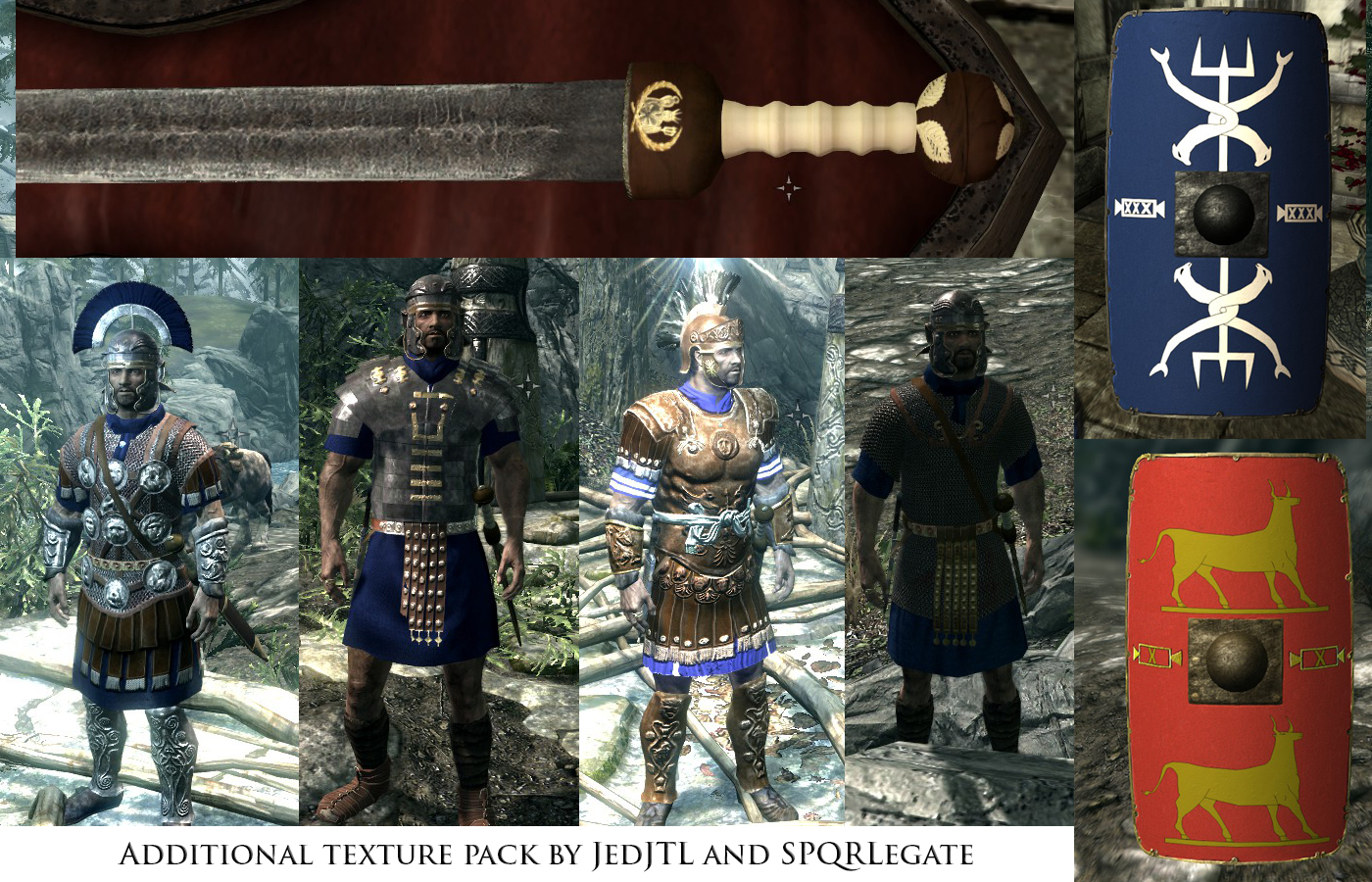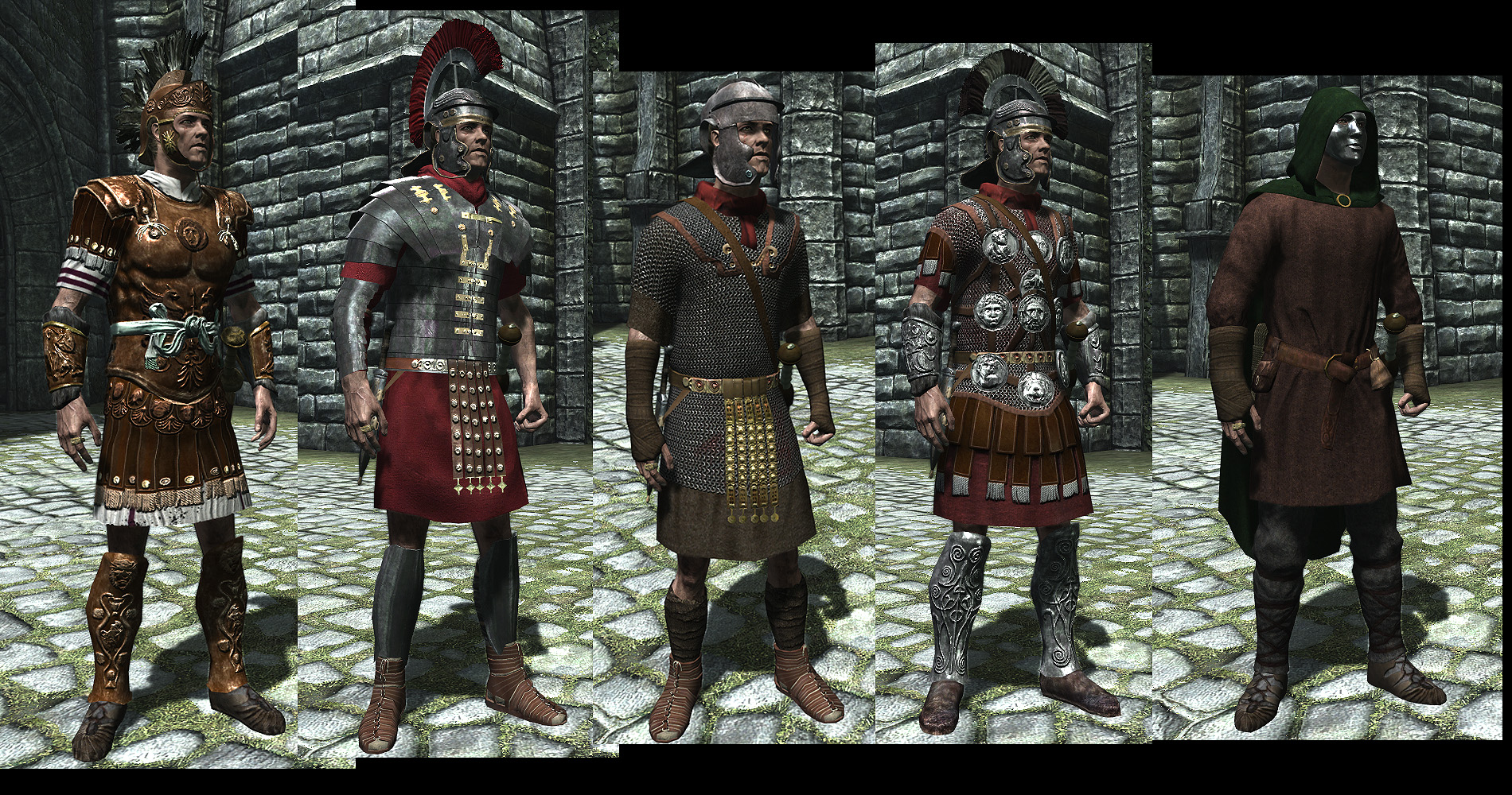 Мод добавляет множество комплектов брони и оружия эпохи Римской империи. Предметы вы сможете выковать в кузнице в разделах железного, имперского, стального, драгоценностей, а также на дубильном станке или же найти в оружейной дверь в которую находится в Мрачном Замке за генералом Тулием (вход на карте не отмечен), кузнец Солитьюда также продает некоторые предметы
