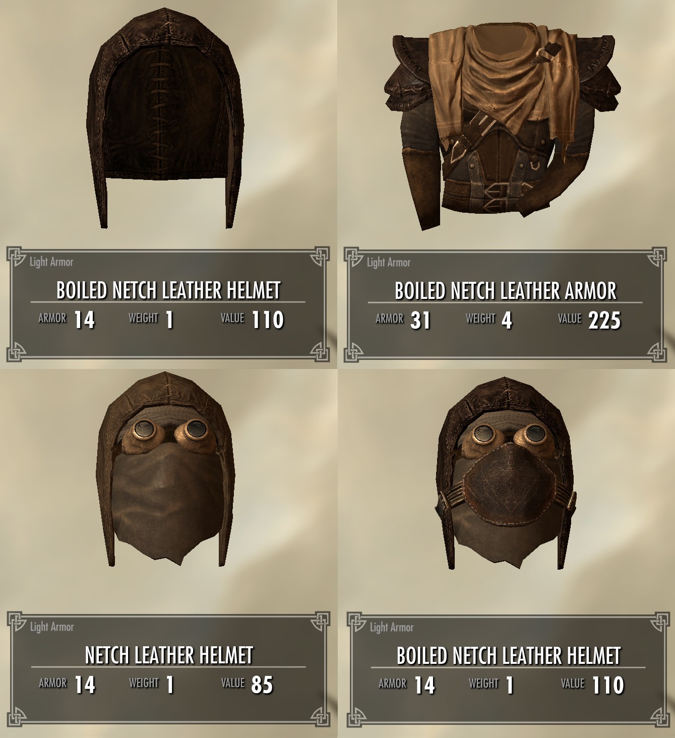 - Мод добавляет лорный комплект сбалансированной легкой брони, включающий несколько вариантов шлемов, кирау, наручи, сапоги и щит, а также улучшенный вариант из дубленой кожи нетча.