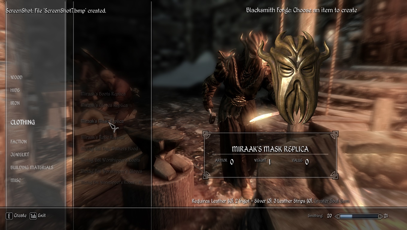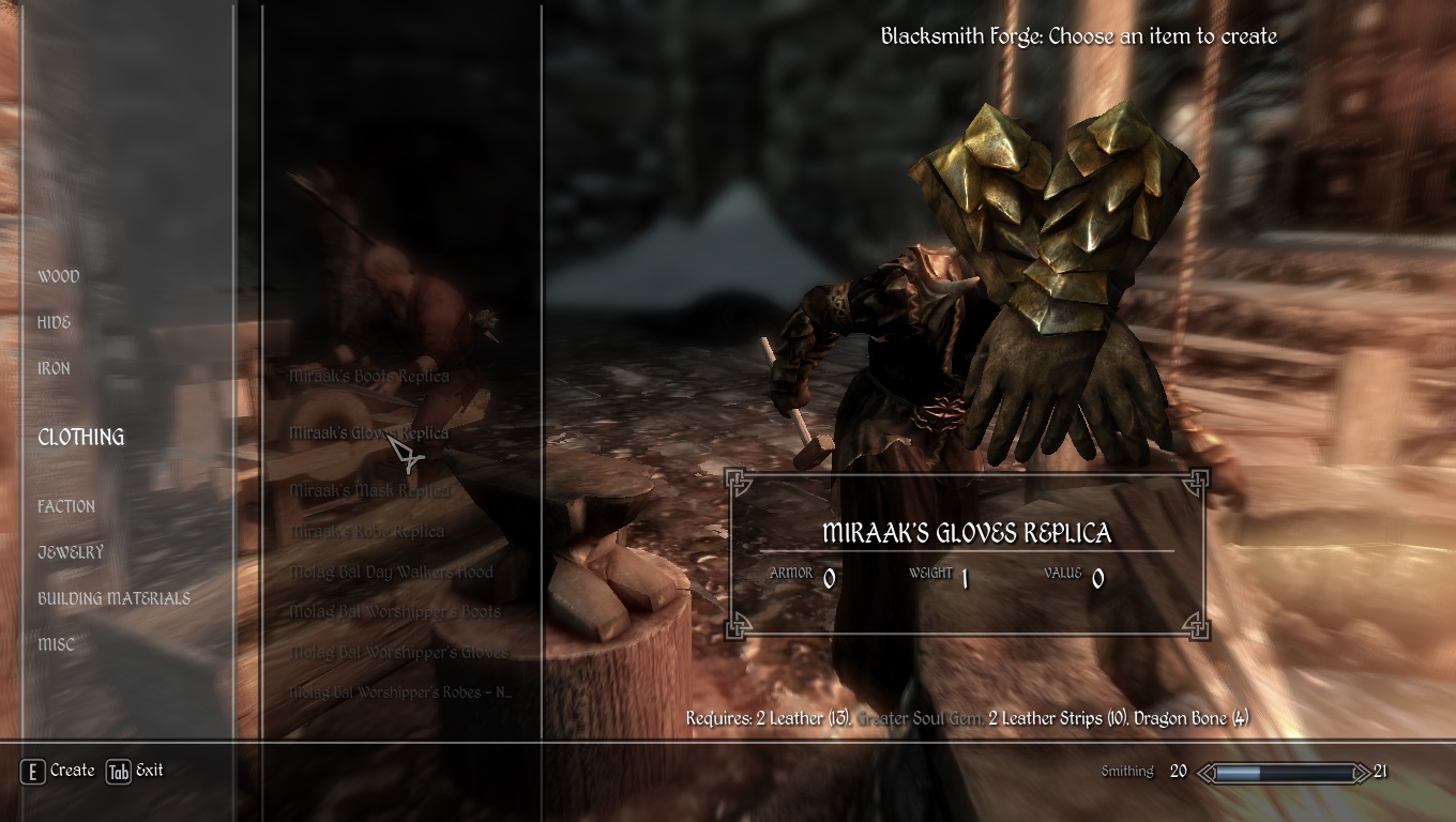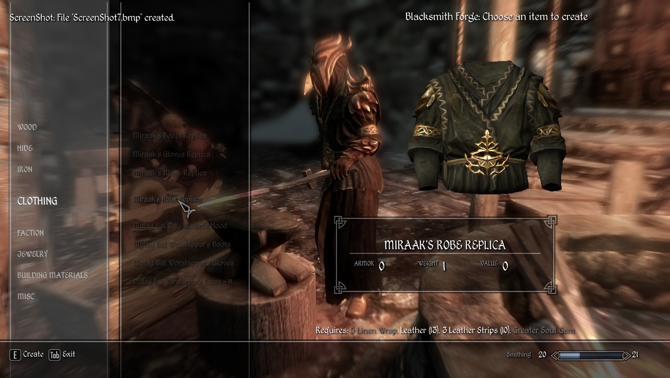 Данный мод дает возможность игроку создать Одеяние Мирака в любой кузнице Скайрима. Мод работает с другими модификациями, изменяющими текстуру одеяния. Возможность создания появится после завершения миссии " На вершине Апокрифа"