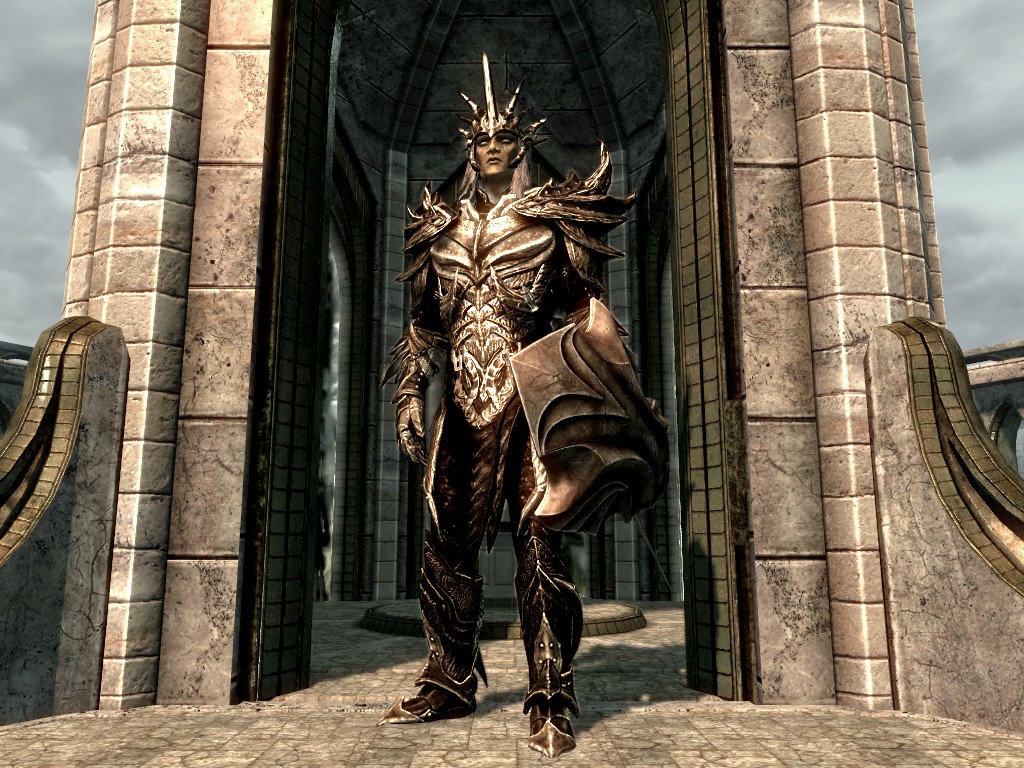 Как-то не впечатлило. Думала, раз броня бога, то и защита должна быть хорошей, а оружие должно быть мощным, но... Бронька в инвентаре выглядит как даэдрическая, а корона похожа на Зубчатую. На оружие даже зачаровалки нет. Да и улучшить нельзя. Просто тупо лежит в подвале сундука вместе с другими трофейными броньками.
