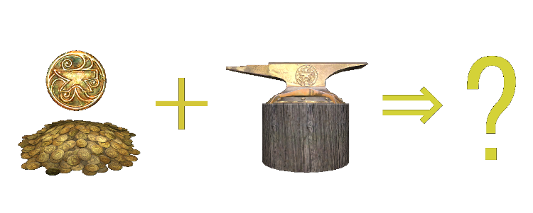 У продавца покупаете монеты (или создаете из золотых слитков там же) и крафтите, понравившийся шмот в тамошних наковальнях.