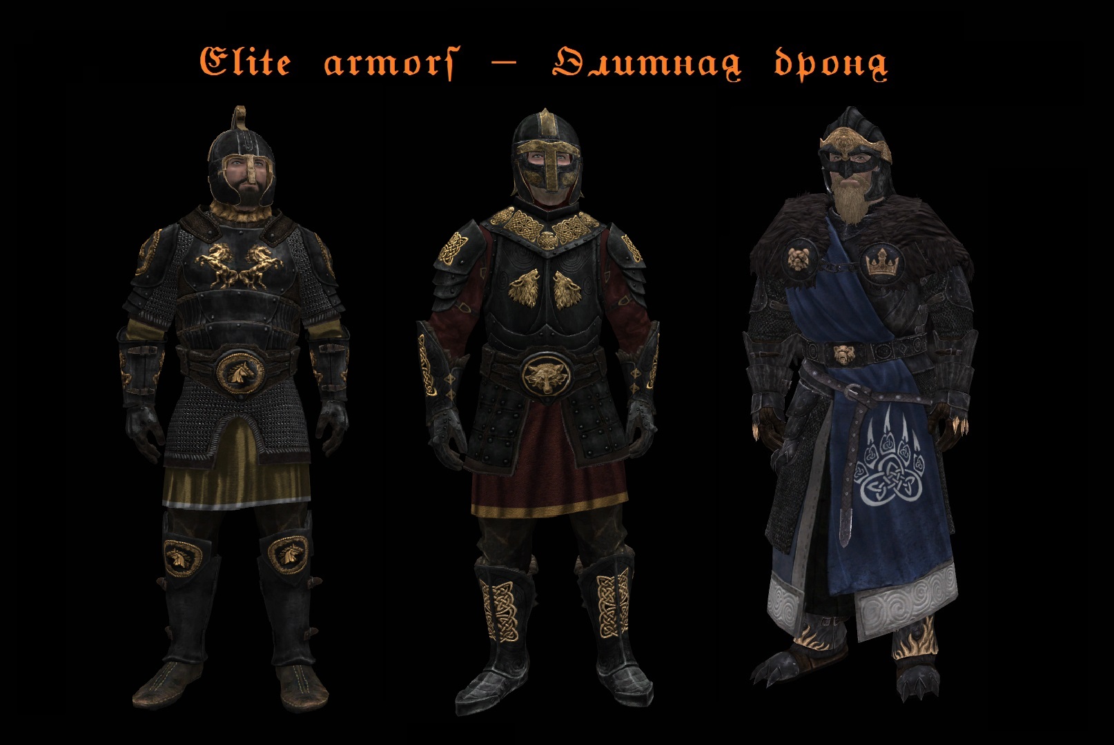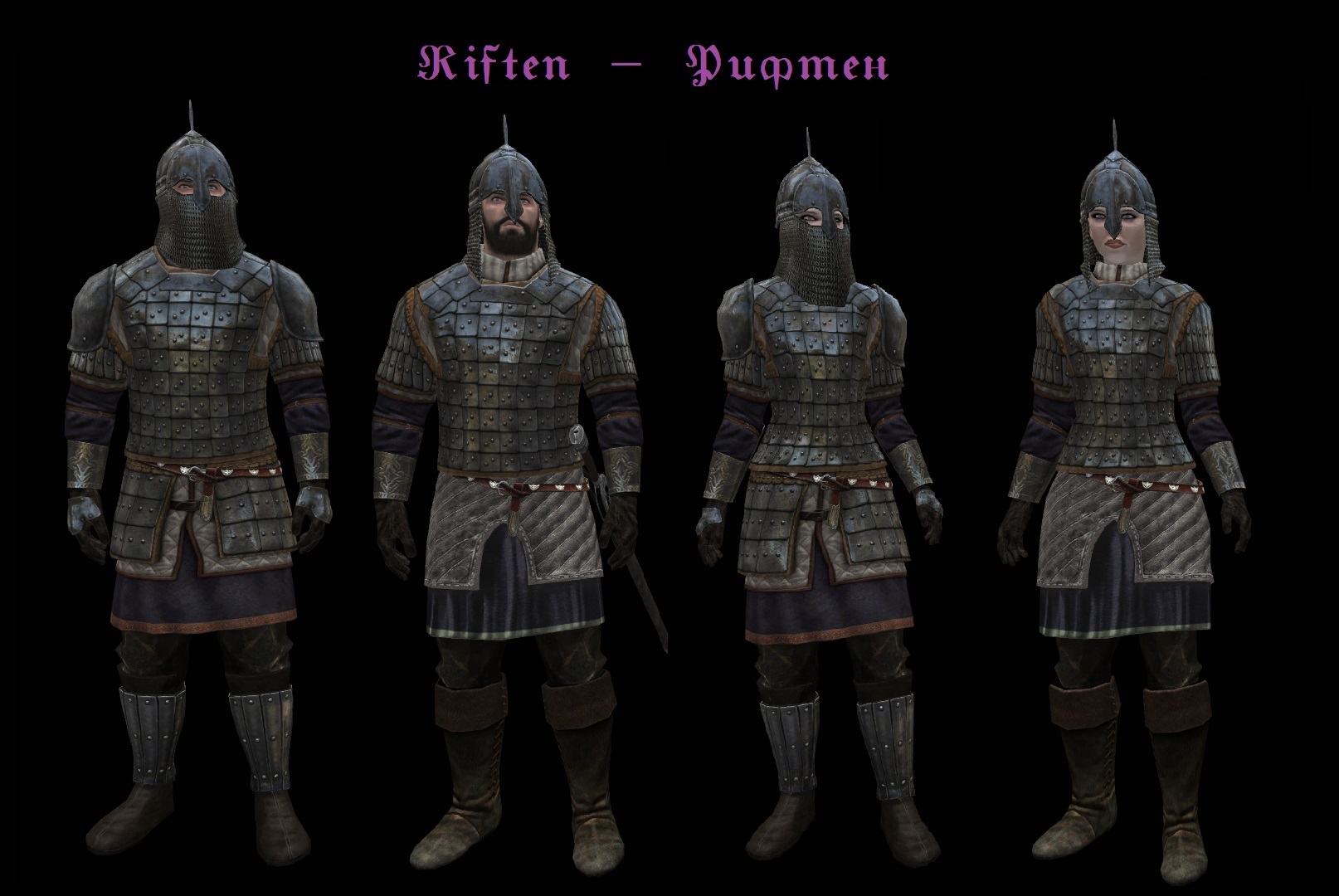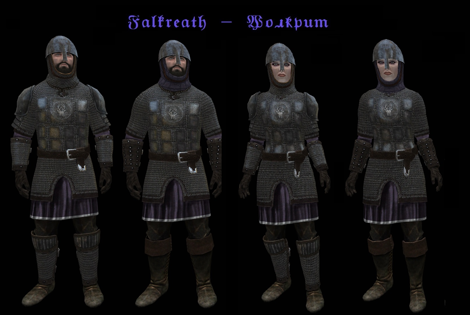 Vaultman30 - на доспехах Фолкрита, Морфала и Вайтрана, а так же шлемах Солитьюда и Вайтрана использовались меши, как основа для моделей. Ну и щиты Морфала и Братьев Бури тоже являются творением автора.