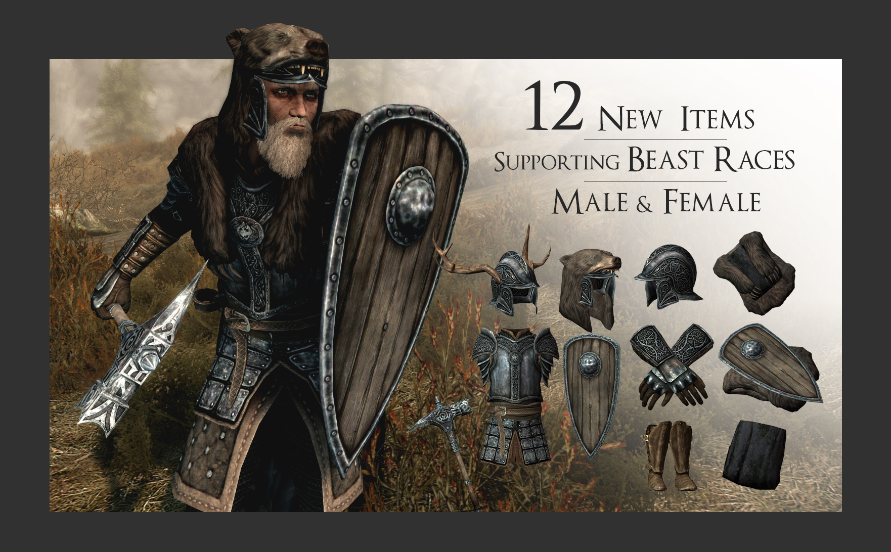 кирасу, перчатки, сапоги, три вида шлемов, три вида плащей, щит, молоты - двуручный и одноручный.