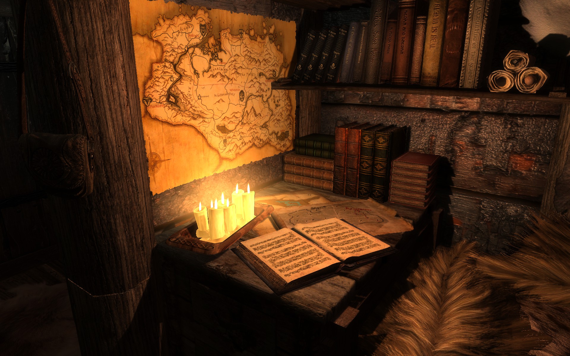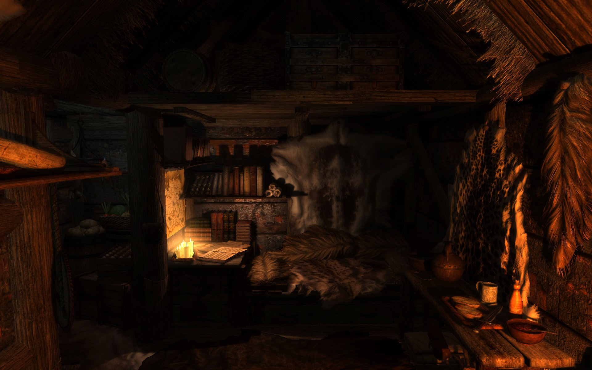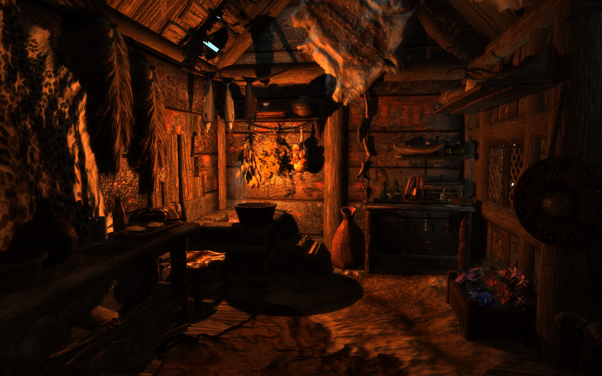 В хижине есть только самое необходимое для воина: кровать, котелок, алхимическая лаборатория, книжные полки и небольшие контейнеры для хранения.