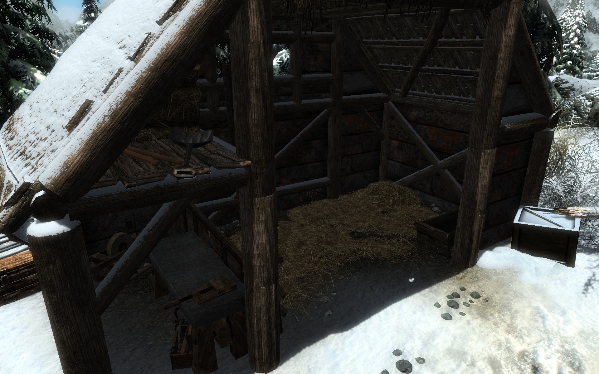Присутствует конюшня с точильным камнем, верстак и рубочная колода.Кузницы и плавильни нет (в конце концов, Довакин не кузнец, а воин).