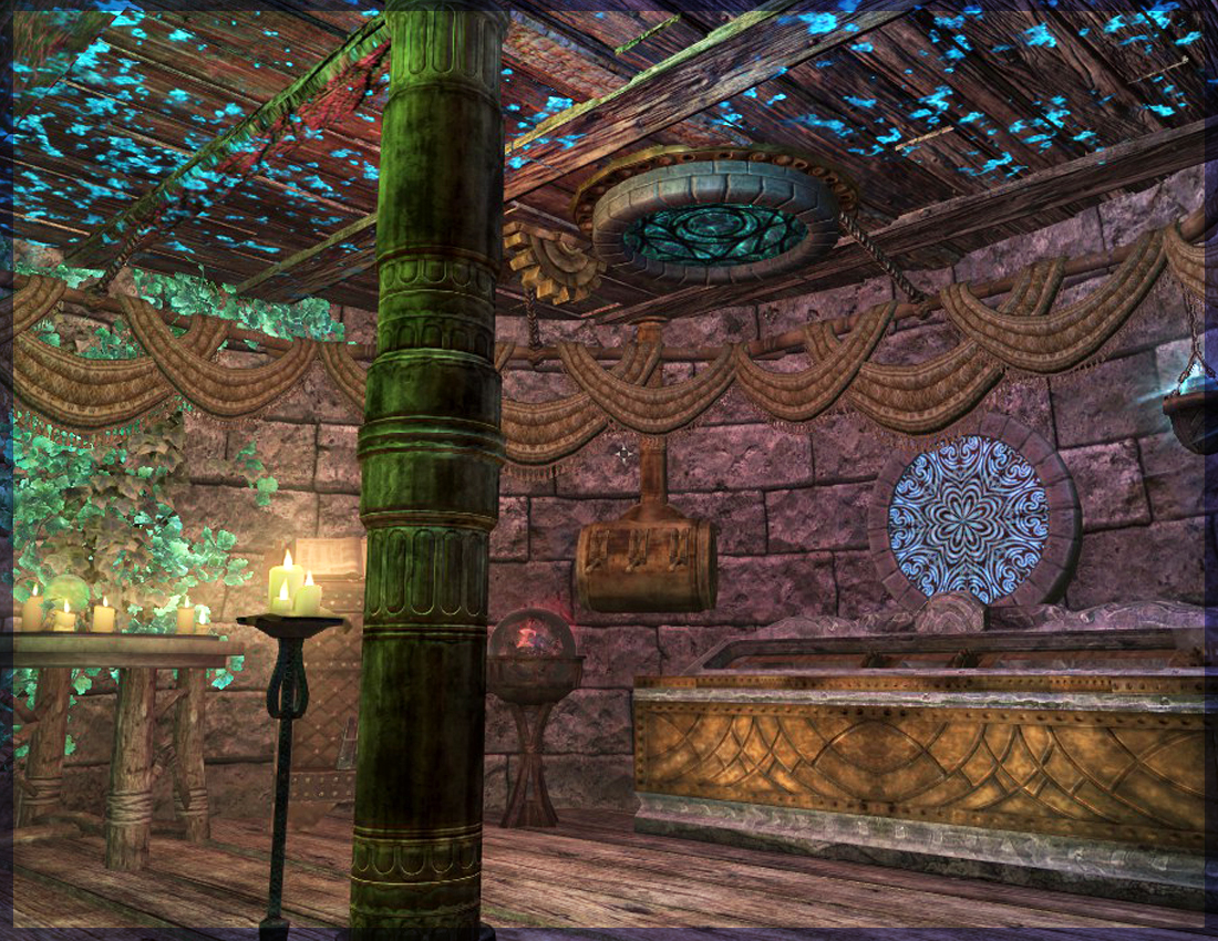 На втором этаже маленькая комната со столом зачарователя и алхимической лабораторией. У нее собственная система освещения, регулируется рычагами.
