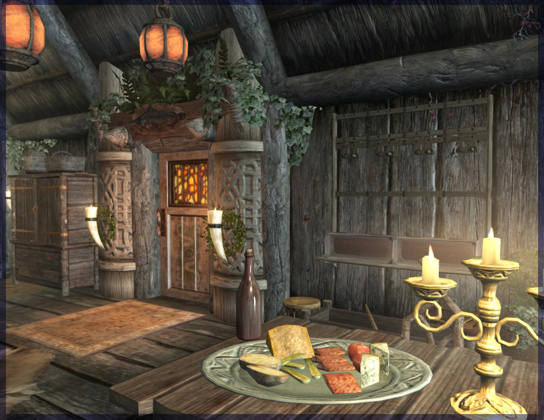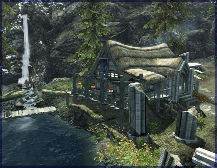 На участке располагаются следующие украшения: символика дома Редоран, руины снежных эльфов, грибы дома Телванни. Они гармонично смотрятся с домом в нордском стиле, в то время как сама резиденция прекрасно вписывается в атмосферу близлежащего города Ривервуд и выглядит как неотъемлимая часть ландшафта.