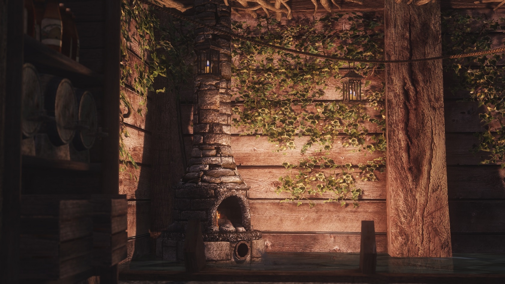 В главной комнате находится бар, кухня и уютная зона отдыха у камина. За баром вы найдете лестницу на второй этаж и дверцу в полу, ведущую в подвал.