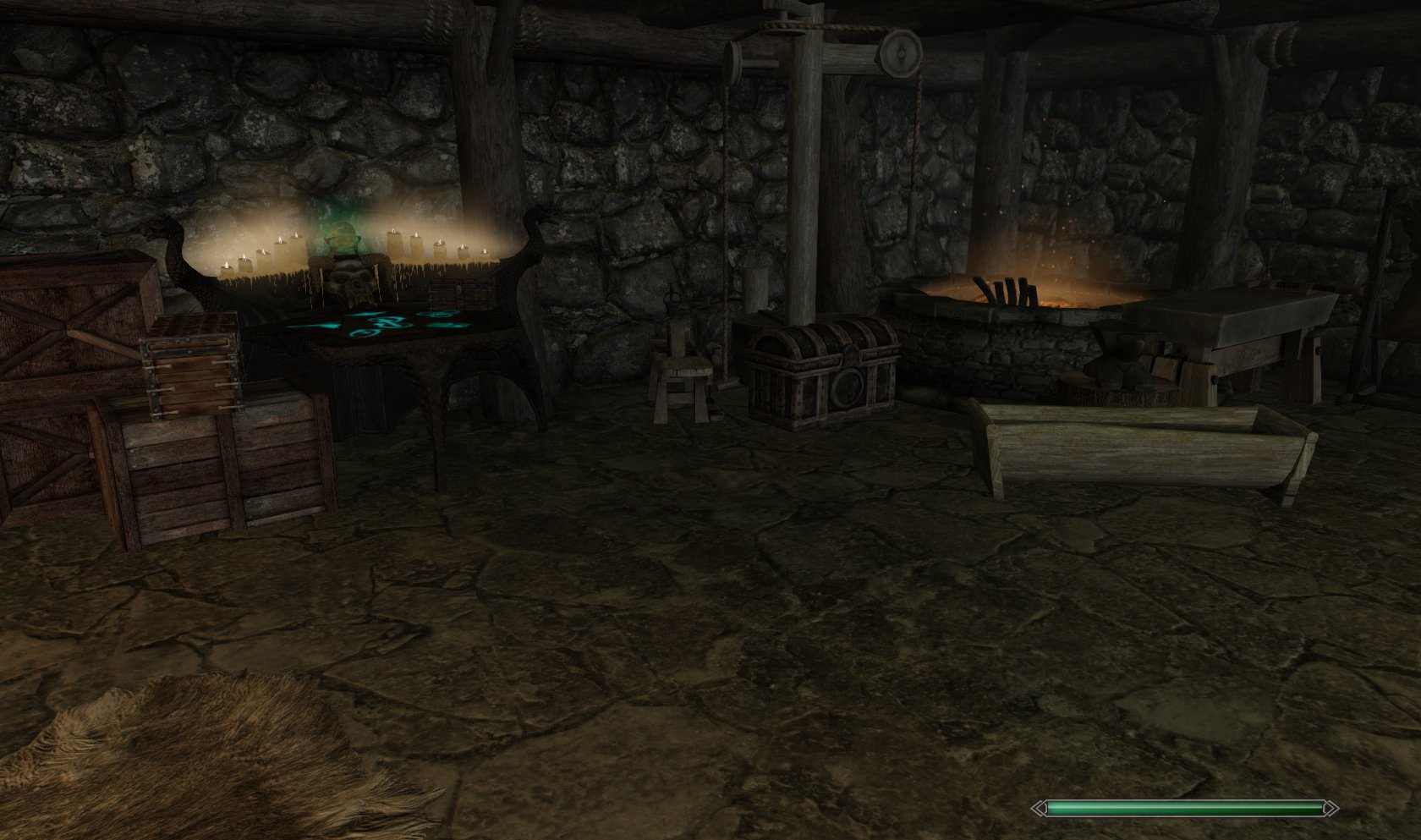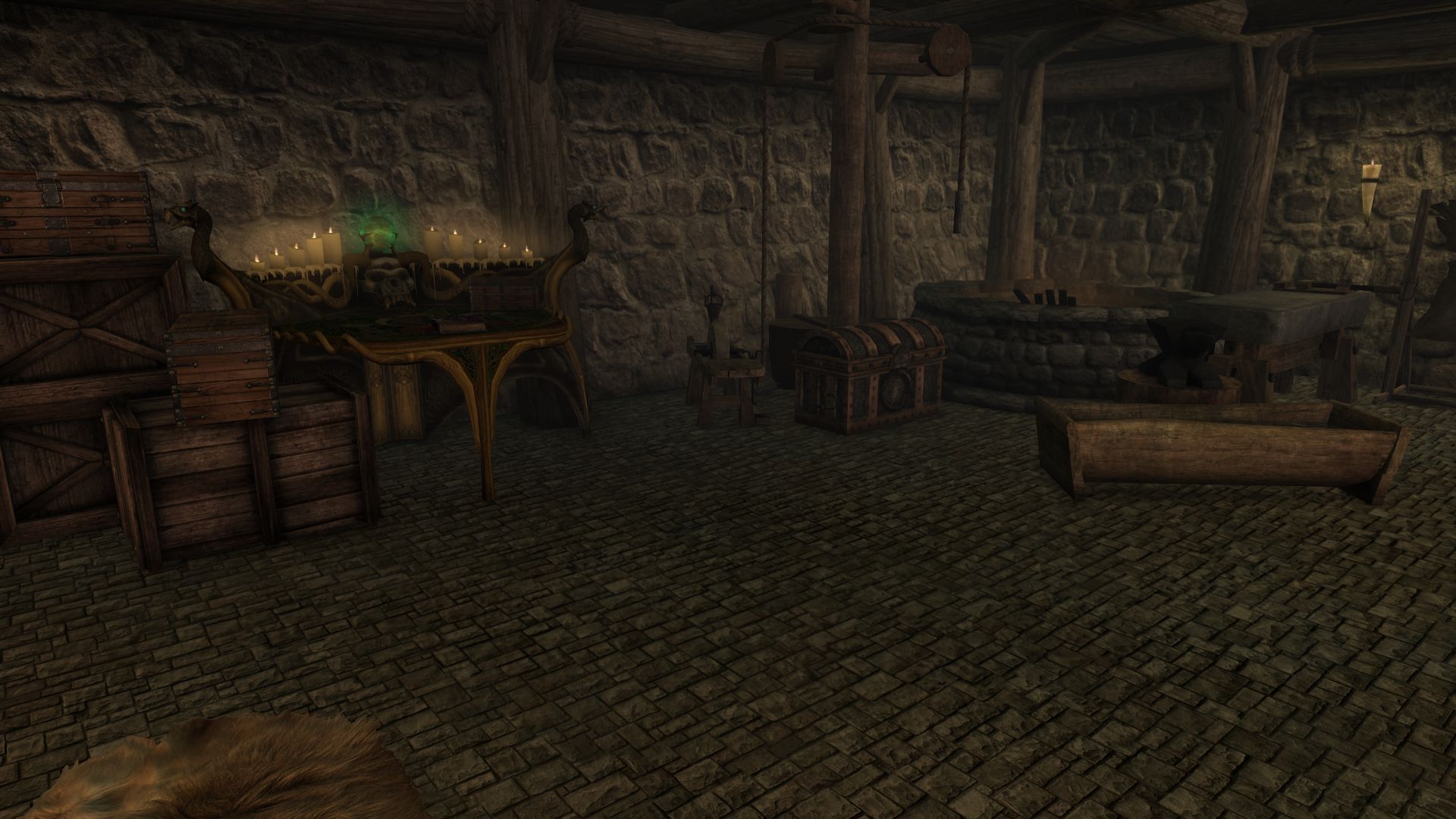 модов или просто как дом игрока. Попасть в дом можно надев кольцо, которое добавится в инвентарь после подключения мода. Дом состоит из одной комнаты и двух камер. В доме есть станции крафта, сундуки, трон и торговец Лагерта. Внутри играет приятная музыка. Камеры можно открыть только ключом. Также в доме можно найти том с заклинанием телепортации NPC в тюрьму. Просто примените заклинание на нужном NPC. Чтобы вернуть NPC на прежнее место, надо вновь использовать заклинание телепортации на этом NPC.