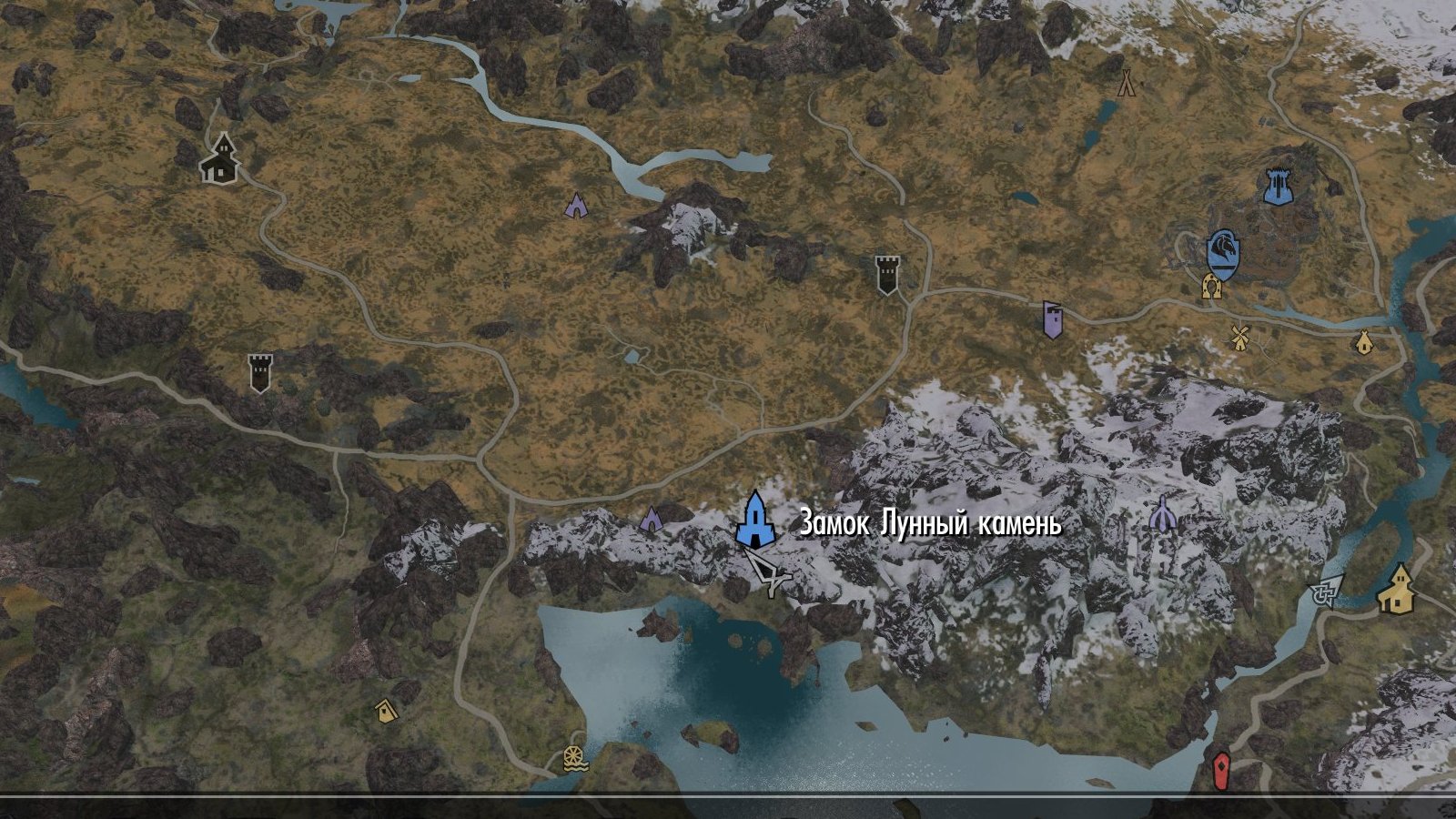Замок "Лунный камень" - это эльфийский замок, который является домом игрока. Находится он к юго-западу от Вайтрана на склоне горного хребта. Нажмите на табличку на стене у входа для покупки замка. Покупка обойдётся вам в 20000 монет. Внутри замка множество больших комнат; бассейны с автораздеванием NPC; спальни для вас, ваших детей, компаньонов, стражников и жителей замка; выставочный зал с большим количеством манекенов, стоек для оружия и подставками под уникальные предметы; подвал в вампирском стиле. Есть поддержка мода Hearthfire multiple adoptions. В одной из комнат можно найти том с заклинанием телепортации, с помощью которого можно мгновенно переместиться в замок из любой точки Скайрима.