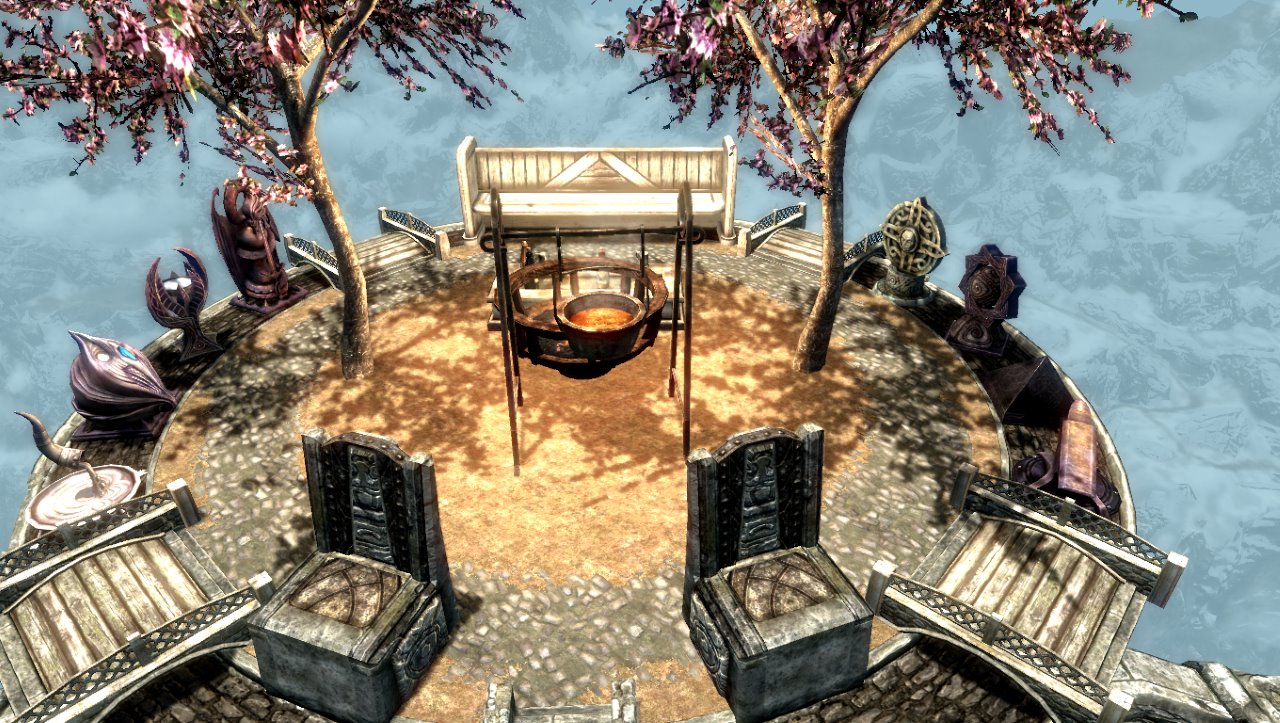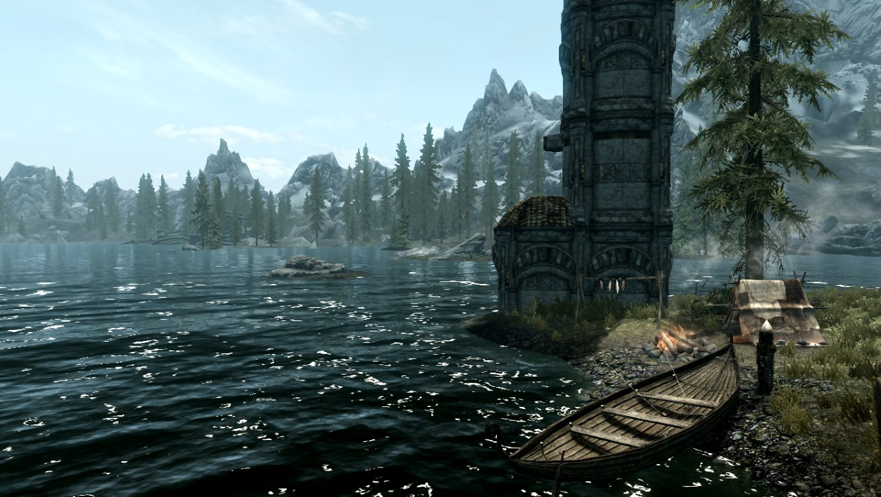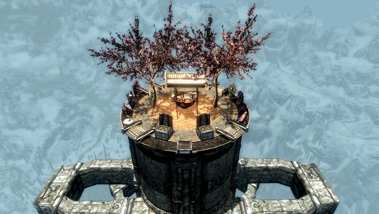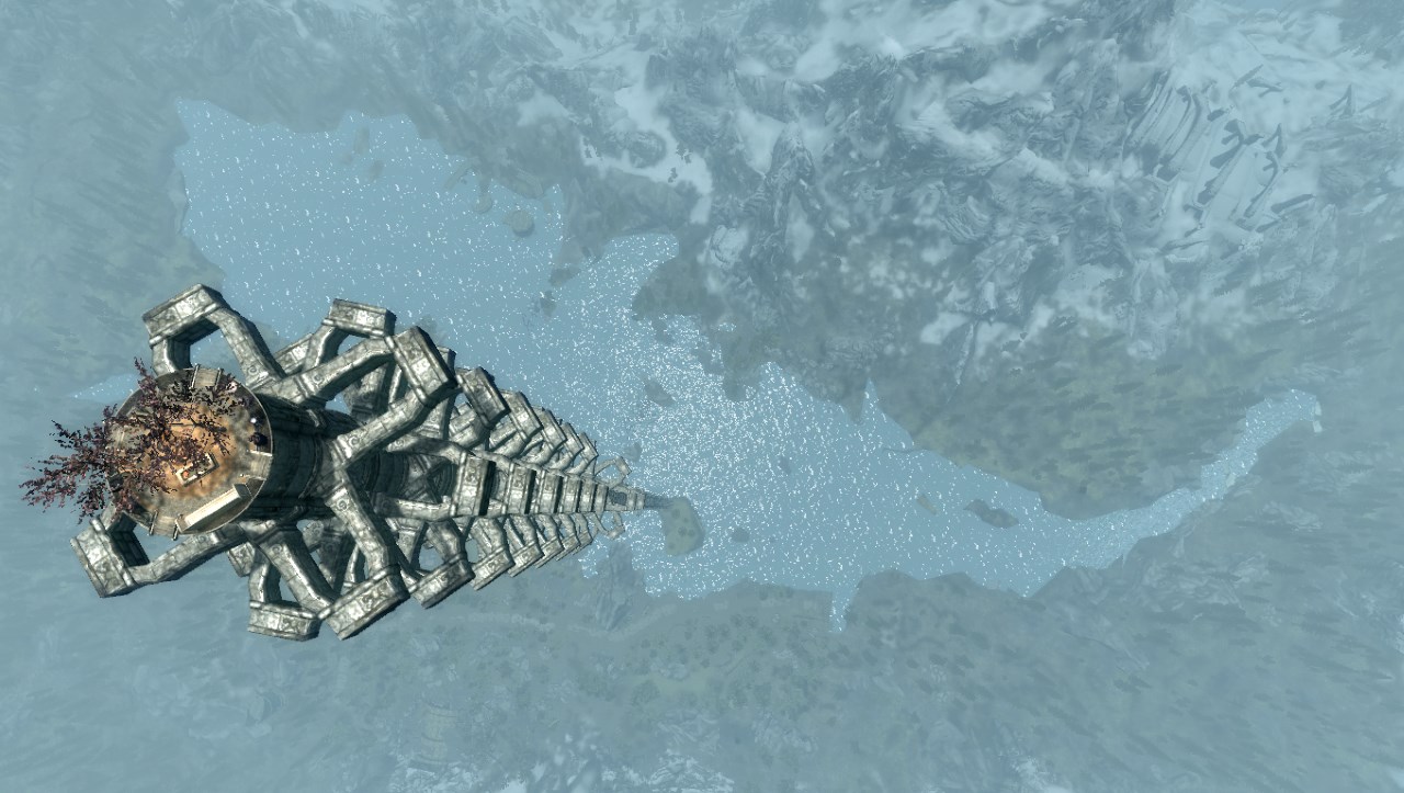 Двемерский Небоскреб Фолкрита на озере Илиналта. Место, где можно отдохнуть, приготовить еду и насладиться панорамой всего Скайрима с огромной высоты.