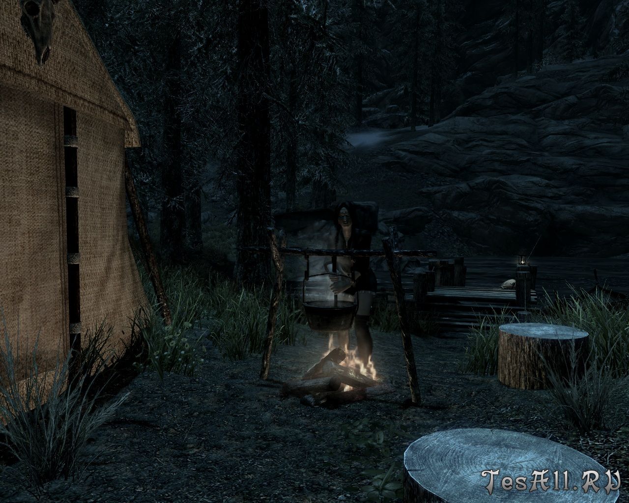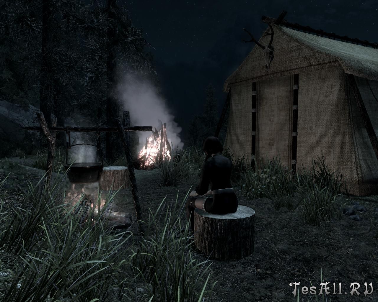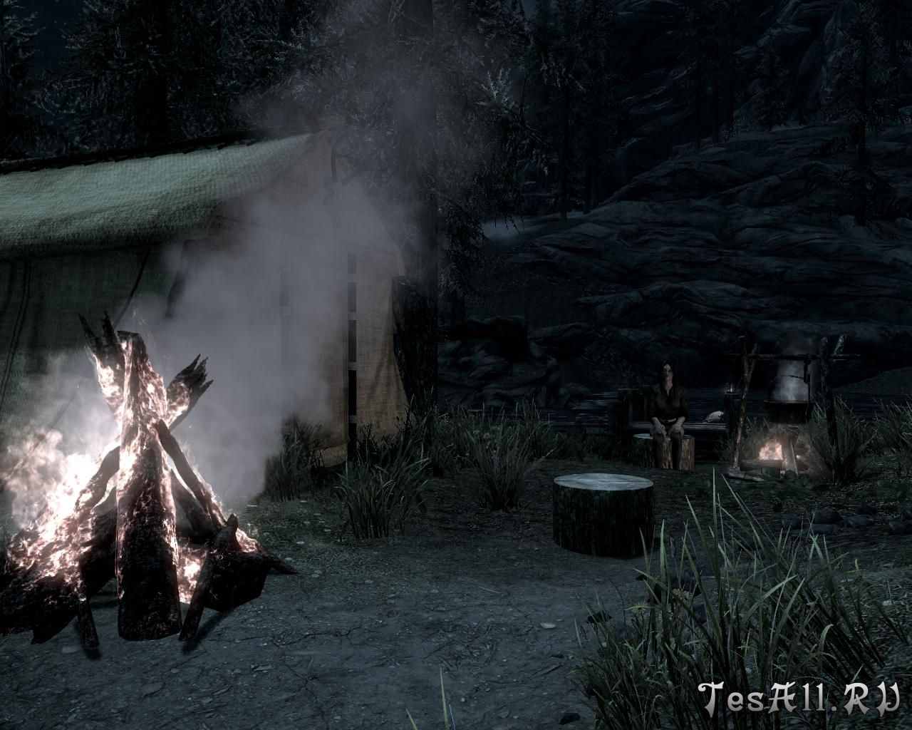 Так, на открытых просторах Скайрима места для сидения имеют вид пеньков. Маленький костер для приготовления пищи потребляет