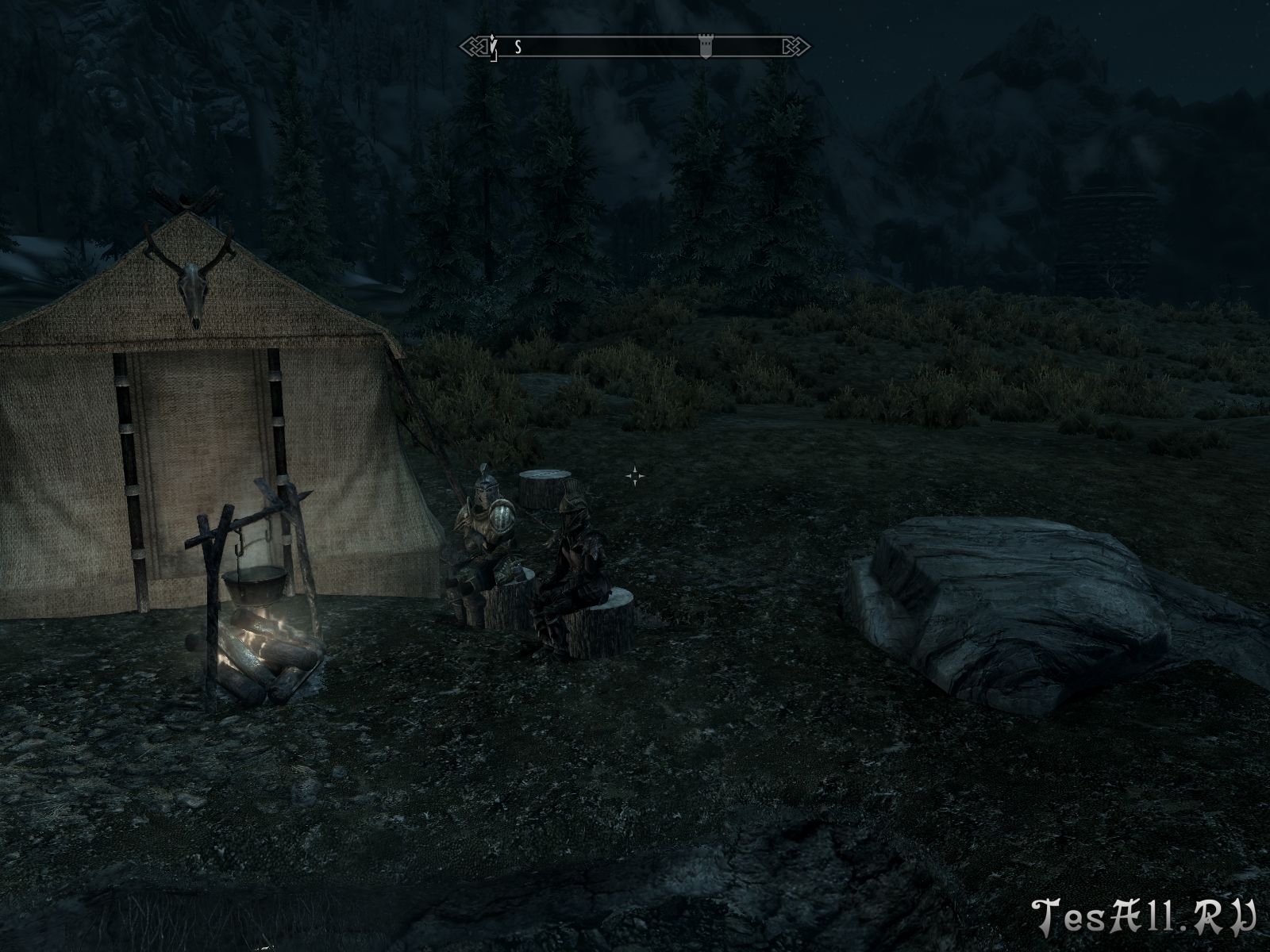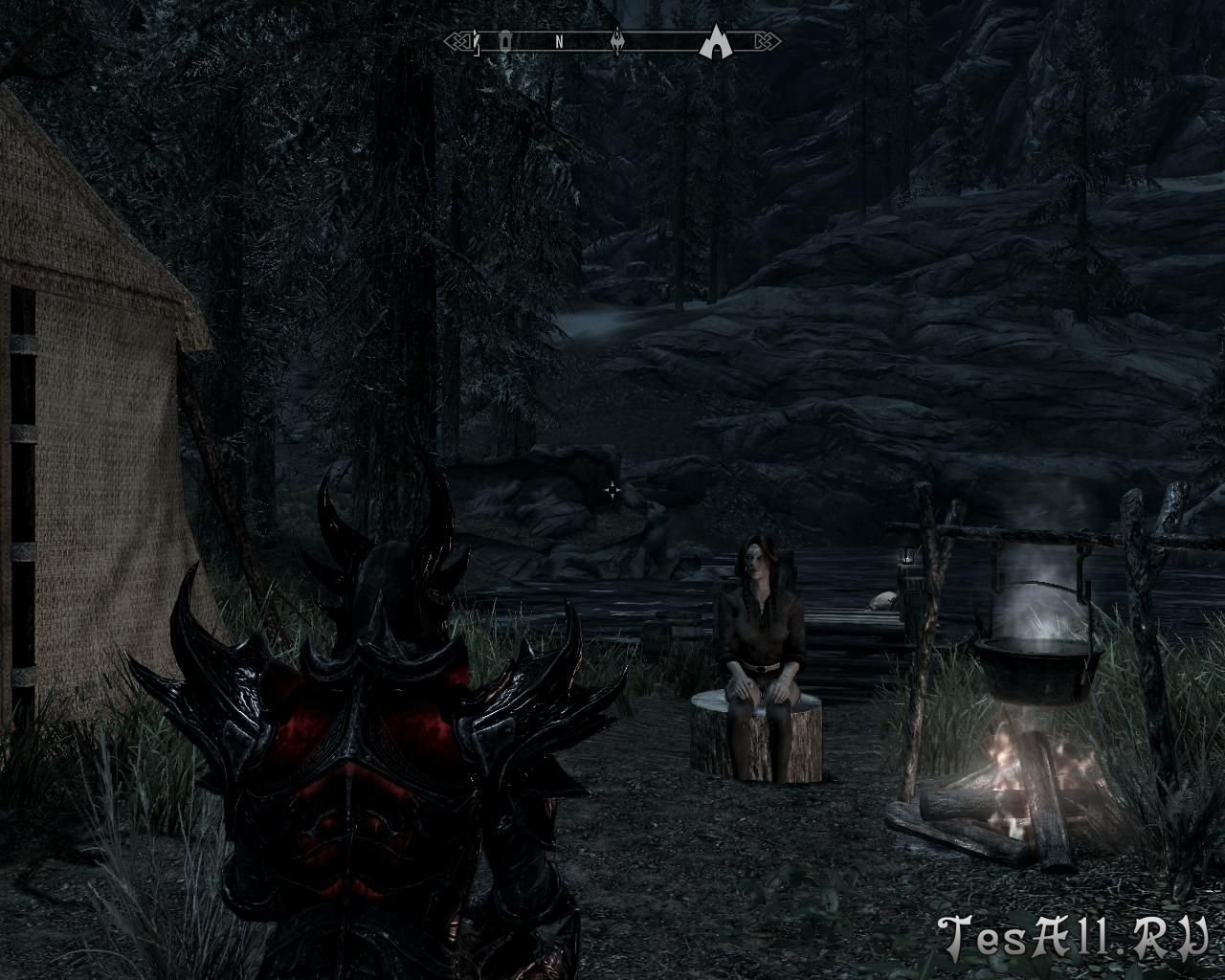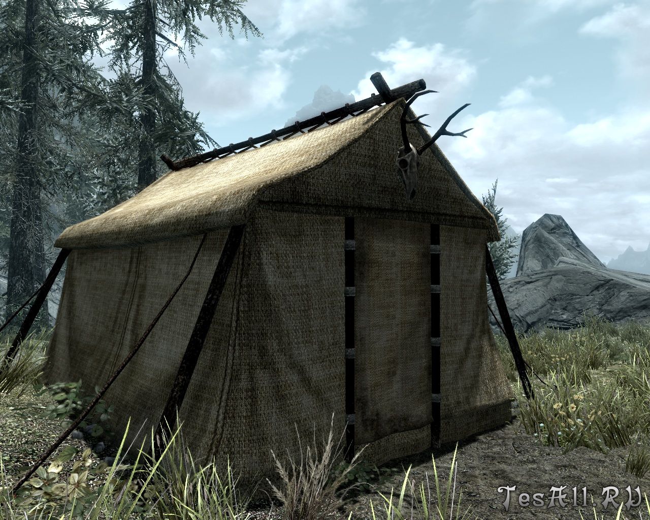 - просторная двухместная палатка, но не открытая, как привычно в Скайриме, а с интерьером (вы попадаете в помещение);