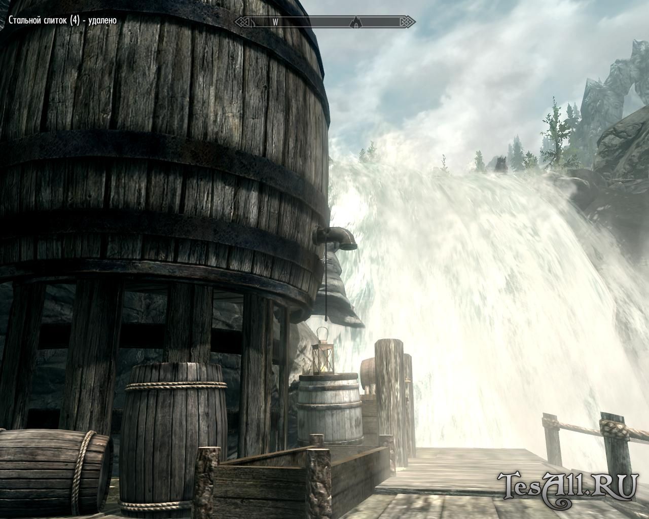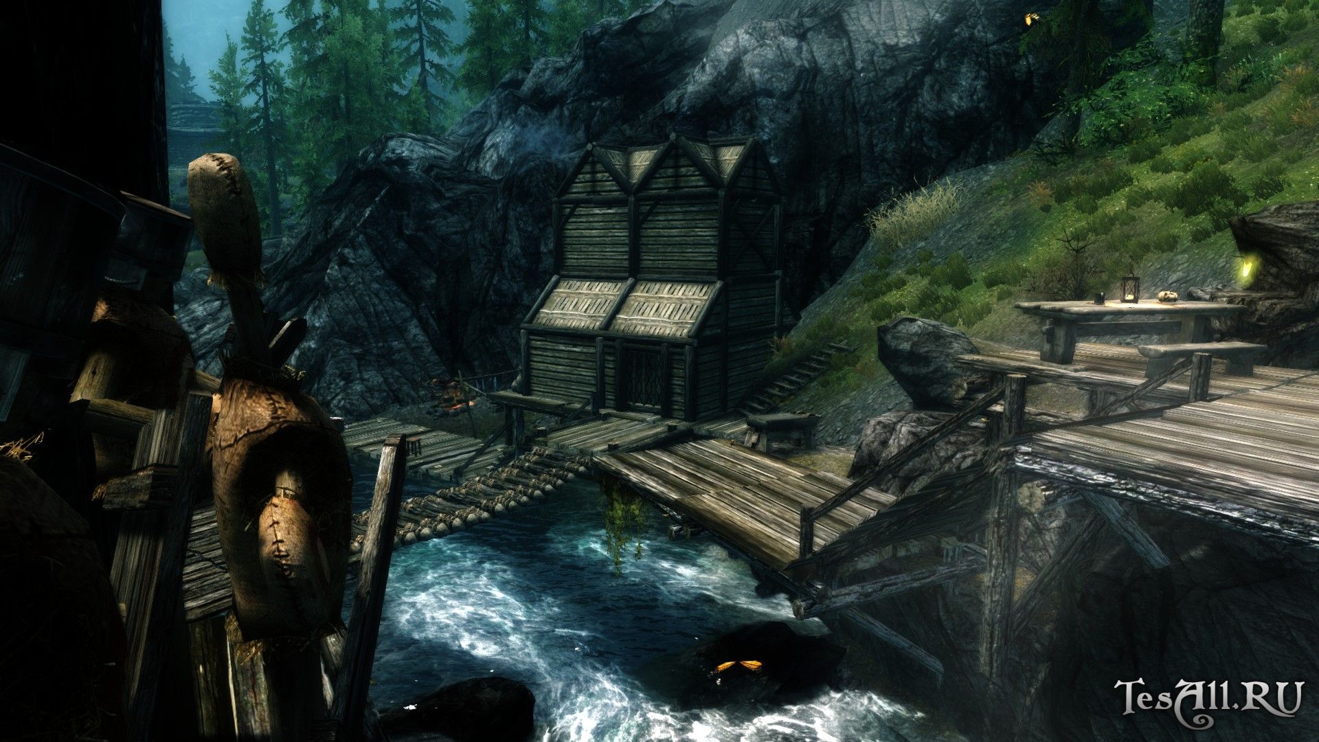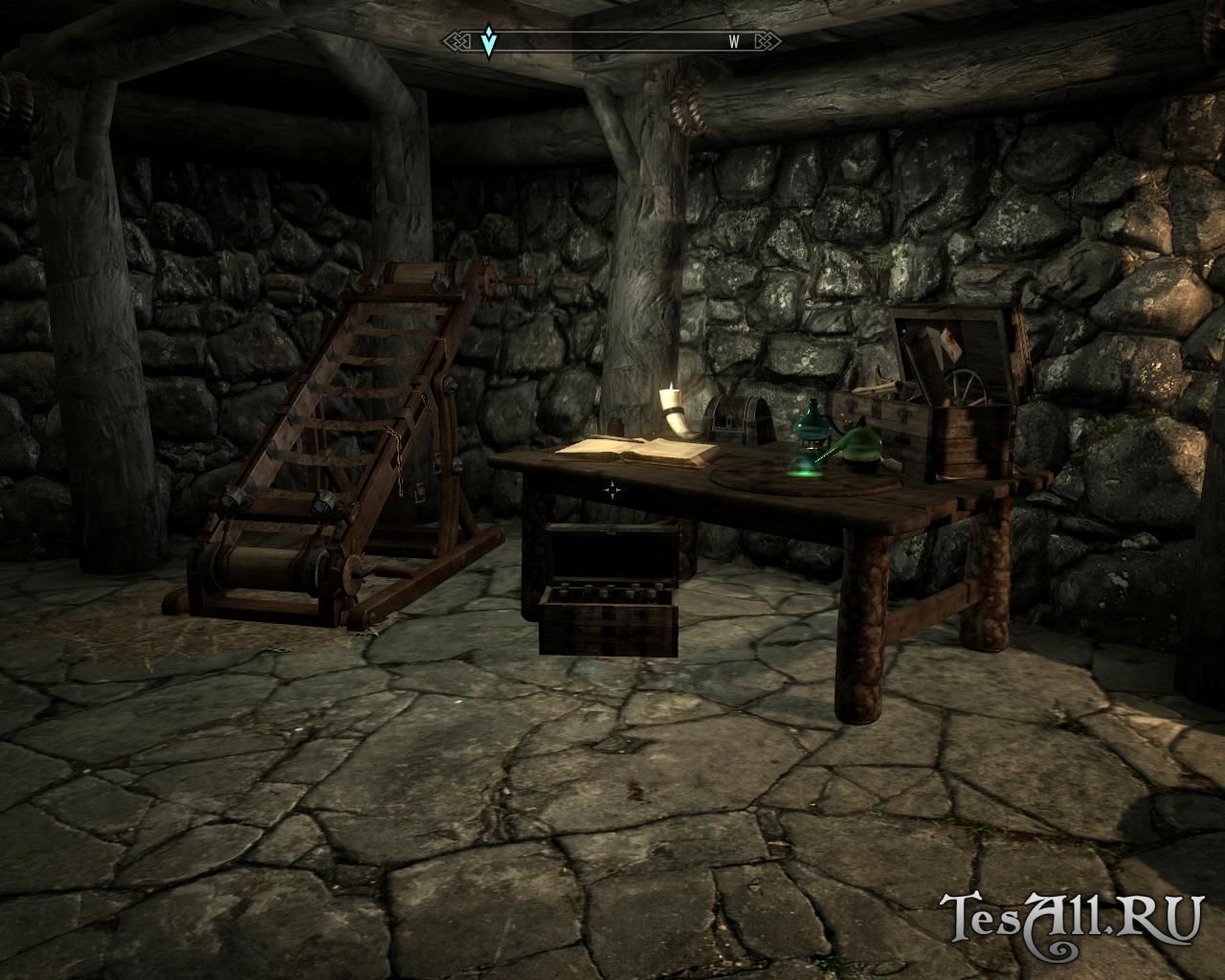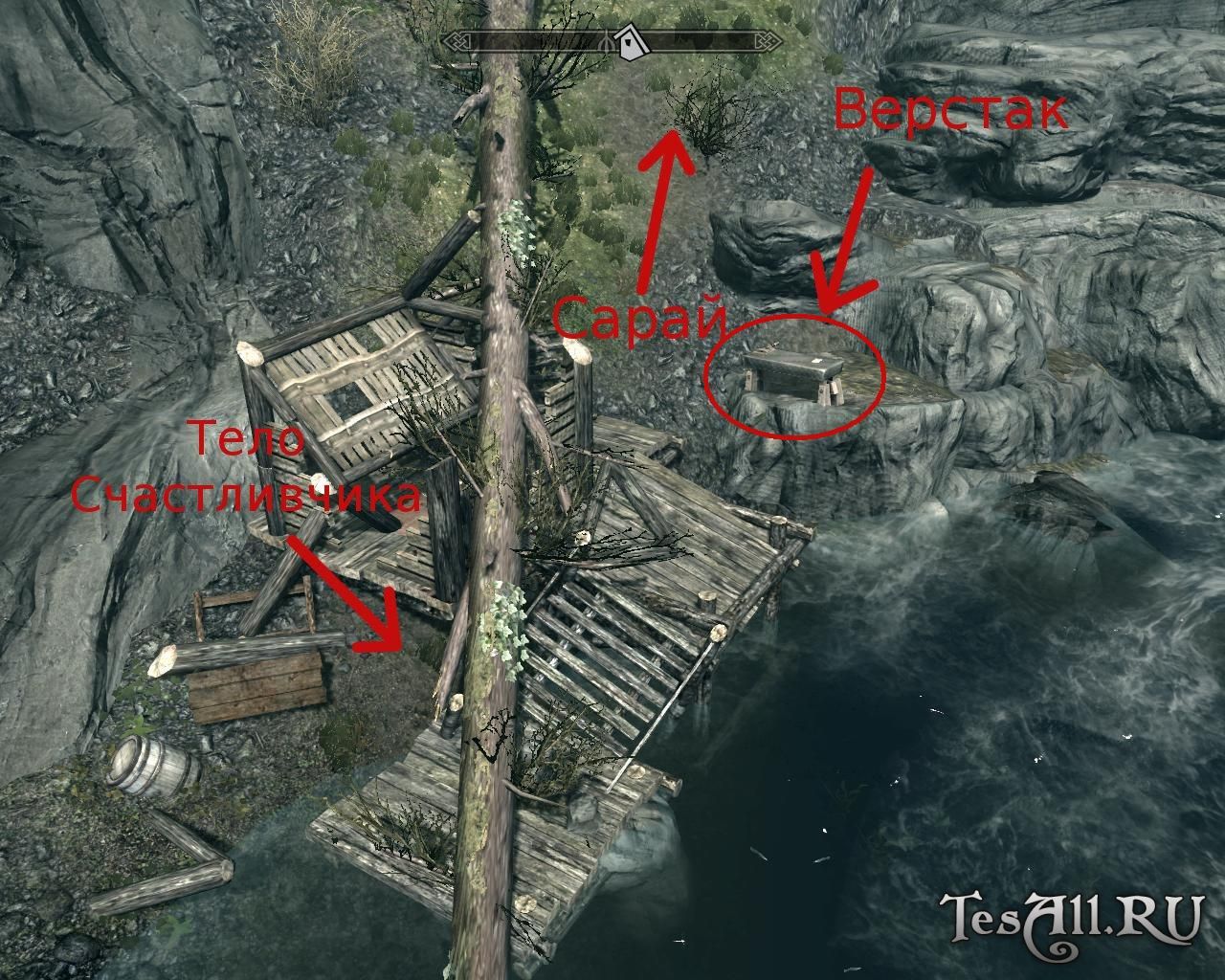 Для начала найдите разрушенную хижину, она находится к востоку от Вайтрана и к югу от Винтерхолда, невдалеке от Убежища Потерянный Нож (скриншот прилагается). Возле сломанной упавшим деревом хижины вы увидите и труп её бывшего хозяина. Сразу же осмотрите тело Счастливчика, у него есть карта сокровищ и ещё кое-какая добыча. Чуть выше вы можете найти сарай для дров — обратите внимание, он вам понадобится. В сарае есть нужная книжка — планы Счастливчика, из которых вы можете узнать, какие материалы и в каком количестве вам понадобятся для того или иного улучшения.