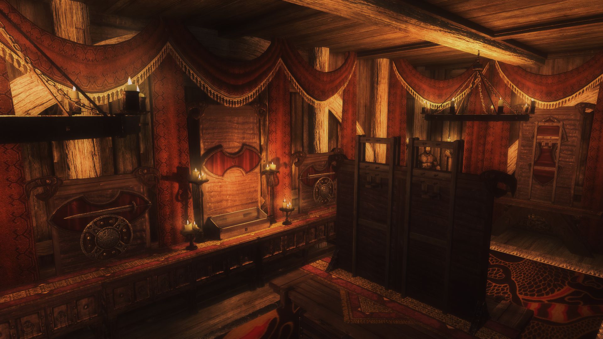 Уютненько :) ...первое что приходит в голову при посещении данной инсталляции. Удивительно, что такой в общем-то неплохой дом имеет так мало скачиваний :shok: , очевидно цена в 30000 монет отпугнула многих :lol ...стоит ли этот дом своих денег? Наверное нет. И их можно, наверное, и не тратить (если без квеста, впрочем не проверял). Все сделано со вкусом и вообщем довольно правильно (читай - удобно) :good: , мест для хранения барахла достаточно, причем они находятся на своих местах (читай - возле столов алх./зач. и зона кузницы). Наличие всех святилищ также приветствуется :good2: , хоть они и раскиданы по двум локациям. Книжных полок вполне достаточно, манекенов всего 3 но это не смертельно (повесим самое лучшее ;) ), стоек под оружие примерно штук 10-15, и одна средняя витрина (примерно под одноручный топор). В оружейной :paladin: довольно интересные "комбинированные" щиты под оружие, плюс несколько щитов по дому под щиты/оружие (ссори за каламбур). Кровать честно отрабатывает свои 10%. Тупичок имеет две двери и небольшой милый фонтанчик.